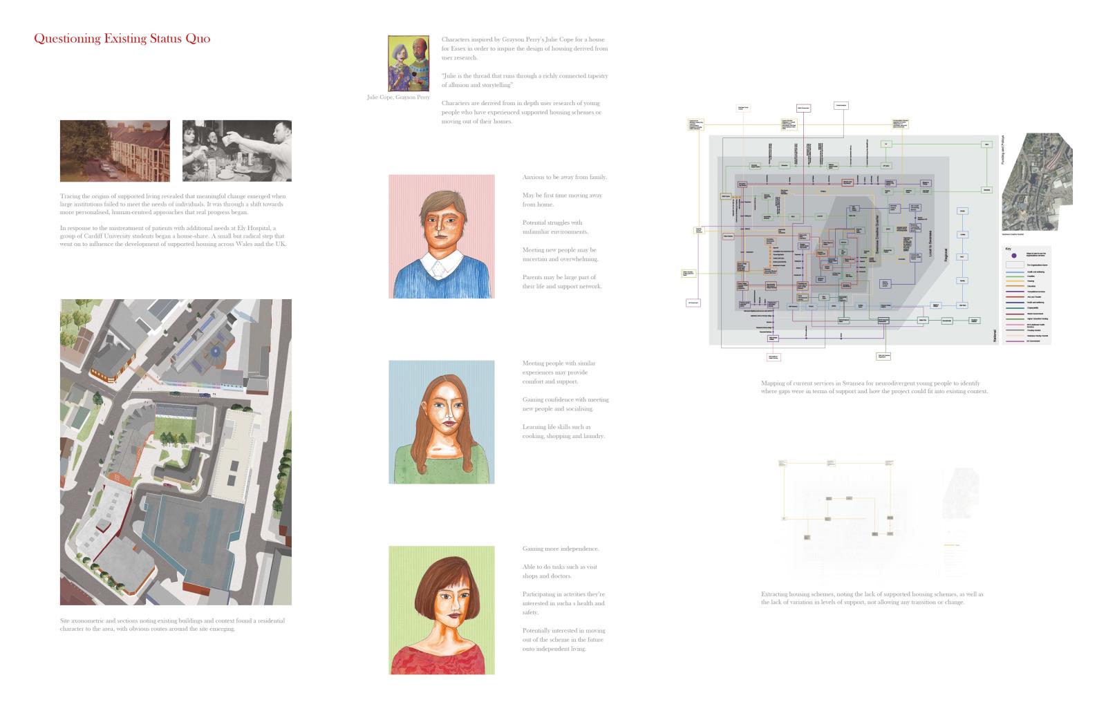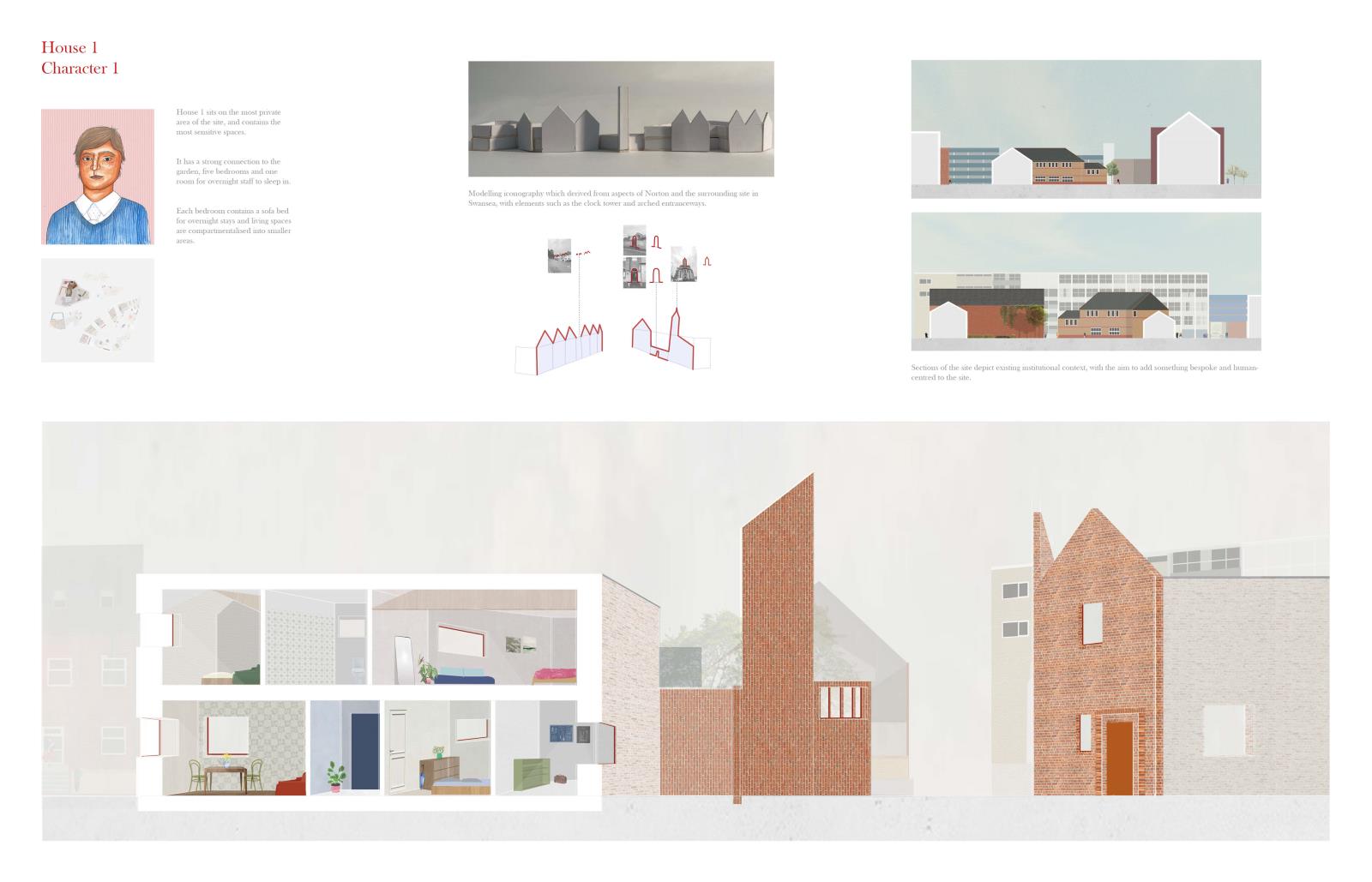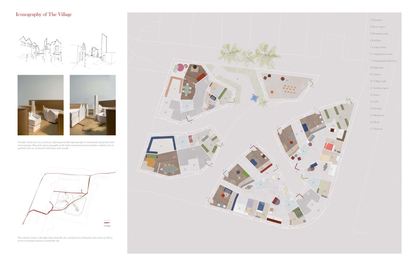 The project acts as a village of support, centring the young person and drawing on neighbourhood-inspired spatial organisations from Kinderspital by Herzog & de Meuron. Fictional characters, shaped by the individuality of neurodivergent people, drive spatial and social designs, creating a network of homes and services where young people can develop skills and independence in a supported environment.