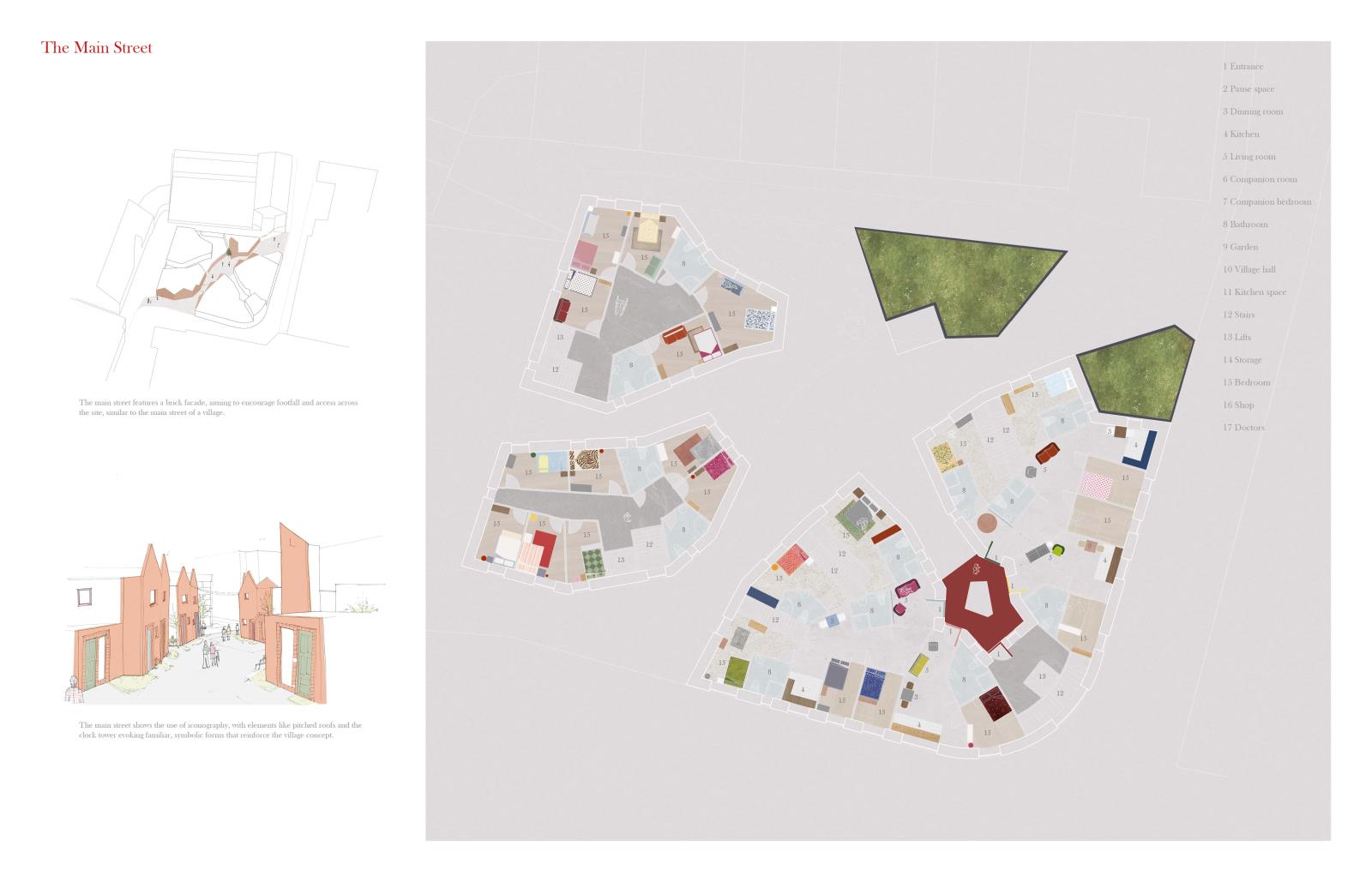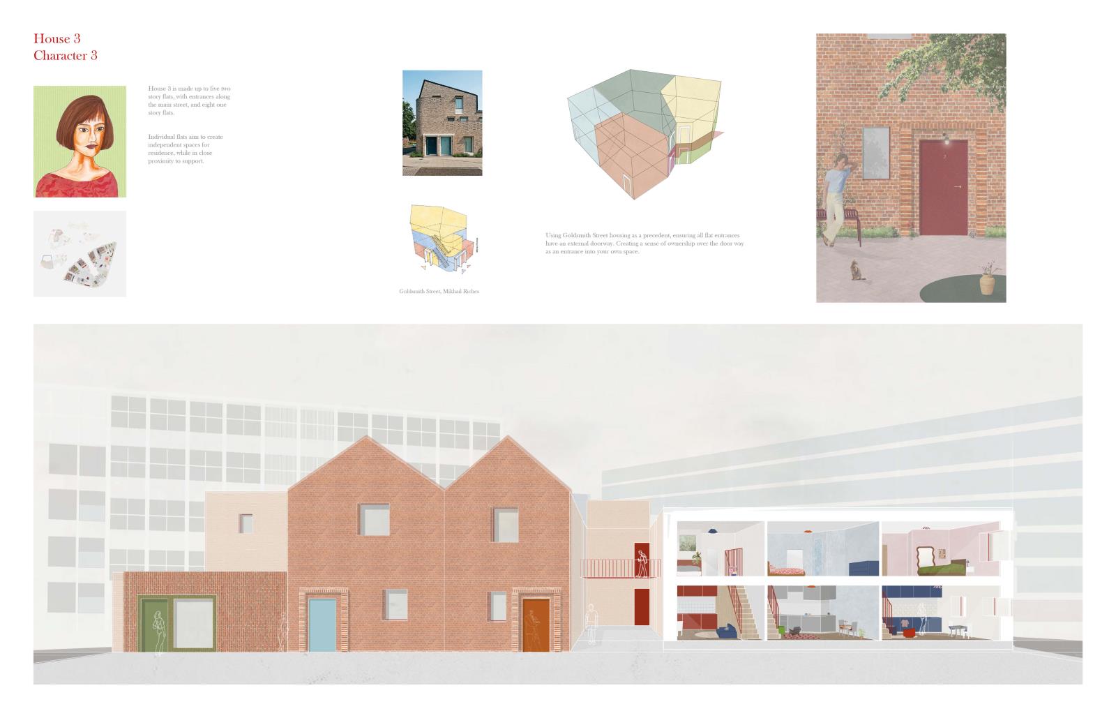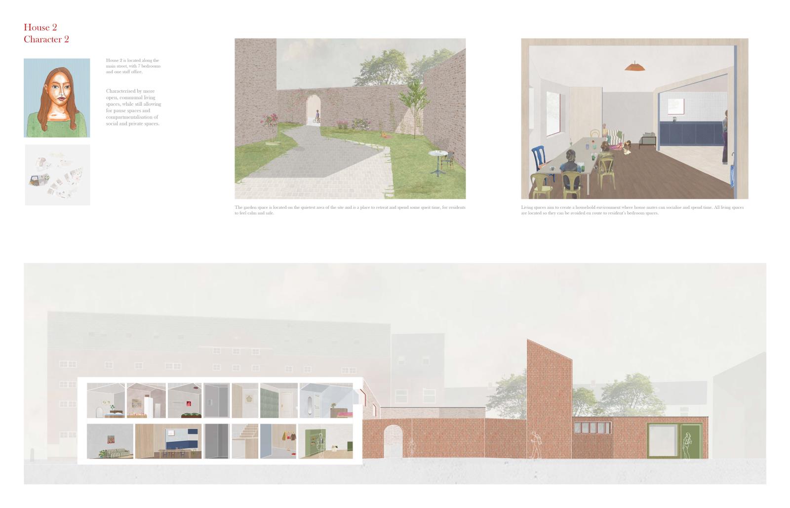 The project acts as a village of support, centring the young person and drawing on neighbourhood-inspired spatial organisations from Kinderspital by Herzog & de Meuron. Fictional characters, shaped by the individuality of neurodivergent people, drive spatial and social designs, creating a network of homes and services where young people can develop skills and independence in a supported environment.
