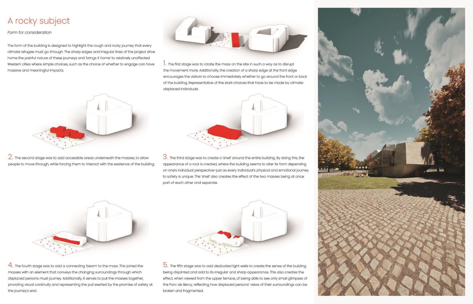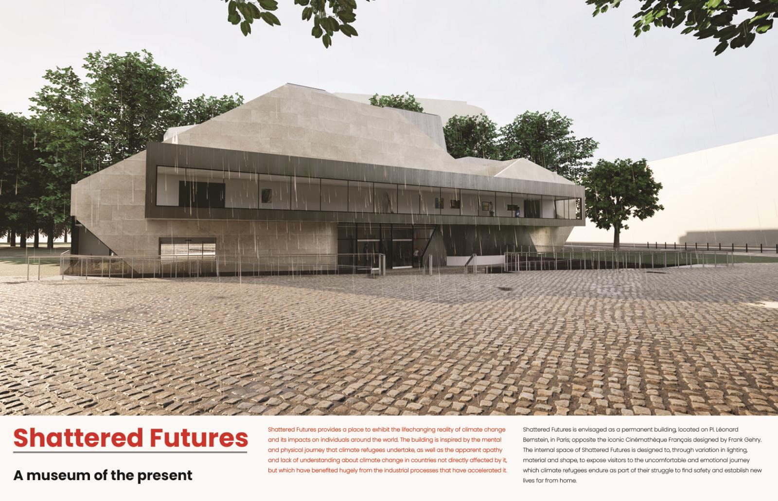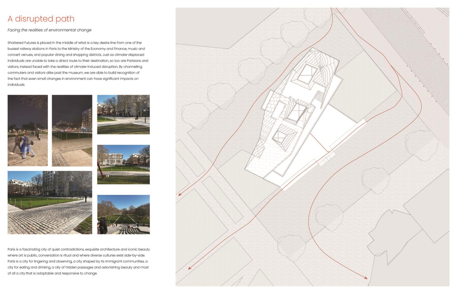 The long journey from climate catastrophe to new beginnings is one of upheaval and uncertainty before the hope of a new life. Shattered Futures emulates this journey through its design by taking visitors by surprise, initially as a result of its location, and then when exploring the building, through spaces that are initially disjointed and uncomfortable, before emerging into light-filled atriums and open terraces that welcome the visitor into the heart of Paris.