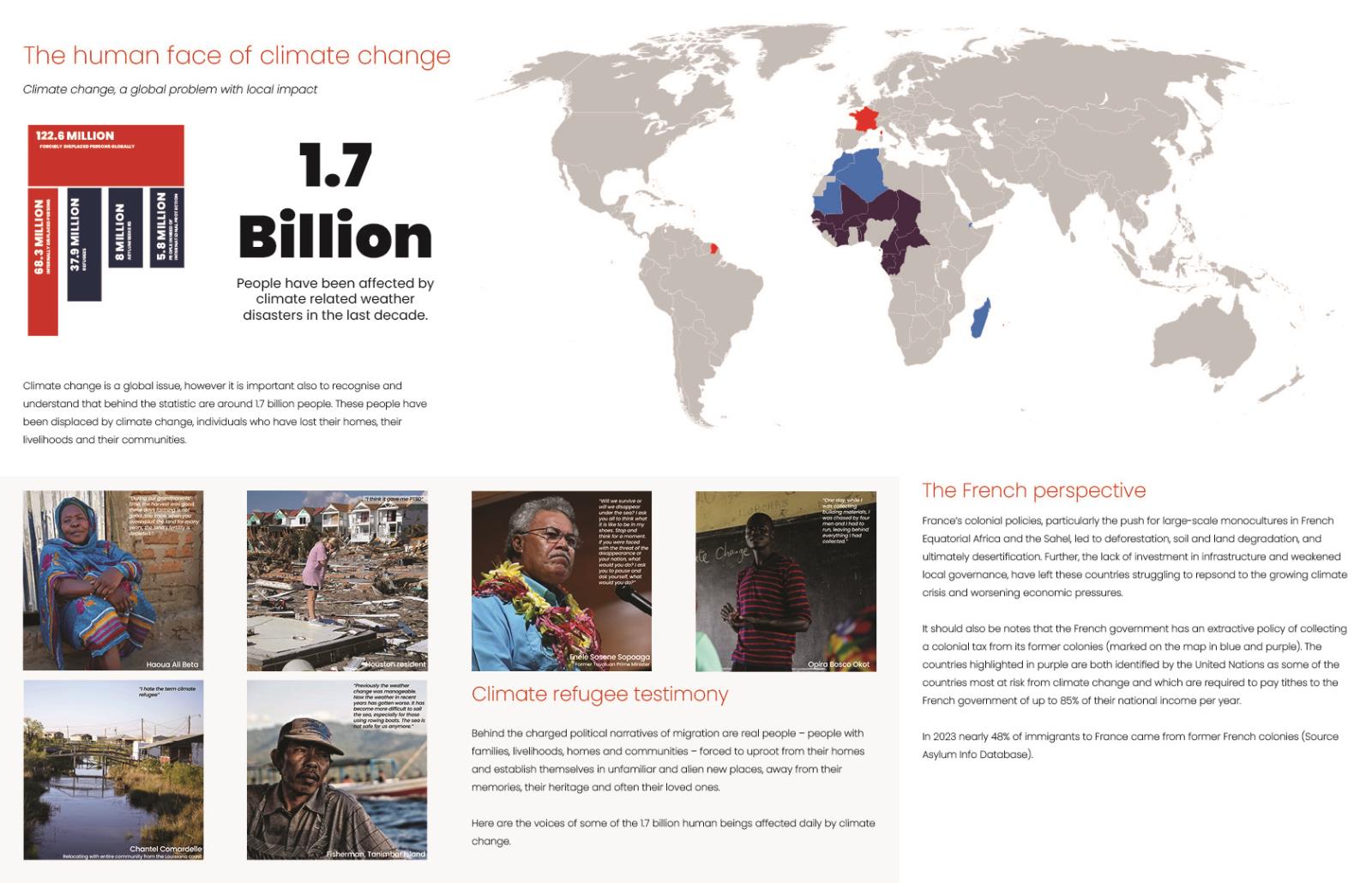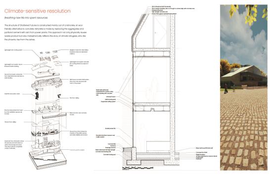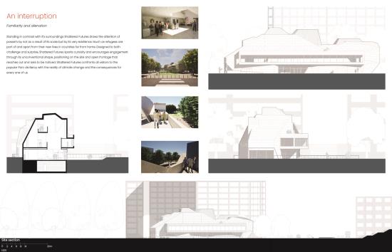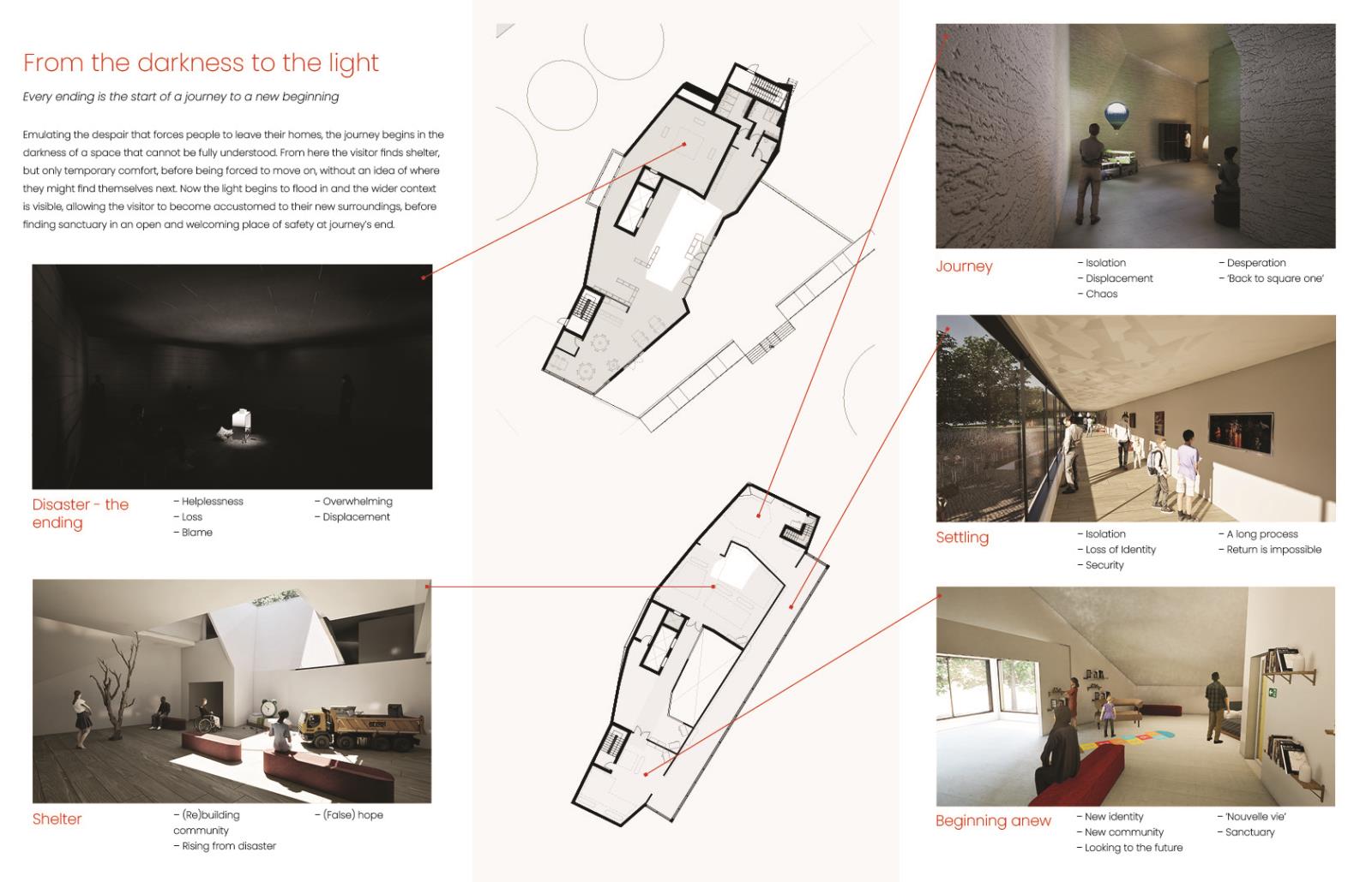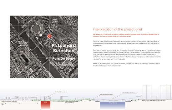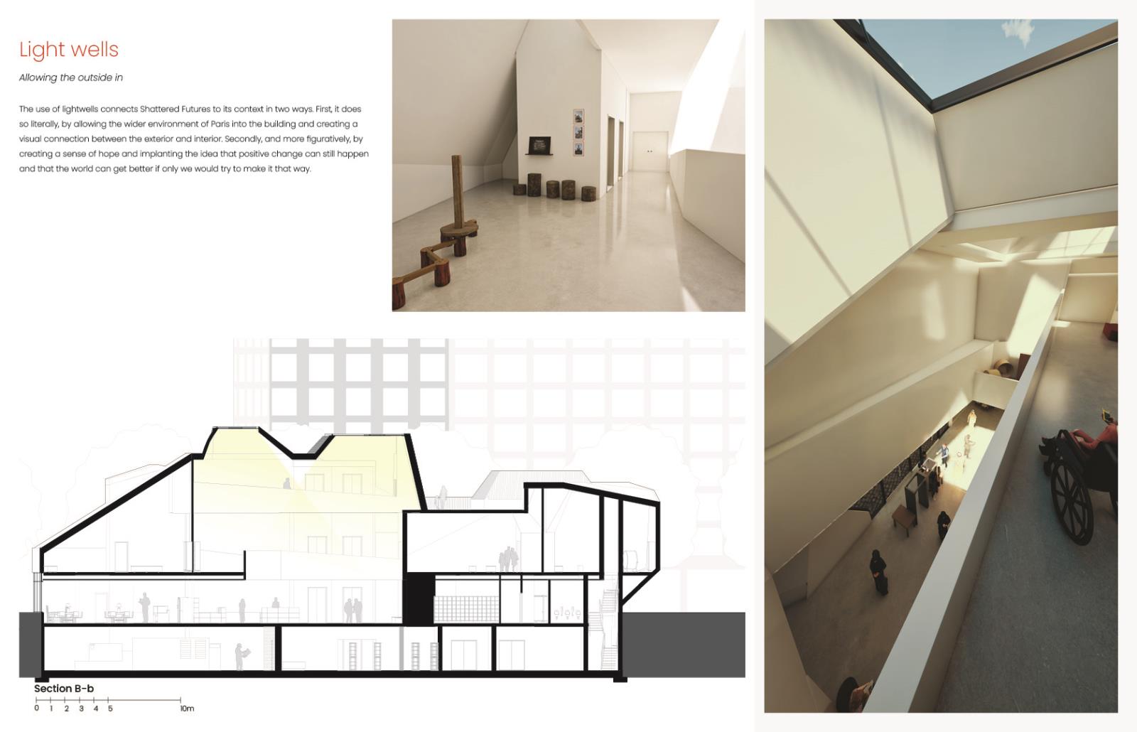 The long journey from climate catastrophe to new beginnings is one of upheaval and uncertainty before the hope of a new life. Shattered Futures emulates this journey through its design by taking visitors by surprise, initially as a result of its location, and then when exploring the building, through spaces that are initially disjointed and uncomfortable, before emerging into light-filled atriums and open terraces that welcome the visitor into the heart of Paris.