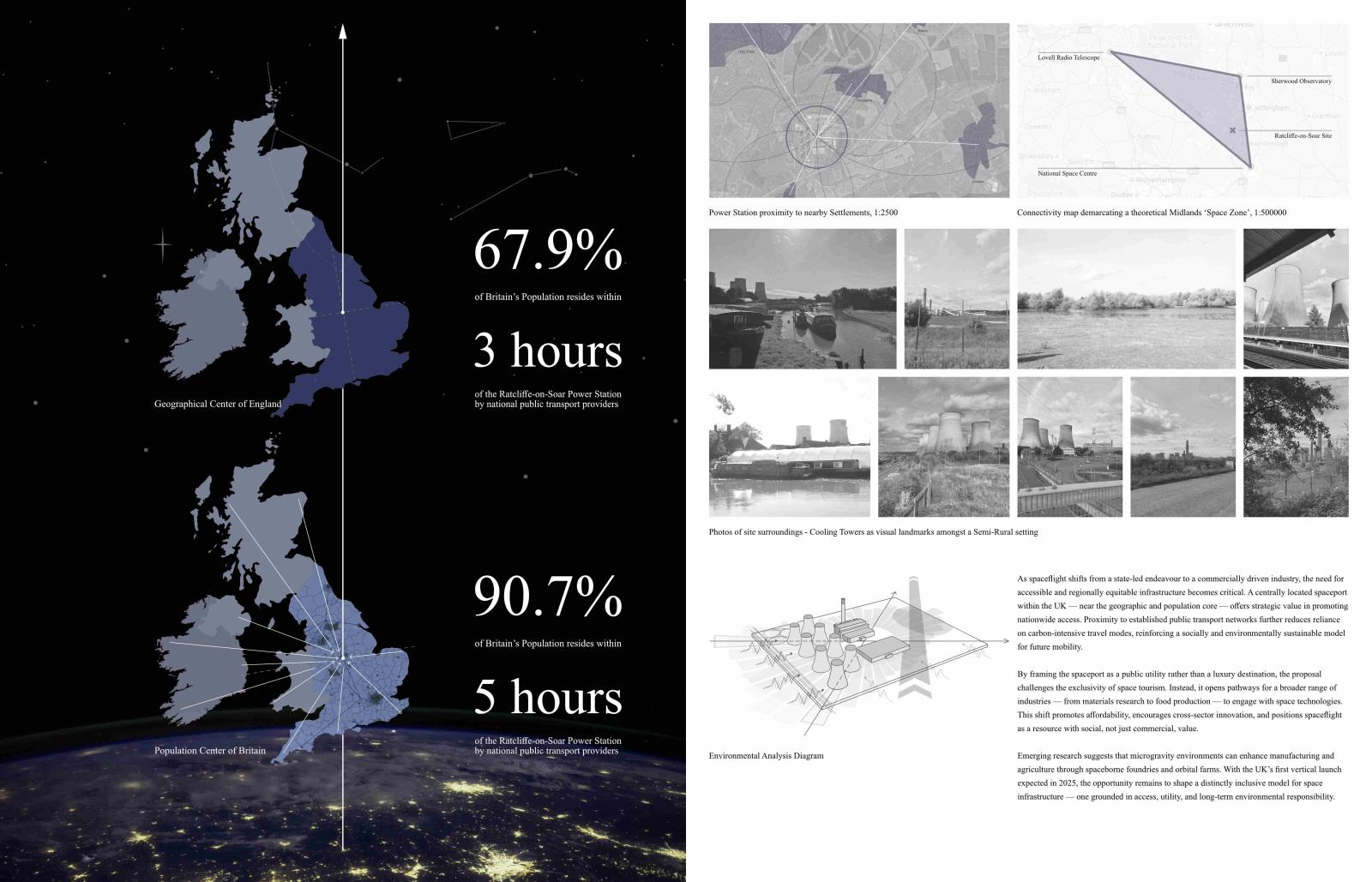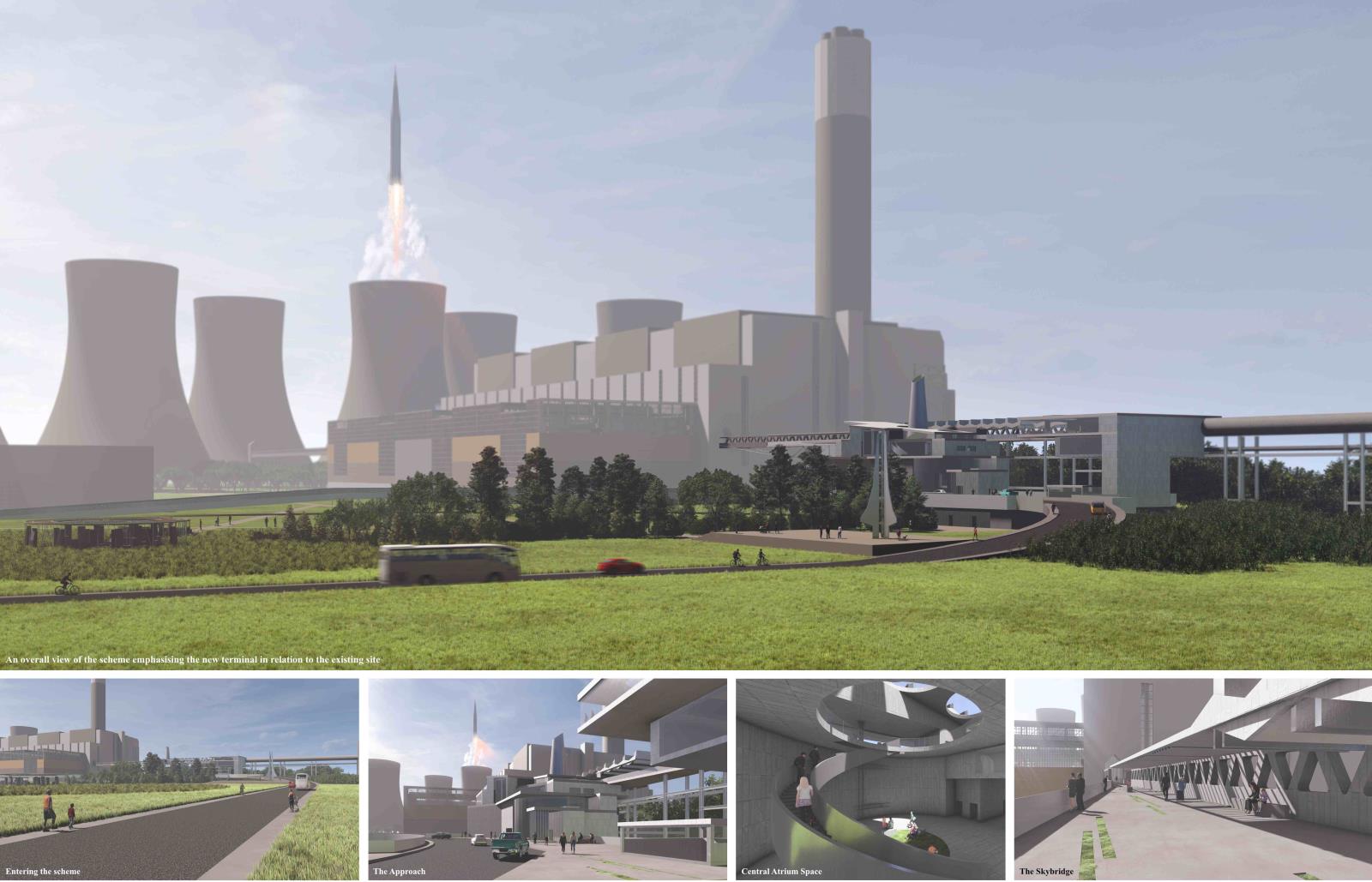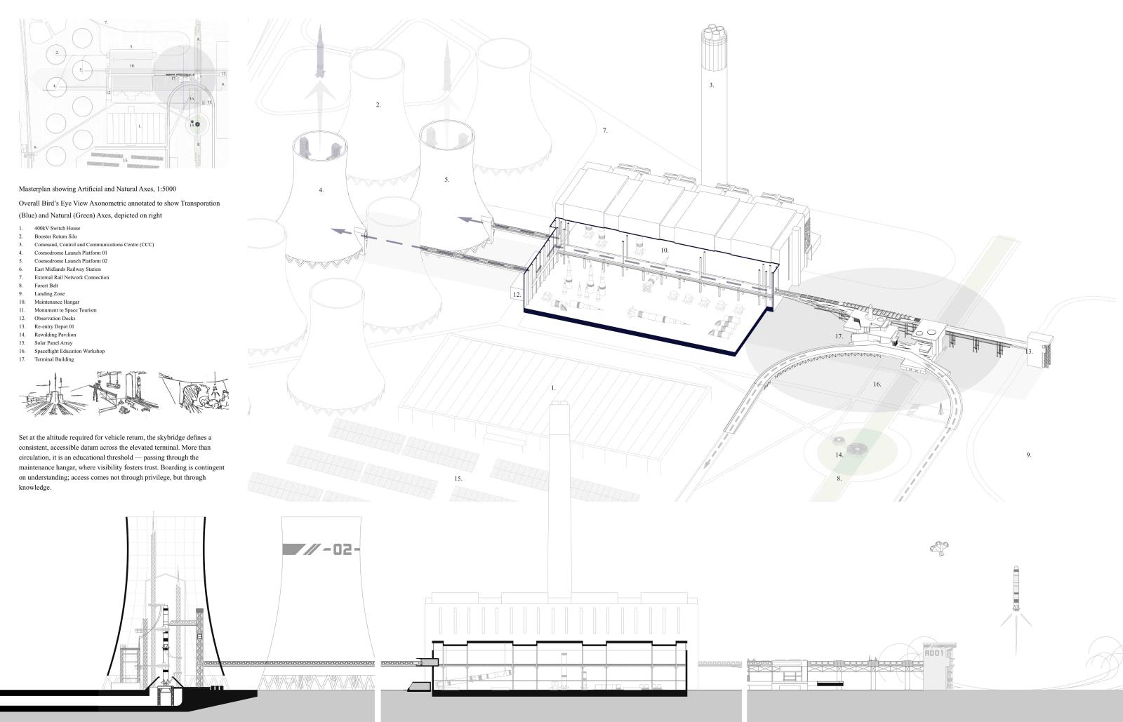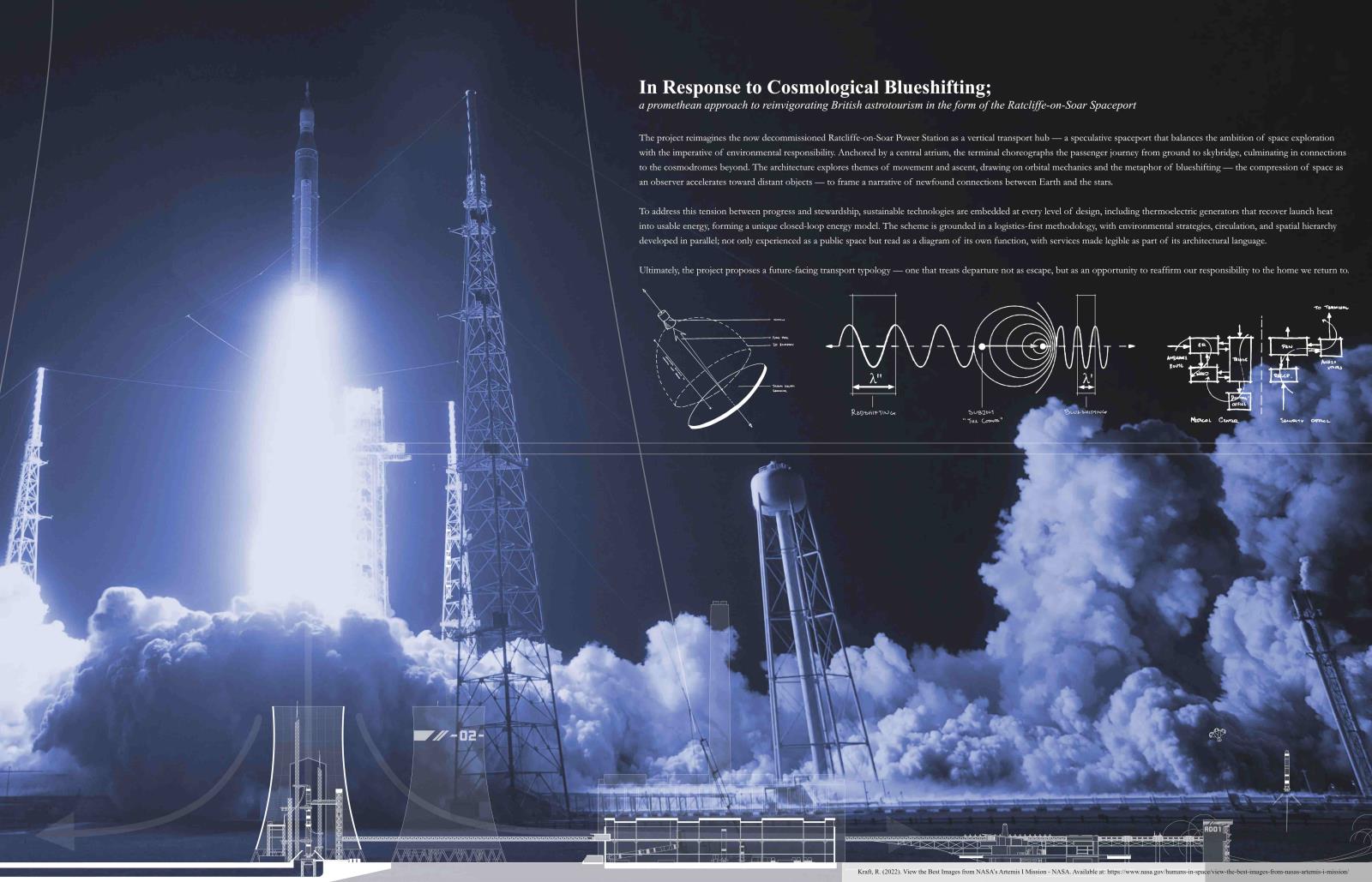 In Response to Cosmological Blueshifting: A promethean approach to reinvigorating British astrotourism in the form of the Ratcliffe-on-Soar spaceport Part 1 Project 2025 Kieran Joshua Lim University of Nottingham Nottingham | UK In Response to Cosmological Blueshifting reimagines the decommissioned Ratcliffe-on-Soar Power Station as a vertical transport hub — a speculative spaceport that balances the ambition of space exploration with the imperative of environmental responsibility. Anchored by a central atrium, the terminal choreographs the passenger journey from ground to skybridge, culminating in connections to the cosmodromes beyond. The architecture explores themes of movement and ascent, drawing on orbital mechanics and the metaphor of blueshifting — the compression of space as an observer accelerates toward distant objects — to frame a narrative of newfound connections between Earth and the stars.To address this tension between progress and stewardship, sustainable technologies are embedded at every level of design, including thermoelectric generators that recover launch heat into usable energy, forming a unique closed-loop energy model. The scheme is grounded in a logistics-first methodology, with environmental strategies, circulation, and spatial hierarchy developed in parallel; not only experienced as a public space but read as a diagram of its own function, with services made legible as part of its architectural language.Ultimately, the project proposes a future-facing transport typology — one that treats departure not as escape, but as an opportunity to reaffirm our responsibility to the home we return to. Tutor(s) Margaret Mulcahy Charlie Simpson