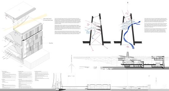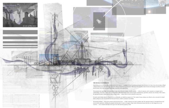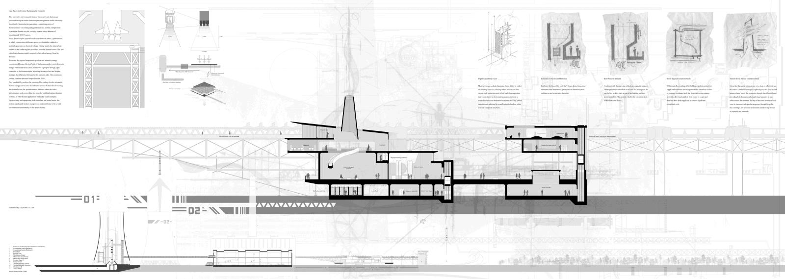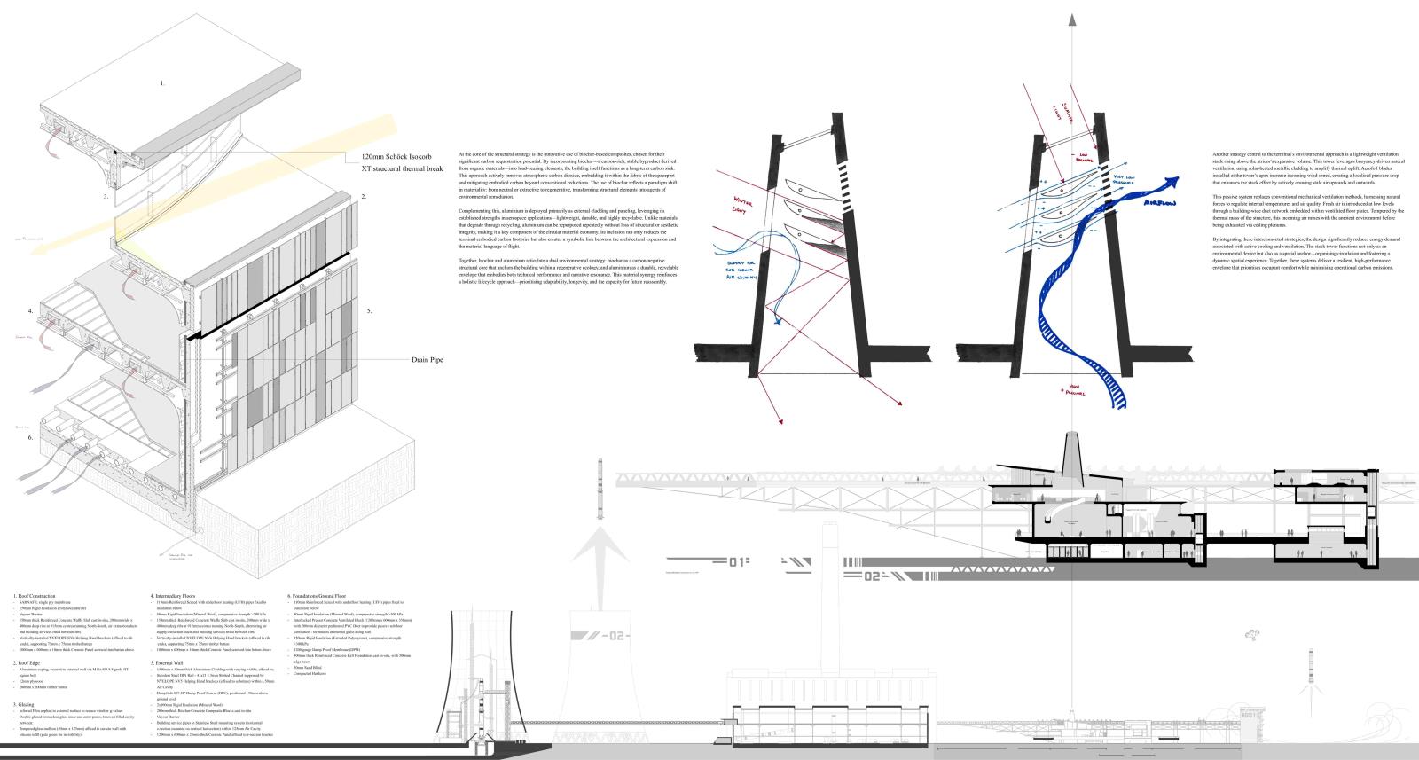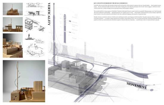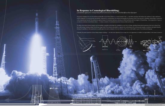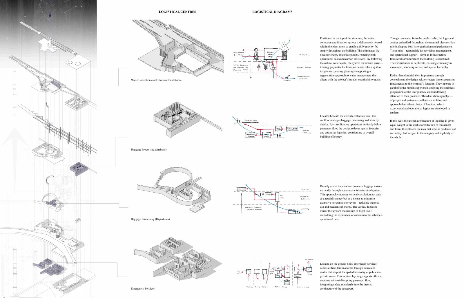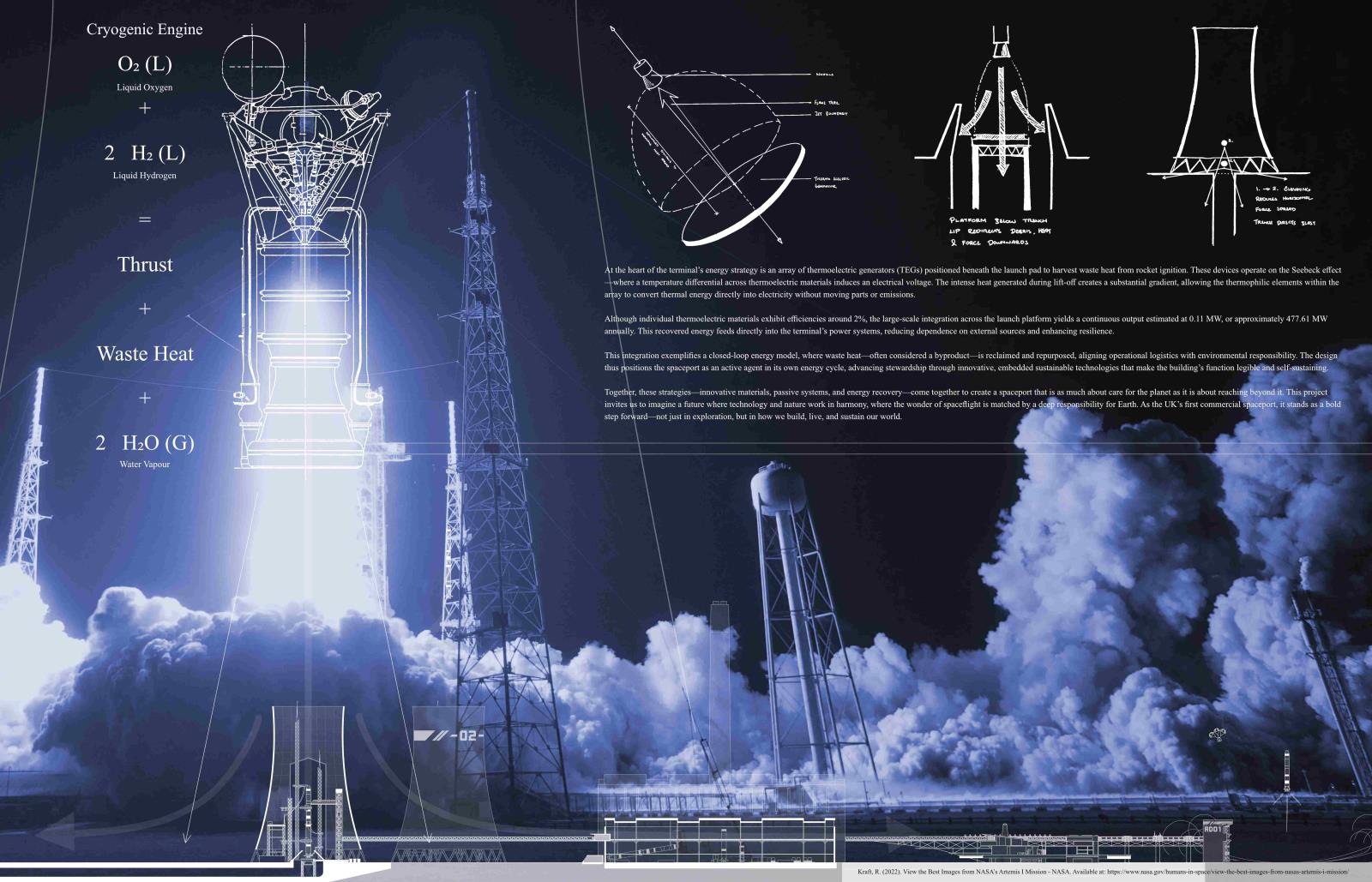 In Response to Cosmological Blueshifting: A promethean approach to reinvigorating British astrotourism in the form of the Ratcliffe-on-Soar spaceport Part 1 Project 2025 Kieran Joshua Lim University of Nottingham Nottingham | UK In Response to Cosmological Blueshifting reimagines the decommissioned Ratcliffe-on-Soar Power Station as a vertical transport hub — a speculative spaceport that balances the ambition of space exploration with the imperative of environmental responsibility. Anchored by a central atrium, the terminal choreographs the passenger journey from ground to skybridge, culminating in connections to the cosmodromes beyond. The architecture explores themes of movement and ascent, drawing on orbital mechanics and the metaphor of blueshifting — the compression of space as an observer accelerates toward distant objects — to frame a narrative of newfound connections between Earth and the stars.To address this tension between progress and stewardship, sustainable technologies are embedded at every level of design, including thermoelectric generators that recover launch heat into usable energy, forming a unique closed-loop energy model. The scheme is grounded in a logistics-first methodology, with environmental strategies, circulation, and spatial hierarchy developed in parallel; not only experienced as a public space but read as a diagram of its own function, with services made legible as part of its architectural language.Ultimately, the project proposes a future-facing transport typology — one that treats departure not as escape, but as an opportunity to reaffirm our responsibility to the home we return to. Tutor(s) Margaret Mulcahy Charlie Simpson