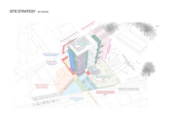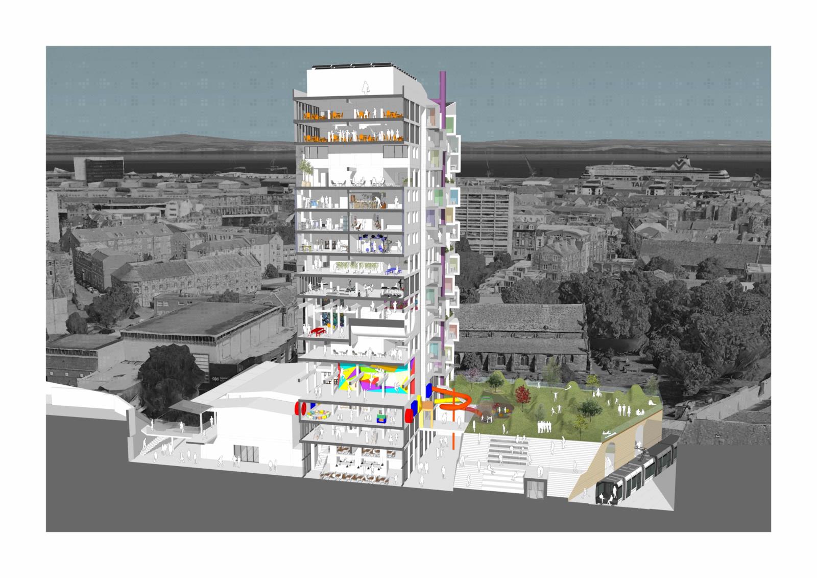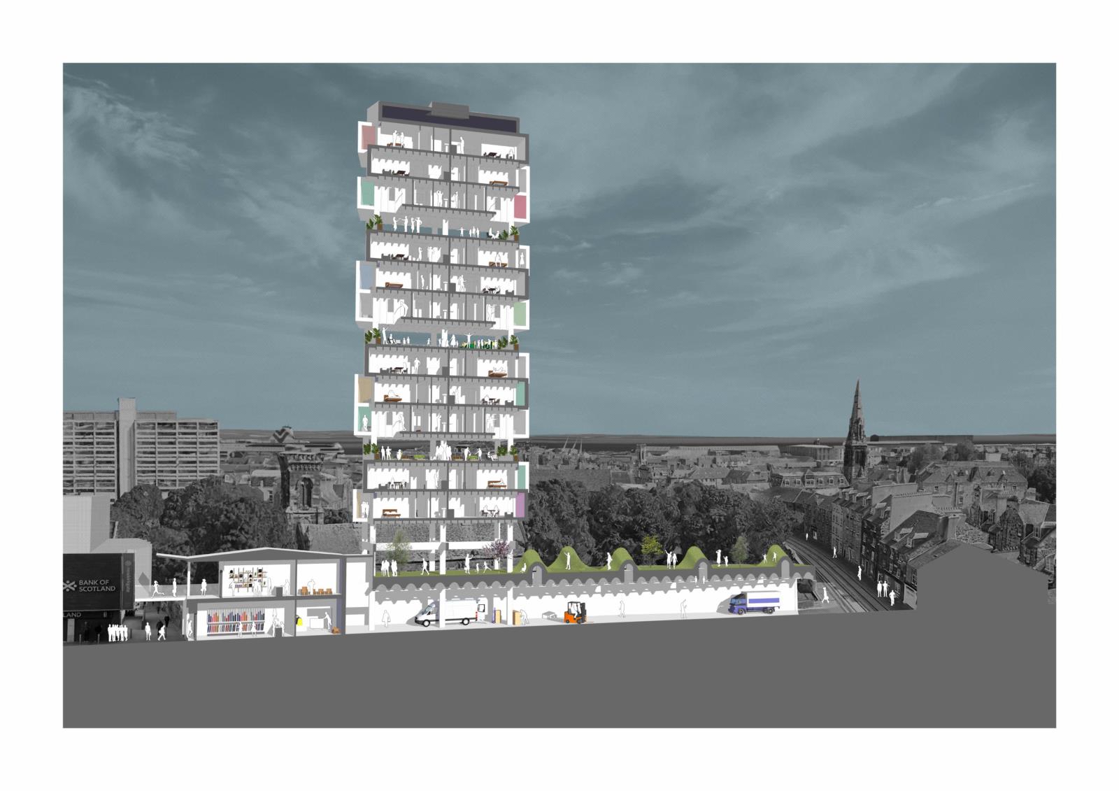 The site is in Leith, Edinburgh’s port, and adjacent to a pedestrianised shopping area and a 17-storey residential tower; an apt location to explore the High-Rise brief. Once a diverse and popular destination, the ‘Foot of the Walk’ is now mediocre, and the tram stop uninviting.