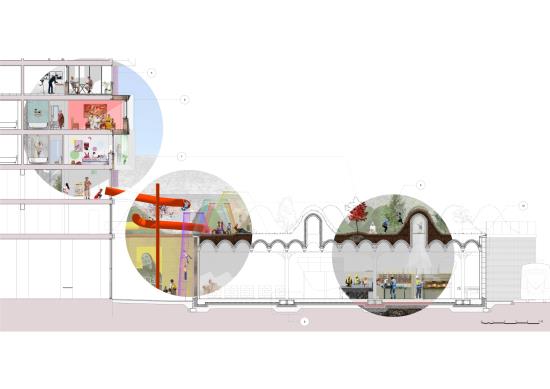 Play / Utility: The factory roof is also a sculpted garden for children to explore. The climbing wall conceals a fire escape and the purple chimneys intermingle with the coloured chutes and tunnels.