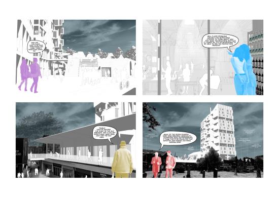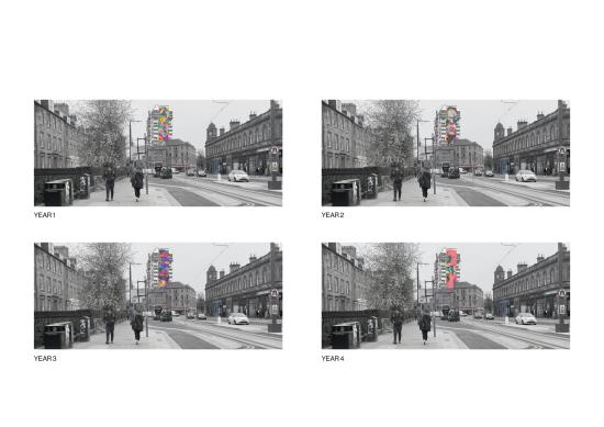 Independence / Connectedness: Leith’s culture of making is re-established and celebrated through a public-facing bottle factory. Connectedness to Edinburgh is enhanced by overhauling the tram stop; forming a public square and thoroughfare. The vast climbing wall doubles as a canvas for local artists to enliven the city skyline.