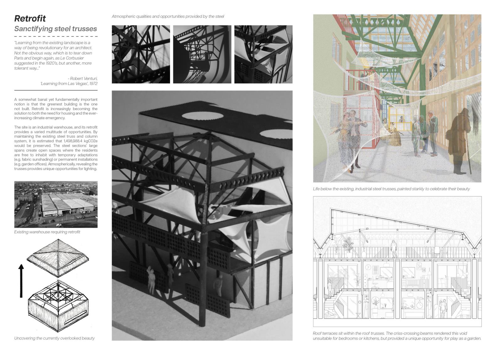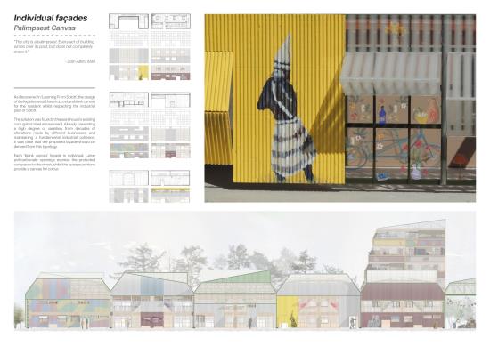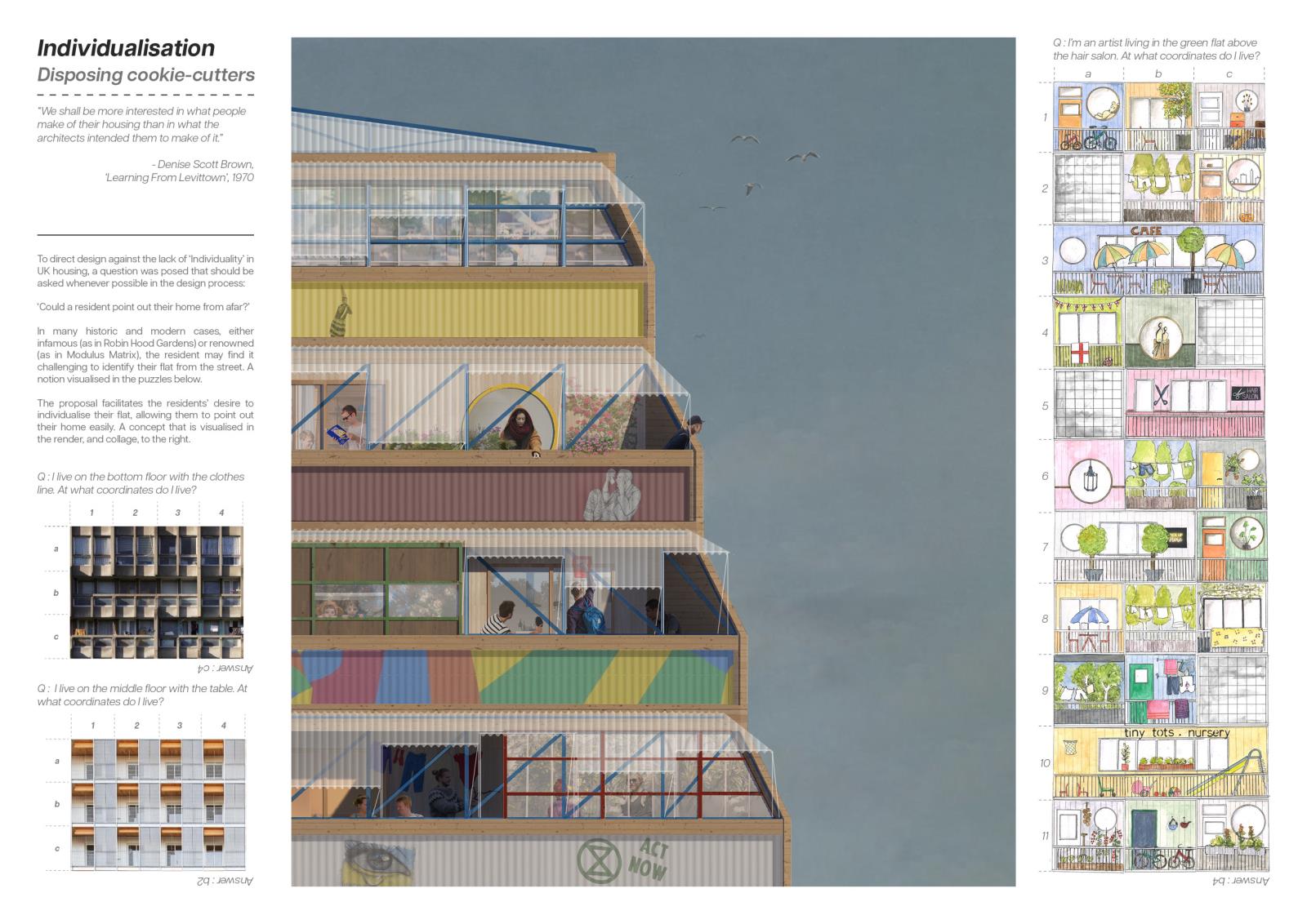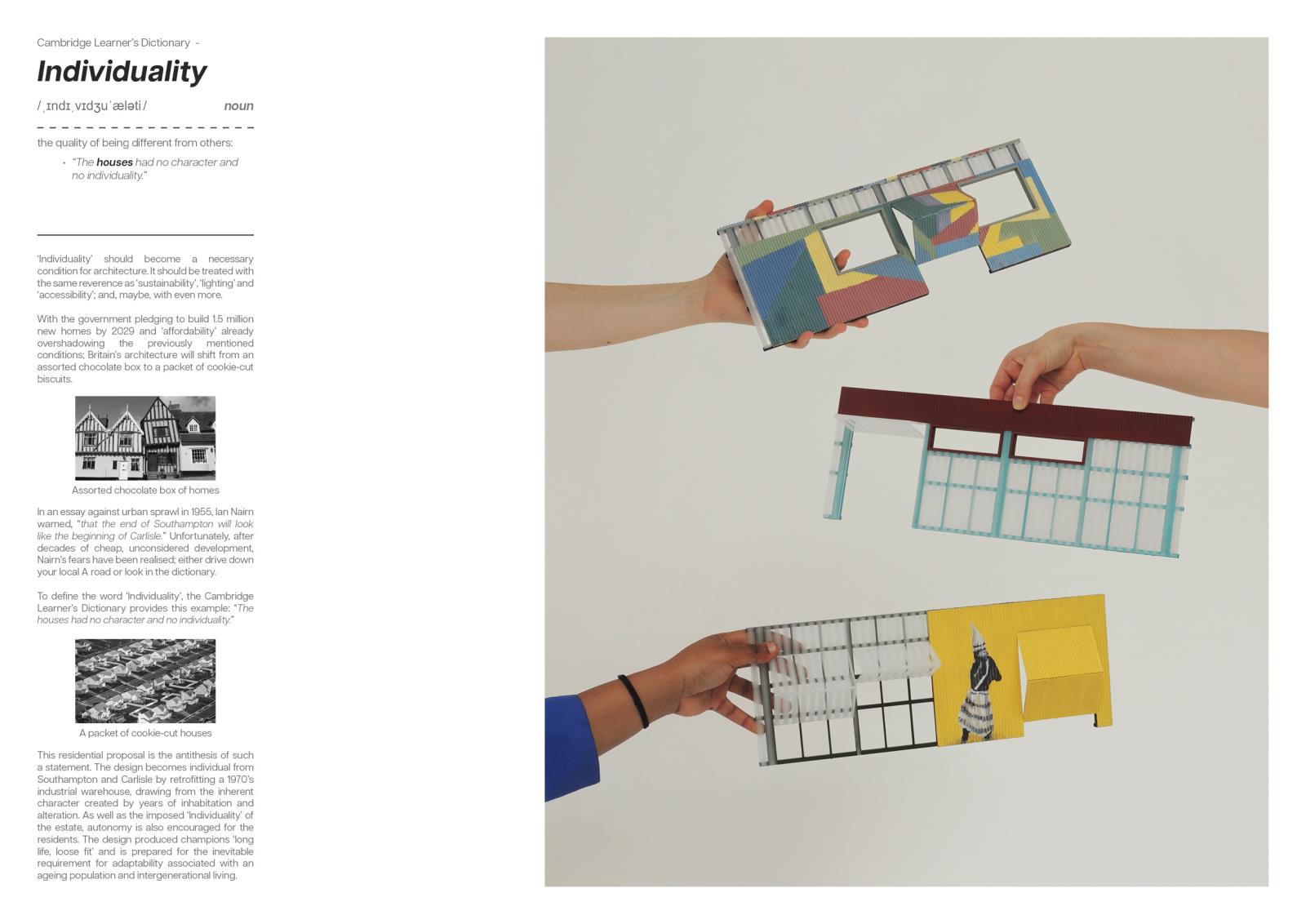 This residential proposal is the antithesis of such a statement. The design becomes individual from Southampton and Carlisle by retrofitting a 1970’s industrial warehouse, drawing from the inherent character created by years of inhabitation and alteration. As well as the imposed ‘Individuality’ of the estate, resident adaptations are also encouraged. The