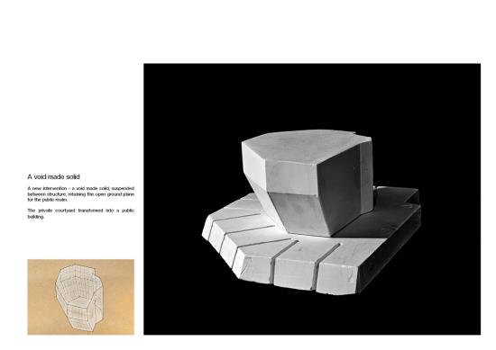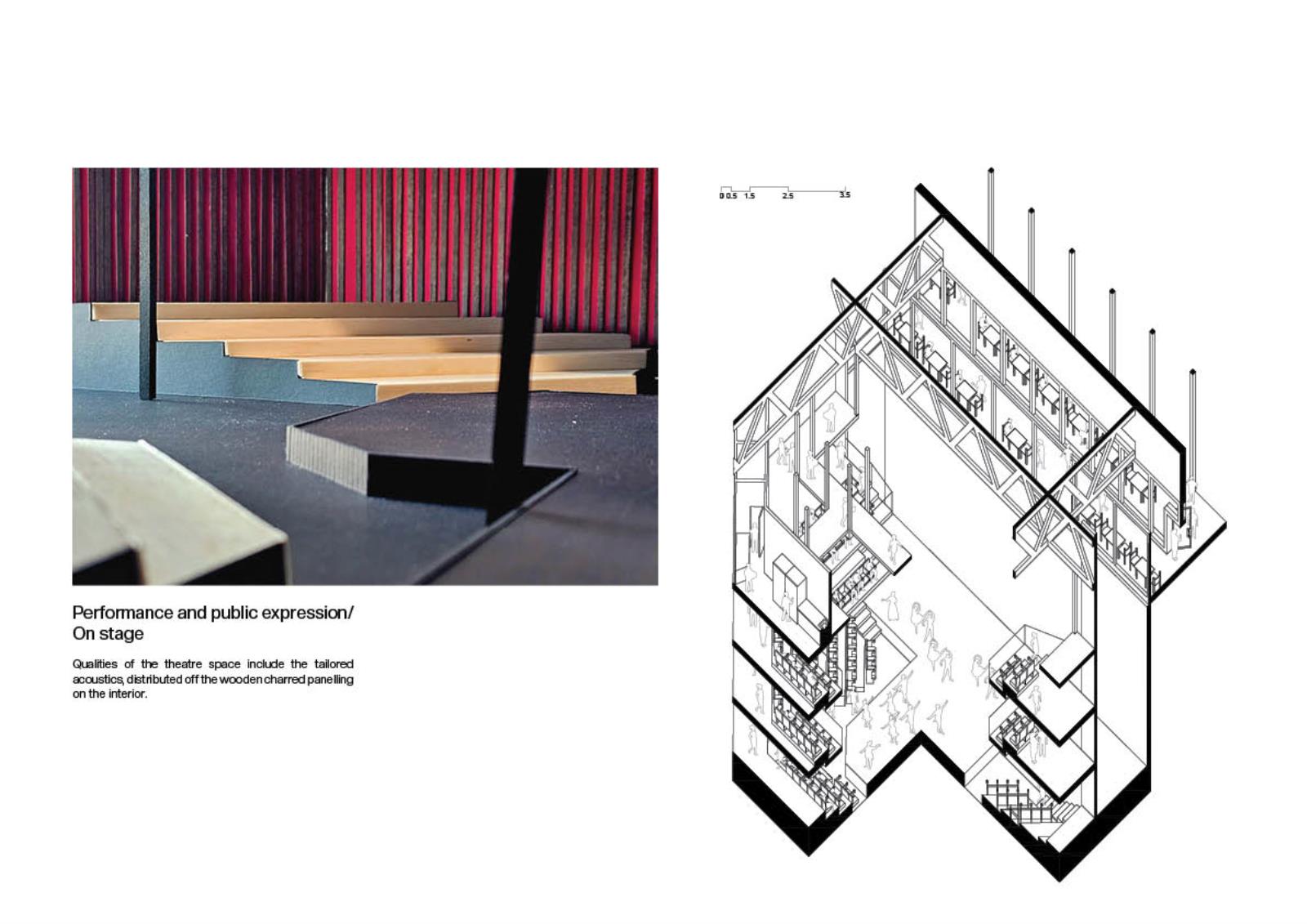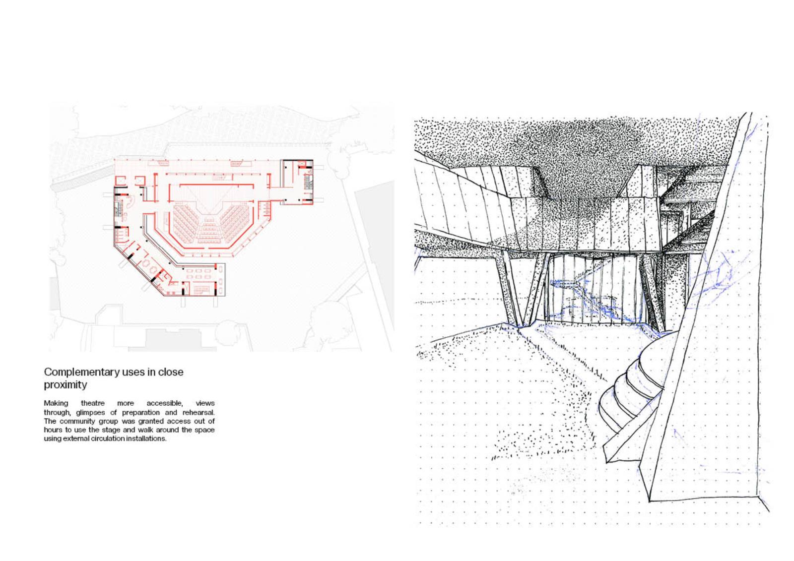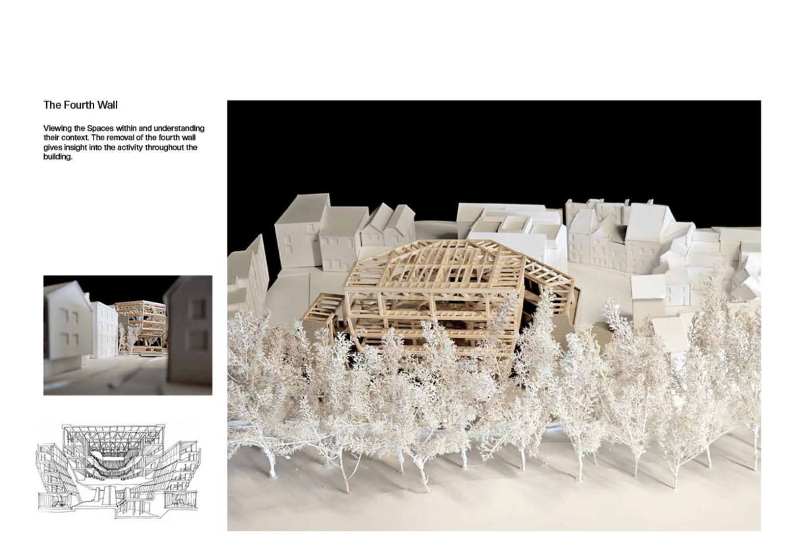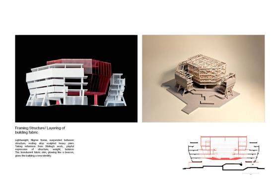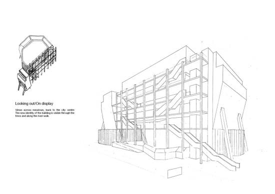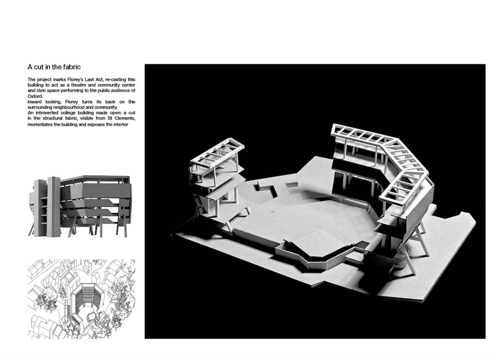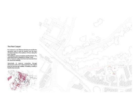The project reimagines James Stirling’s abandoned Florey building structure as a space for community use and public theatre. It aims to break down the private, collegiate history of the building and give it a new lease of life through opening it up to the residents of Oxford. The proposal will provide a new venue for public performance, cultural expression and social interaction.