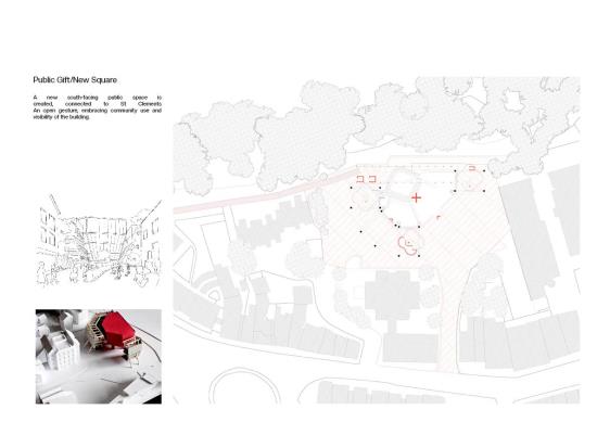 The existing Florey building faces the meadows and the historic city, turning its back on the surrounding Oxford neighbourhood. The project aims to re-orientate the structure and improved its local presence by removing the current southern quad and creating a spacious 1,350 m² south-facing public square that connects back to St Clements Street, at the heart of the district.