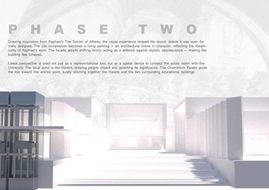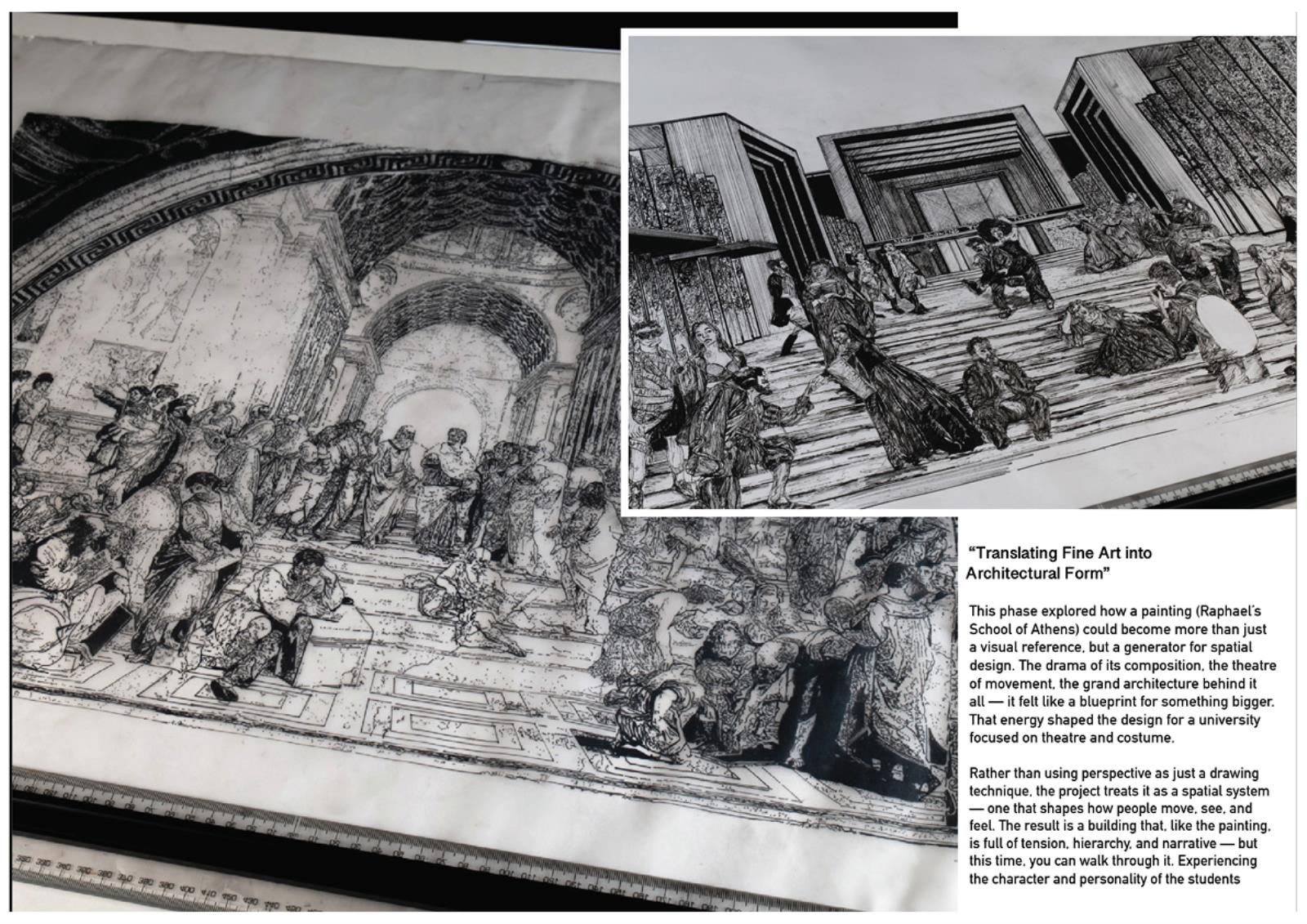Term 2 reversed this process, focusing on Raphael’s “The School of Athens”. Using the compositions, counterbalances and spatial layout of the painting I began to translate them into architectural principles for my project. The Theatrical spread of characters influenced the University scheme being one of theatre.