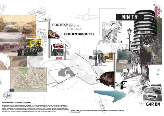 In Term 1, I drew inspiration from Creation of Adam to conceptualise spatial disconnection through Bournemouth’s urban context. Framing the idea of disconnection of the fragmented landscape through layering the painting on top, revealing cracks of Bournemouth’s context.