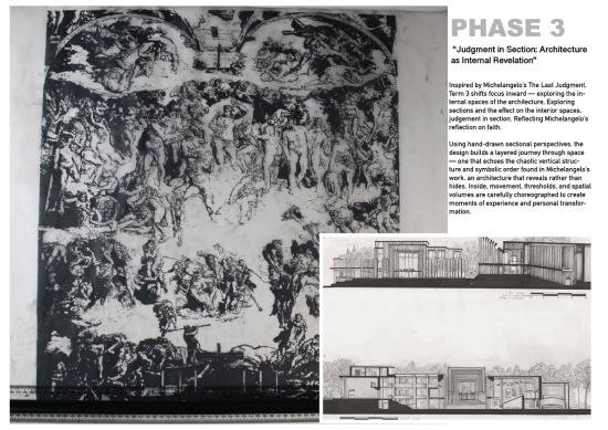 Term 3 focused inwards to the soul of the project. Using Michealangelo’s “The Last Judgement” as a reflection of the projects design, interior and exterior spaces, and a time for me to reflect creatively. The drawing mirrored the philosophy of Michelangelo’s reflection towards his faith, expressed architecturally.