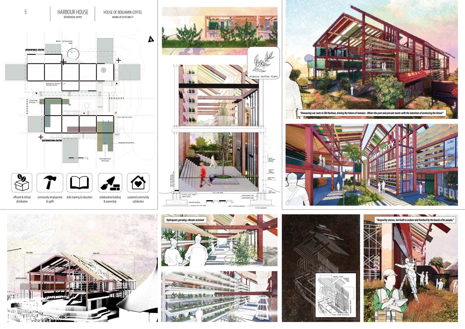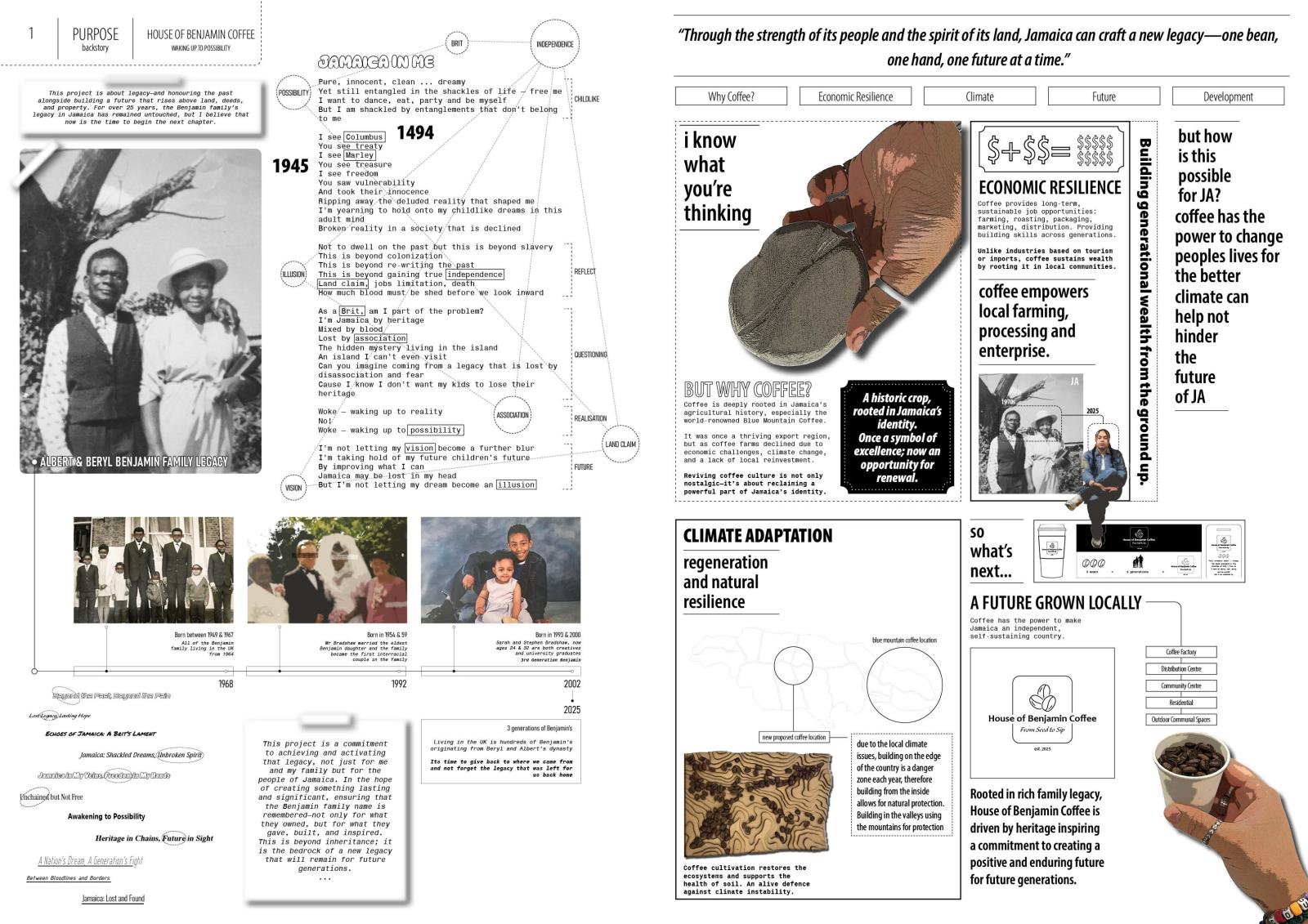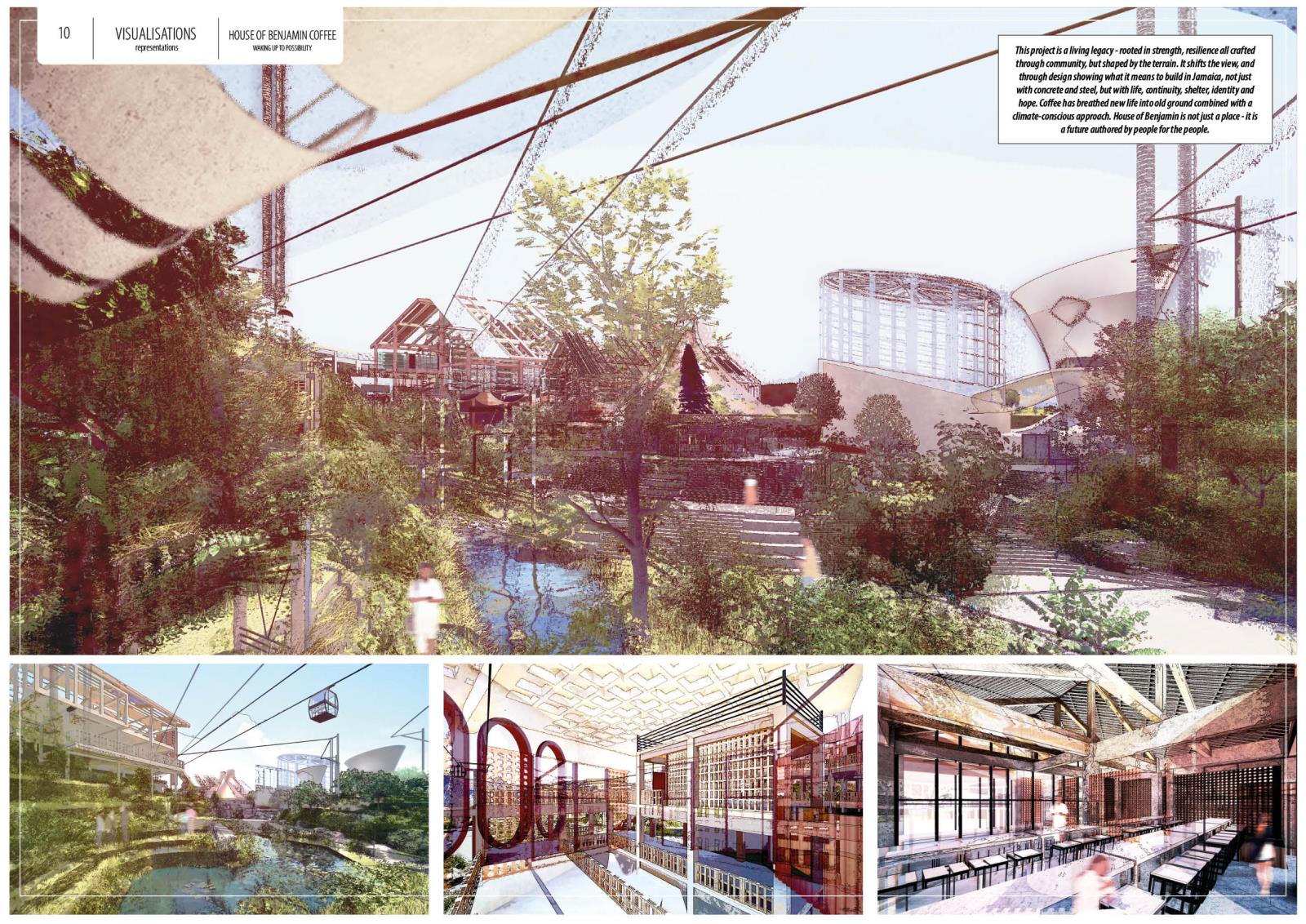 House of Benjamin Coffee Part 2 Project 2025 Sarah Bradshaw University of Huddersfield | UK House of Benjamin Coffee is more than a factory; it is a regenerative framework for Jamaica’s future. Rooted in heritage, built on resilience, and shaped by people, the project reimagines how architecture can act as both storyteller and as a tool for change. Set within the mountainous terrain of rural Jamaica, it proposes a carbon-neutral coffee facility that blends traditional farming with future-facing infrastructure, providing employment, education, and environmental stability.The architecture embraces local specificity: a steel-to-concrete footing system that accommodates the steep terrain, while key structural elements use coffee-concrete, giving coffee waste a second life and reducing carbon footprint. The factory operates on renewable systems, whilst hydroponic cells ensure year-round production, and passive shading protects workers and produce alike.The scheme is deliberately unfinished: residents receive housing shells with basic shading and partitioning, which they can customise using locally reclaimed materials. In the face of climate events, the core structure remains resilient, allowing damaged facades to be rebuilt with ease, ensuring longevity and ownership.Bridging valleys with cable car systems and shaded walkways, the masterplan fosters connection both physically and socially. House of Benjamin Coffee is not a brand that imposes but is one that grows, heals, and evolves with and through its people. Tutor(s) Nic Clear