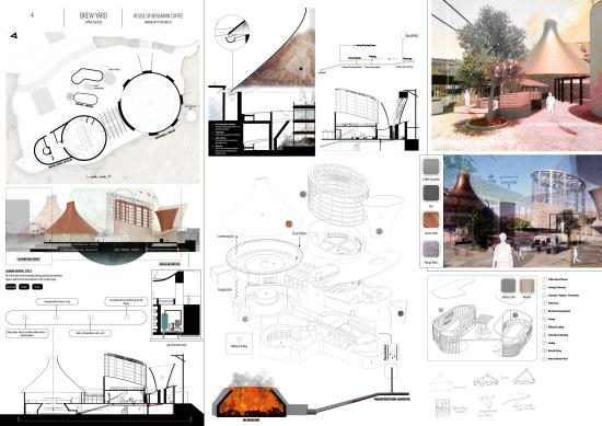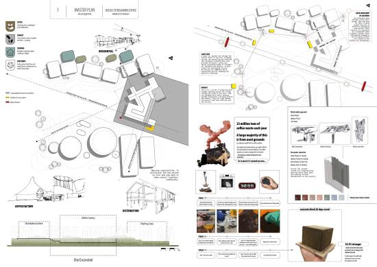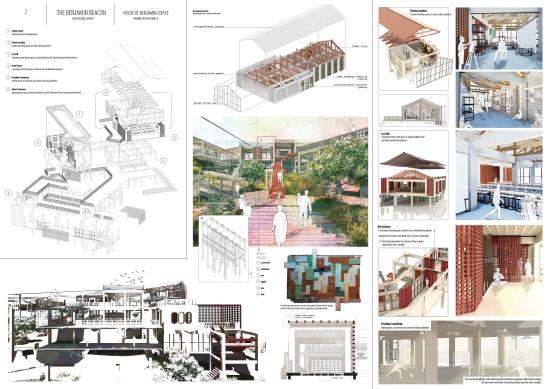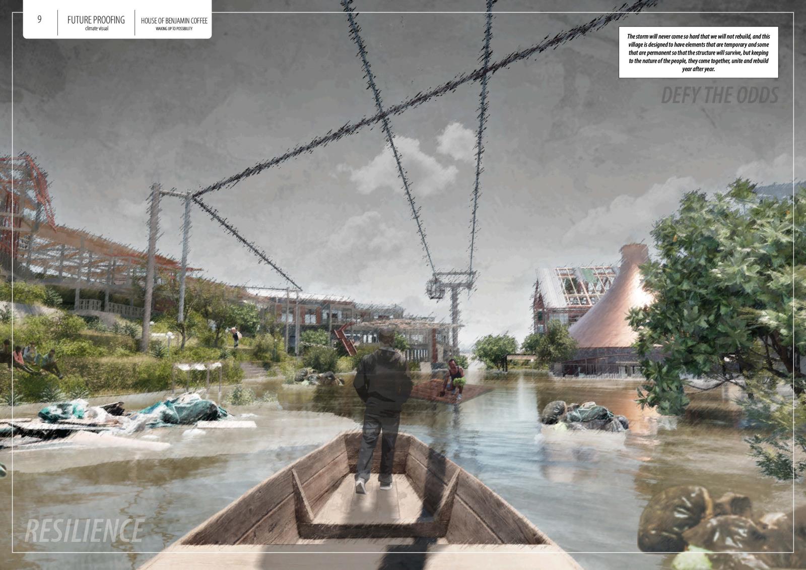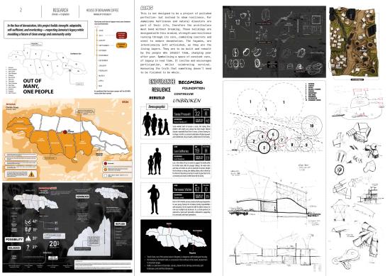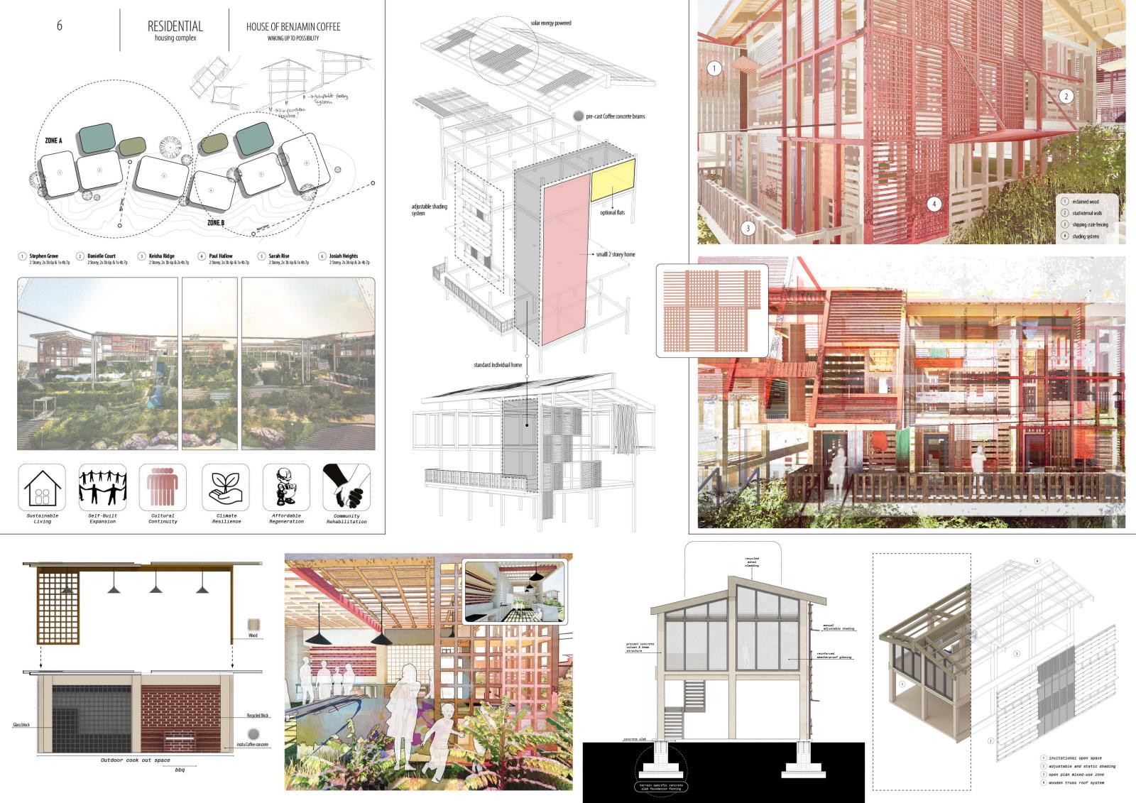 House of Benjamin Coffee Part 2 Project 2025 Sarah Bradshaw University of Huddersfield | UK House of Benjamin Coffee is more than a factory; it is a regenerative framework for Jamaica’s future. Rooted in heritage, built on resilience, and shaped by people, the project reimagines how architecture can act as both storyteller and as a tool for change. Set within the mountainous terrain of rural Jamaica, it proposes a carbon-neutral coffee facility that blends traditional farming with future-facing infrastructure, providing employment, education, and environmental stability.The architecture embraces local specificity: a steel-to-concrete footing system that accommodates the steep terrain, while key structural elements use coffee-concrete, giving coffee waste a second life and reducing carbon footprint. The factory operates on renewable systems, whilst hydroponic cells ensure year-round production, and passive shading protects workers and produce alike.The scheme is deliberately unfinished: residents receive housing shells with basic shading and partitioning, which they can customise using locally reclaimed materials. In the face of climate events, the core structure remains resilient, allowing damaged facades to be rebuilt with ease, ensuring longevity and ownership.Bridging valleys with cable car systems and shaded walkways, the masterplan fosters connection both physically and socially. House of Benjamin Coffee is not a brand that imposes but is one that grows, heals, and evolves with and through its people. Tutor(s) Nic Clear