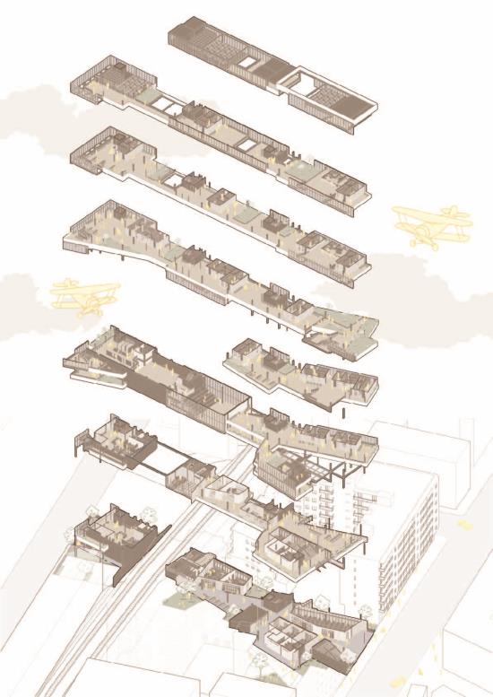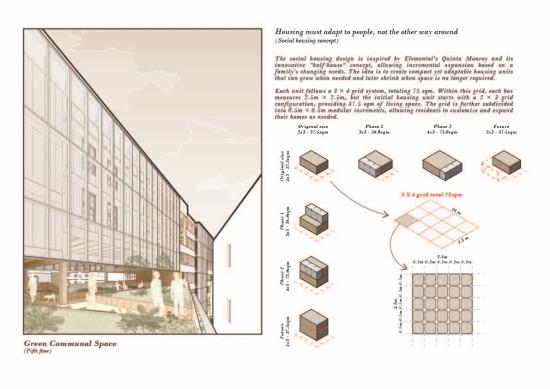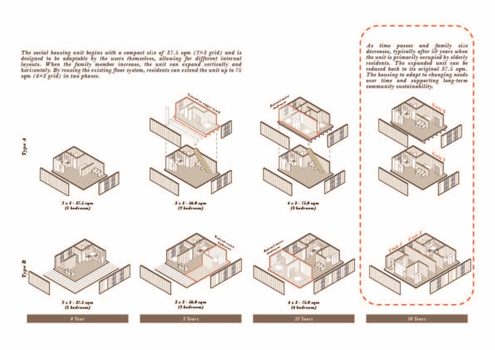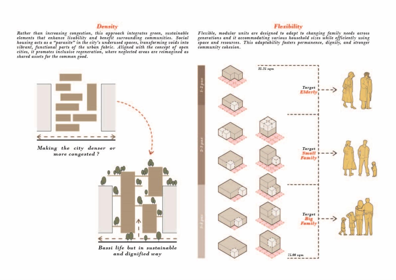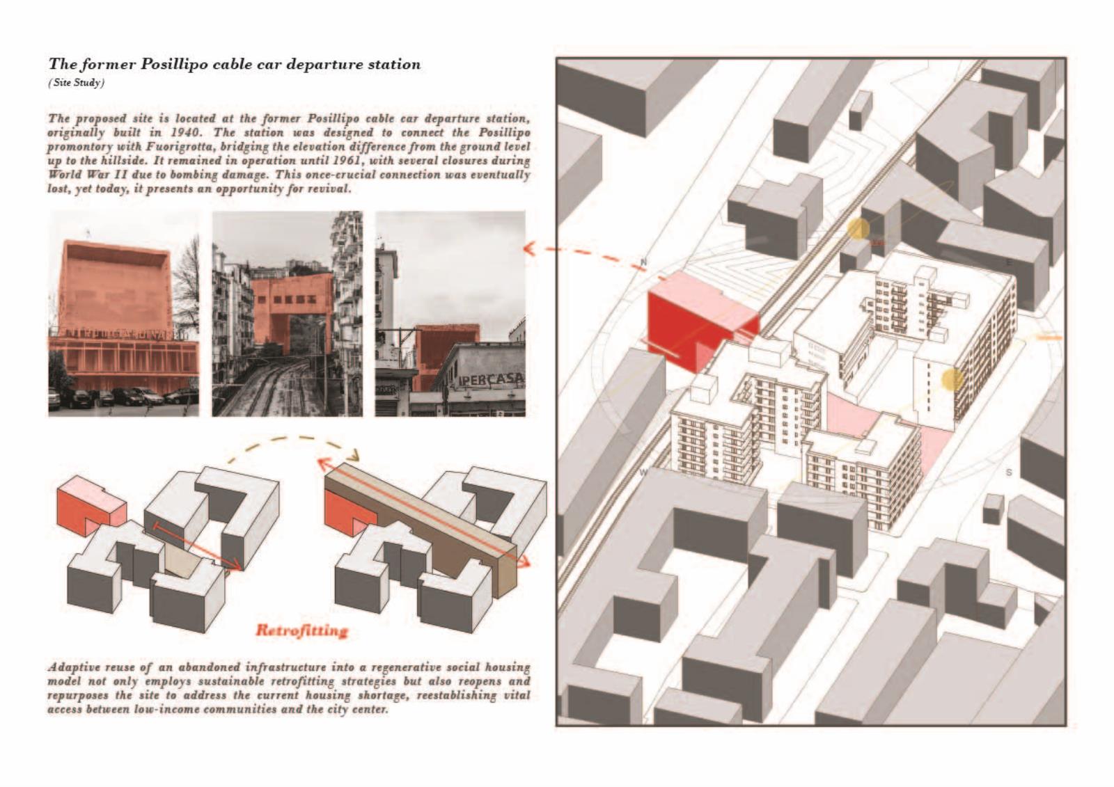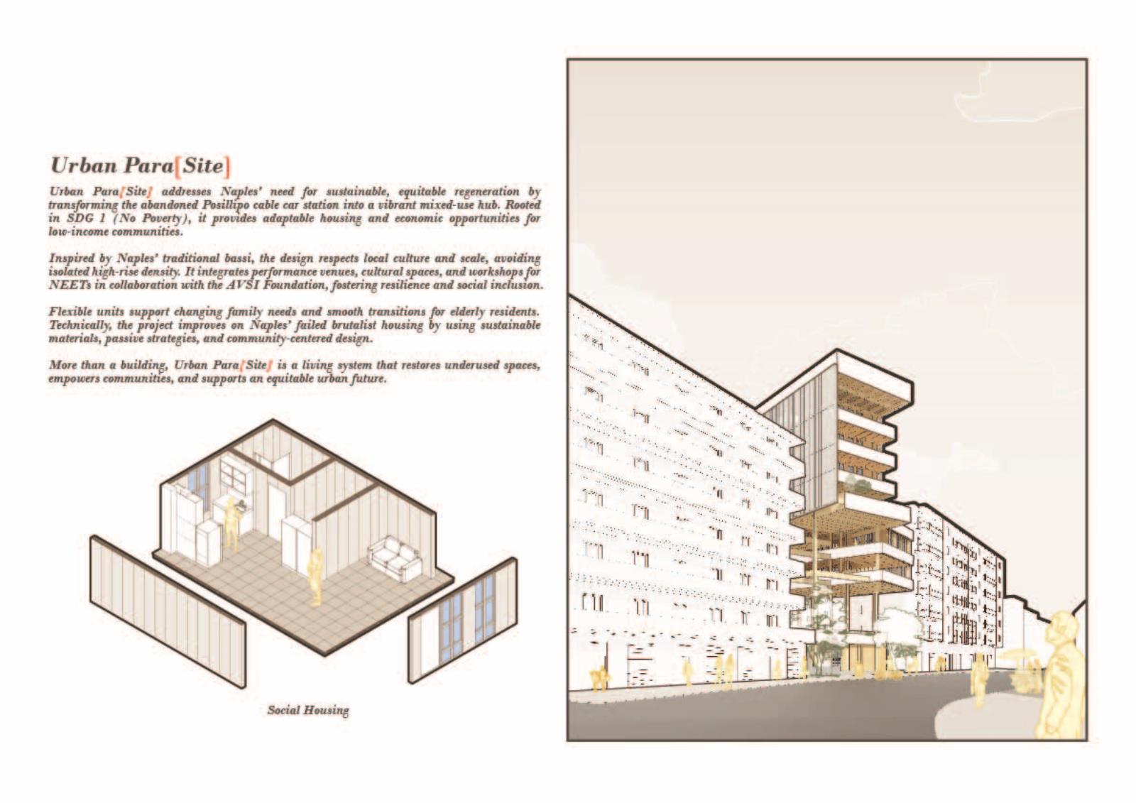 Urban Para[Site]: Leveraging abandoned spaces as social housing in Naples, Italy Part 2 Project 2025 Zi Jing Kung University of Portsmouth | UK Urban Para[Site] reclaims the abandoned Posillipo cable car station in Naples, Italy, and transforms it into an inclusive, sustainable model for social housing. The project begins by challenging the conventional approach of placing affordable housing on the urban periphery. Instead, it proposes reintegrating social housing into the city by adapting disused infrastructure, restoring access to opportunity, services, and community life.Grounded in SDG 1: No Poverty, the project follows three key strategies: retrofitting existing structures to reduce environmental impact, densifying without overwhelming the urban fabric, and designing flexible housing that adapts to residents’ changing needs over time.Inspired by the Neapolitan tradition of bassi (small, adaptable homes) the units begin at 37.5sqm and can expand or contract according to life stage. The scheme integrates green public spaces, NEET workshops, and cultural venues to activate the site both socially and economically.Constructed with a low-carbon LVL structure and recycled materials, the design incorporates passive systems like solar panels, green roofs, and rainwater harvesting. Urban Para[Site] offers a new urban model, one that is ecologically responsible, community-rooted, and deeply connected to place. It demonstrates that housing can be more than shelter, it can be a framework for dignity, growth, and urban renewal. Tutor(s) Guido Robazza