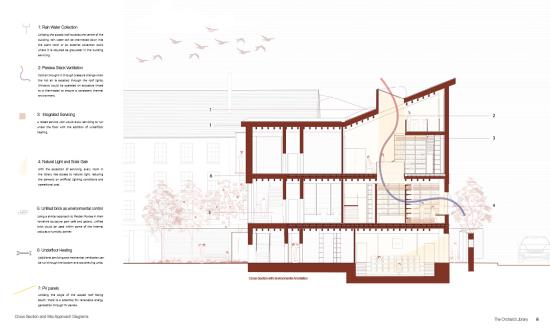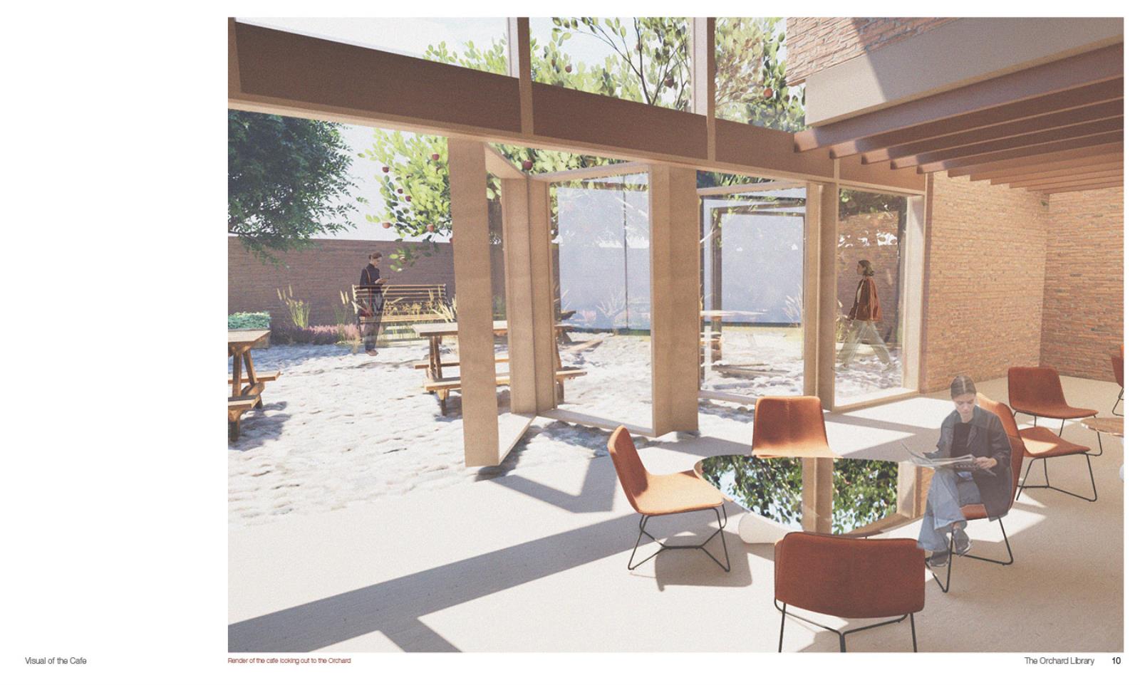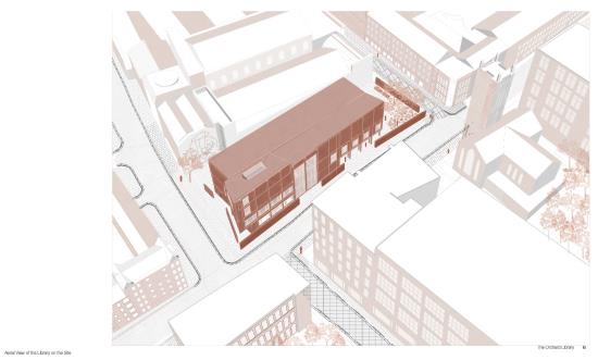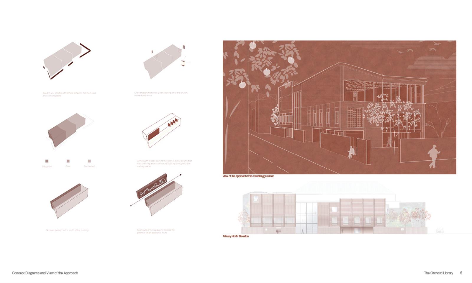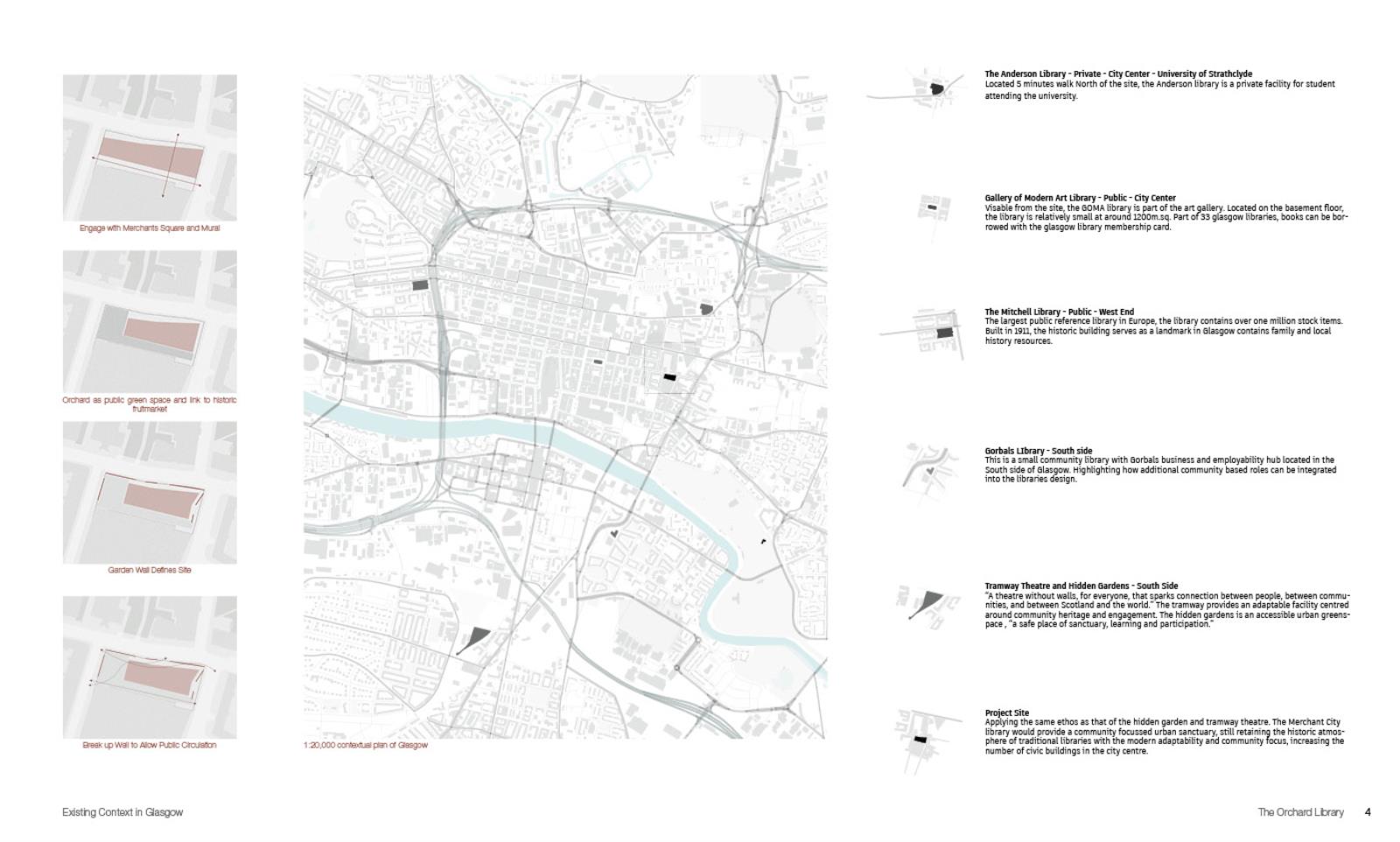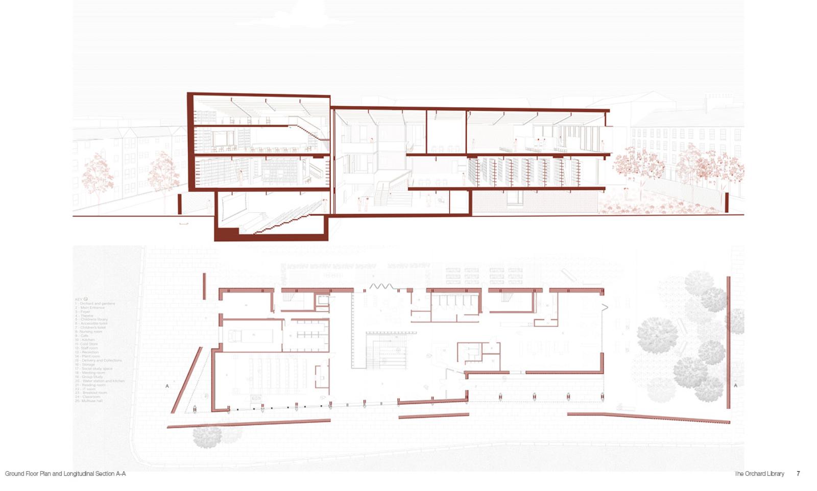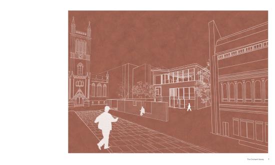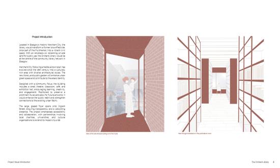 The Orchard Library Part 1 Project 2025 Rosie Hall University of Dundee | UK The Orchard Library aims to emphasise the importance of public buildings with a prominent community library located in Glasgow’s City Centre. Bridging the gap between traditional and contemporary libraries, the building has a range of environments, focussing on materiality and light with a sensitive approach to the site context and character. Located in Glasgow’s historic Merchant City, the library would transform a former brownfield site, once part of the Fruitmarket, into a vibrant civic space. Merchant City, following a medieval town plan, has evolved since the 18th century into a culturally rich area with diverse architectural styles. The new library and public garden would enhance urban green space and contribute to the area’s identity.Designed with a community focus, the building includes a small theatre, classroom, café, and exhibition hall, encouraging learning, creativity, and engagement. Positioned to preserve a prominent mural and allow for future artworks, it would enhance the public realm and strengthen connections to the existing urban fabric through partnerships involving local charities, universities and cultural organisations. Tutor(s) Richard Dundas Eva Krisilia