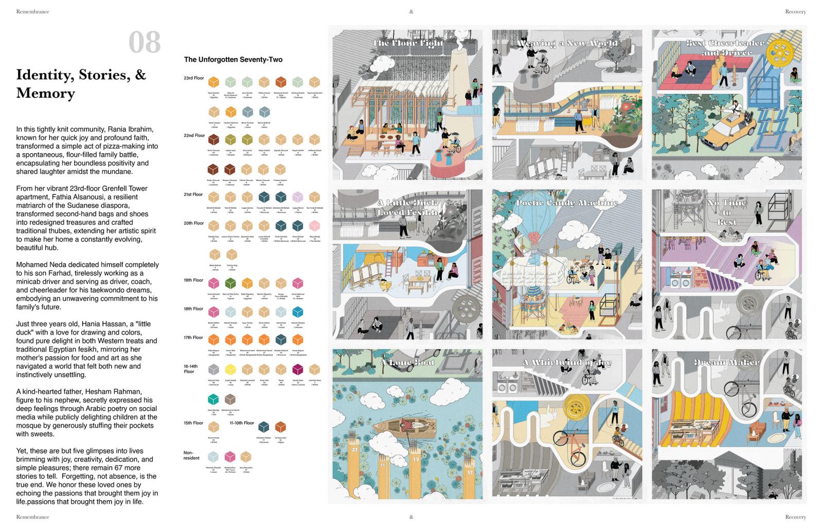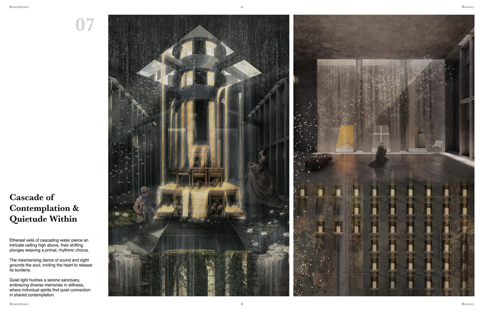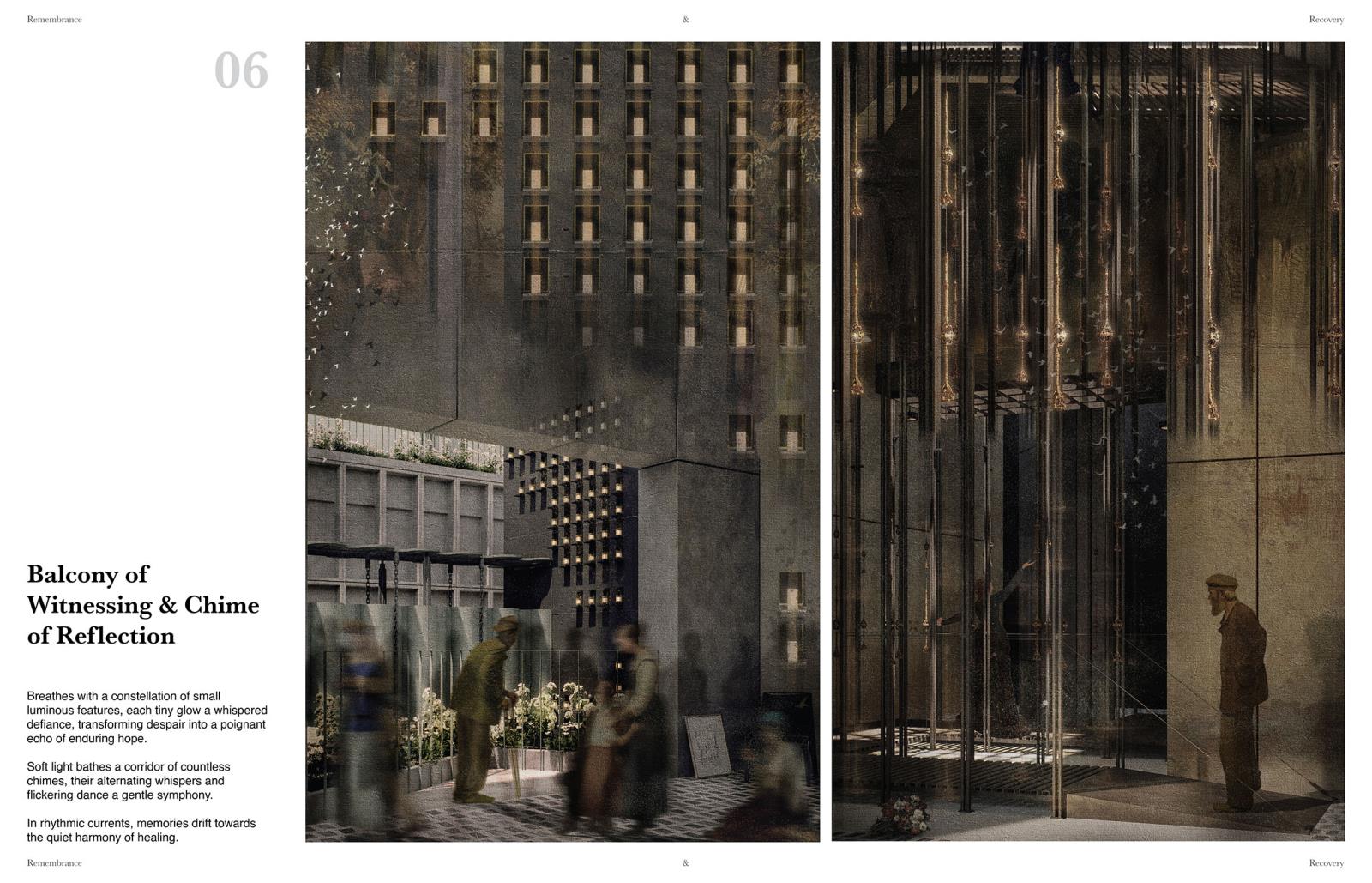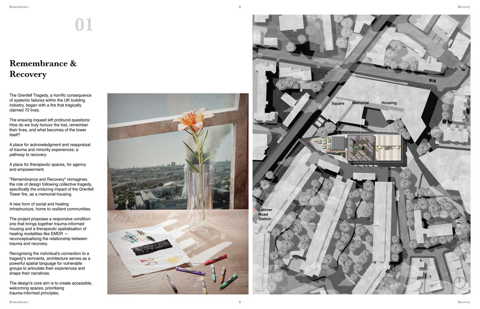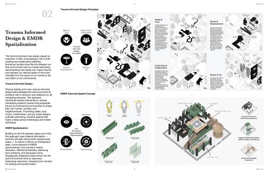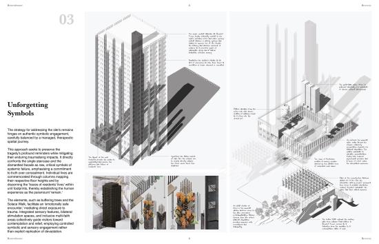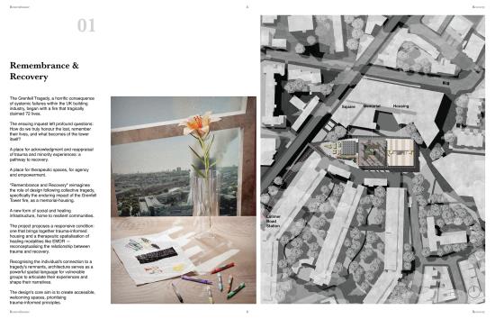 Remembrance and Recovery Part 2 Project 2025 Yung Yu Wu Manchester School of Architecture | UK The Grenfell Tragedy, a horrific consequence of systemic failures within the UK building industry, began with a fire that tragically claimed 72 lives. The ensuing inquest left profound questions: How do we truly honour the lost, remember their lives, and what becomes of the tower itself?This project, "Remembrance and Recovery," reimagines the role of design following such collective tragedy. It seeks to create a place for the acknowledgement and reappraisal of trauma and minority experiences—a pathway to recovery. More than just structures, it envisions therapeutic spaces fostering agency and empowerment.Conceived as a new form of social and healing infrastructure, home to resilient communities, "Remembrance and Recovery" proposes a responsive condition. It seamlessly integrates trauma-informed housing with a therapeutic spatialization of healing modalities like EMDR, fundamentally reconceptualising the relationship between trauma and recovery.Understanding the individual's profound connection to a tragedy's remnants, architecture here serves as a powerful spatial language. It empowers vulnerable groups to articulate their experiences and shape their narratives. The design's core aim is to create accessible, welcoming spaces, built upon prioritising trauma-informed principles. Tutor(s) Julie Fitzpatrick Mark Hammond Rosie Park