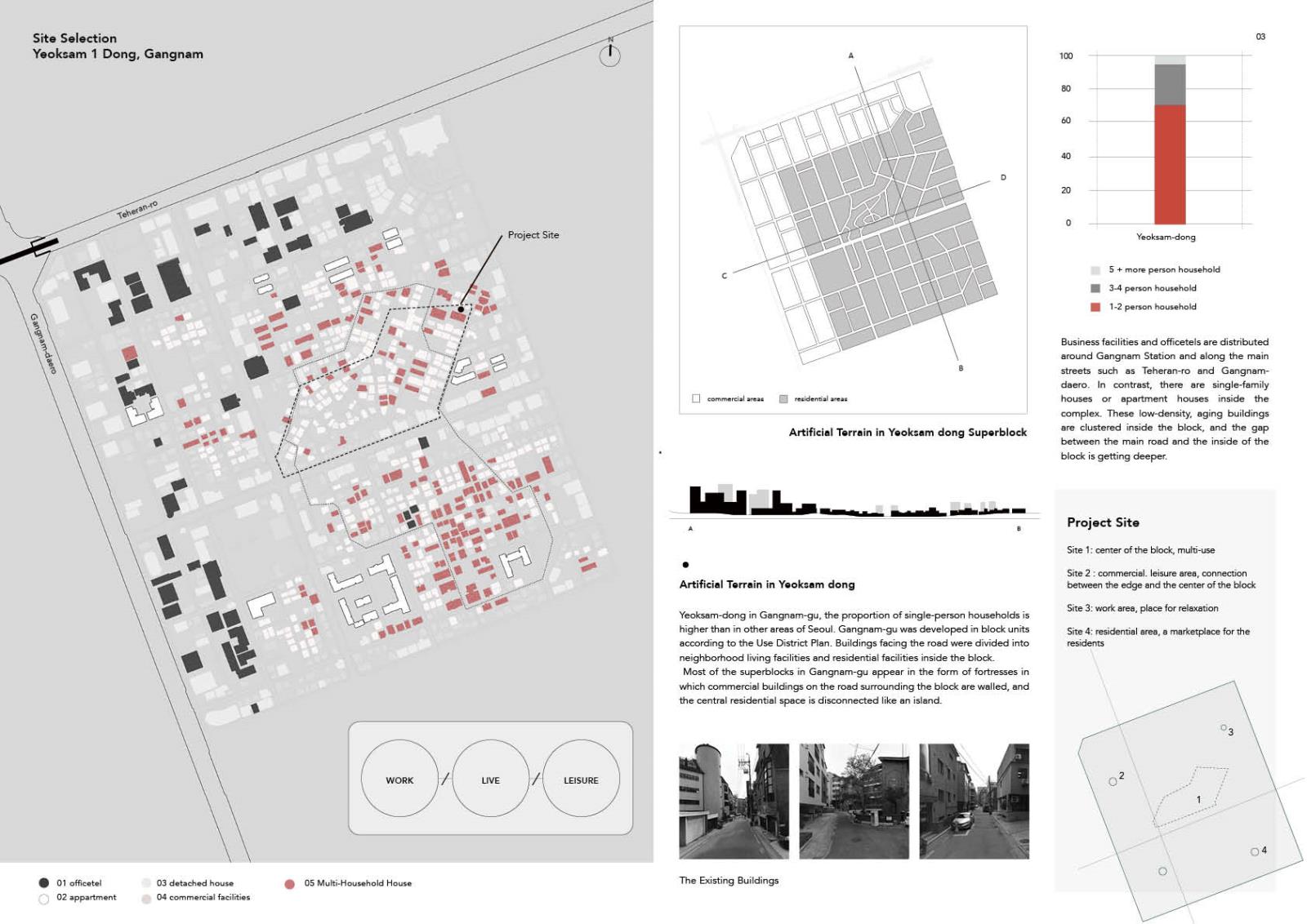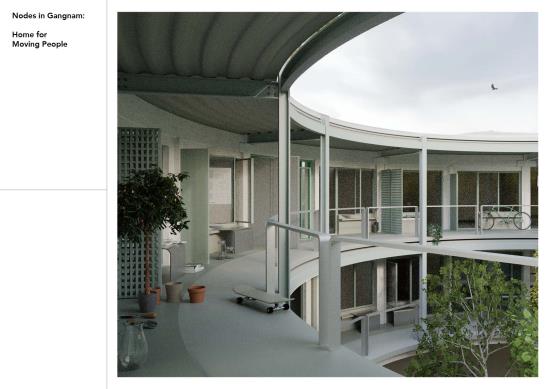 Gangnam is a city without natives. It is a city of mobility that many people go through before they completely settle down. Gangnam raises the question of how to restore the concept of neighbors and provide infrastructure for a meaningful life. This project proposes residential spaces for people in transition or seeking a new settlement in a city like Gangnam.