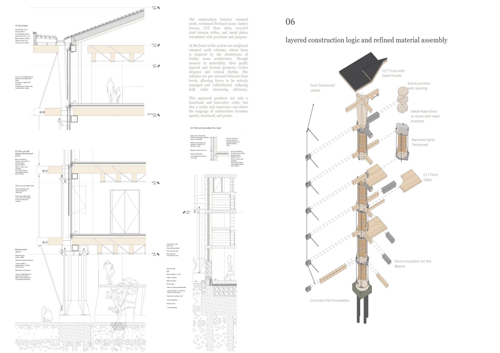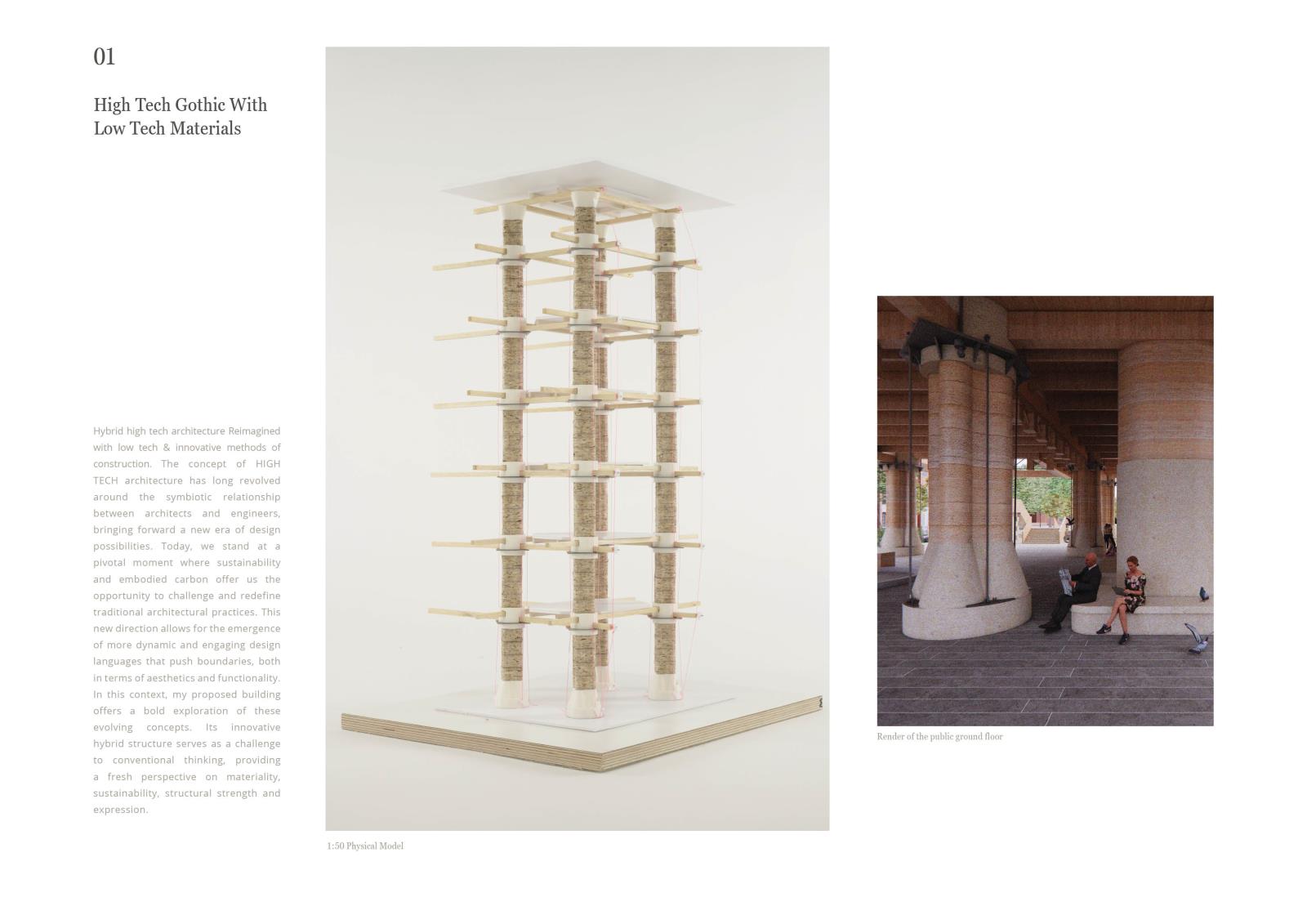 Historically, High Tech design celebrated the close collaboration between architect and engineer, expressing structure and function as one. Today, we face urgent challenges of embodied carbon, climate responsibility, and the need for social engagement in architecture. My proposal responds to this shift by merging innovation with restraint. It explores how lightweight, expressive structures can be built using simple, low-impact materials, while retaining the ambition and dynamism of High Tech aesthetics. The result is a hybrid architecture, part gothic, part contemporary, that challenges conventions of materiality, form, and construction logic.