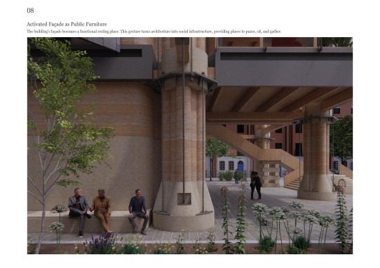 Guided by Peter Rice’s belief in the clarity of structural connections, the building elevates and celebrates its construction. It also upholds Le Corbusier’s idea of raising buildings on columns to liberate the ground plane. Public space is prioritised, with an open and inviting ground floor that engages the street and honours the civic role of architecture. As Alison Brooks states, “the façade belongs to the people” and this project embodies that principle.