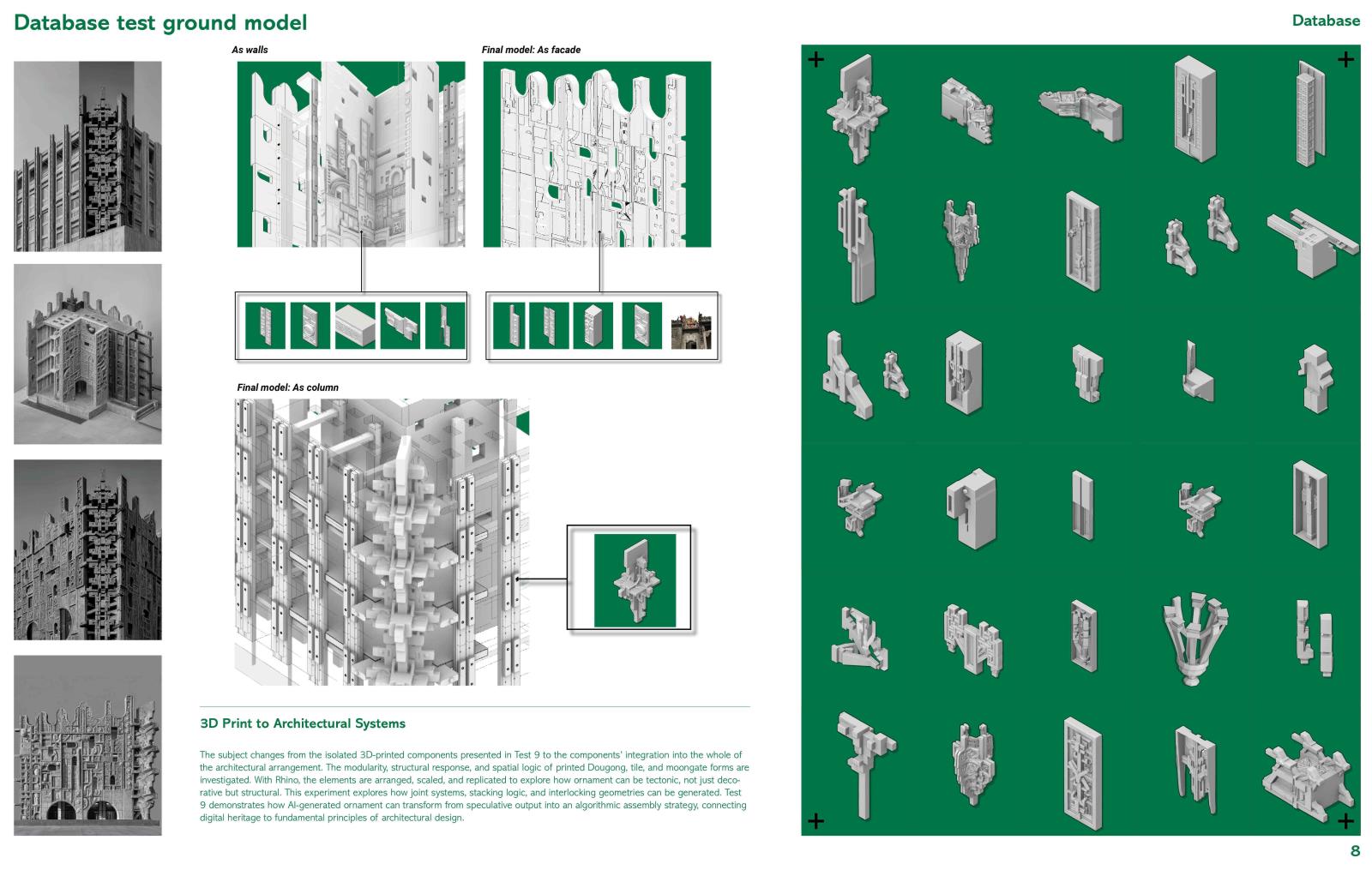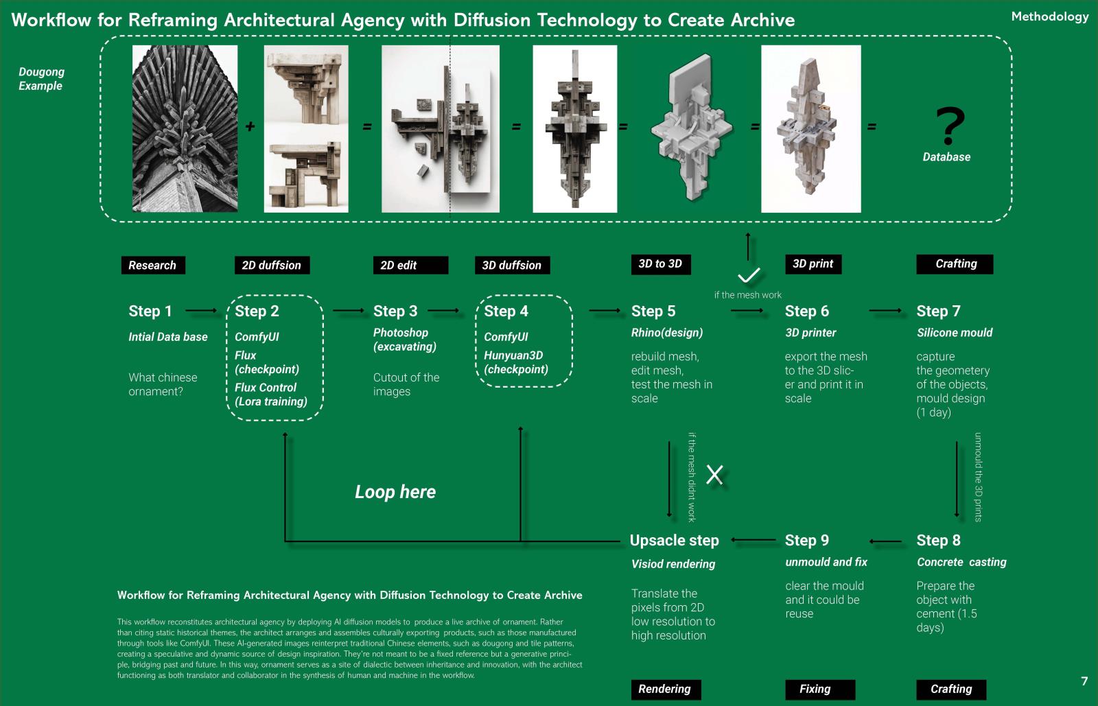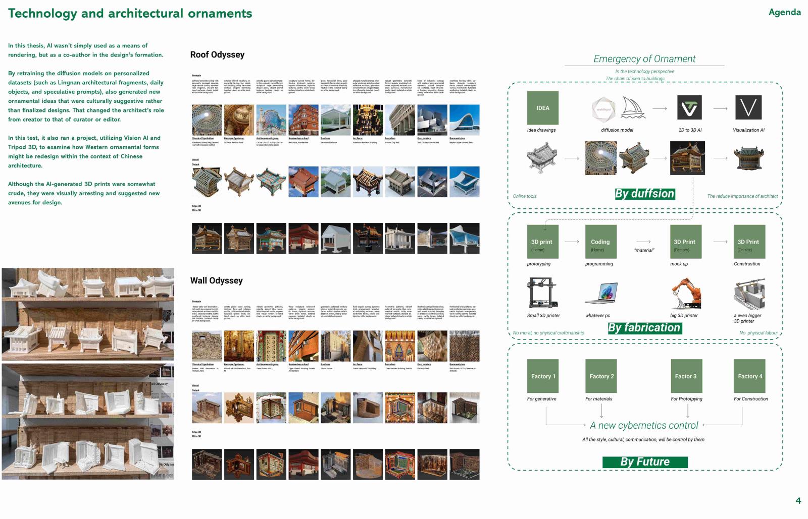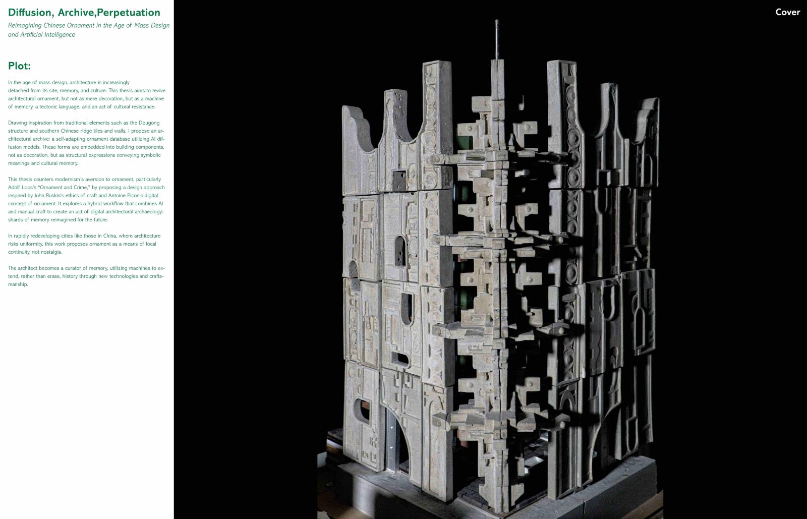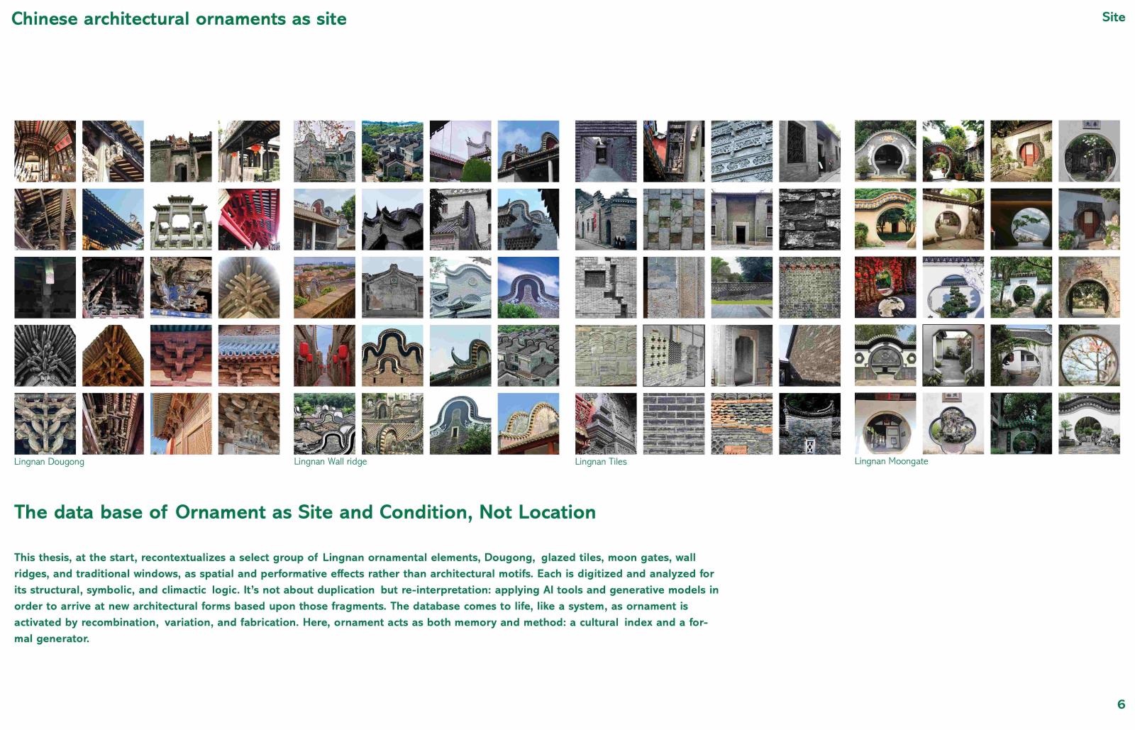 Drawing inspiration from traditional elements such as the Dougong structure and southern Chinese ridge tiles and walls, I propose an architectural archive: a self-adapting ornament database utilizing AI diffusion models. These forms are embedded into building components, not as decoration, but as structural expressions conveying symbolic meanings and cultural memory.