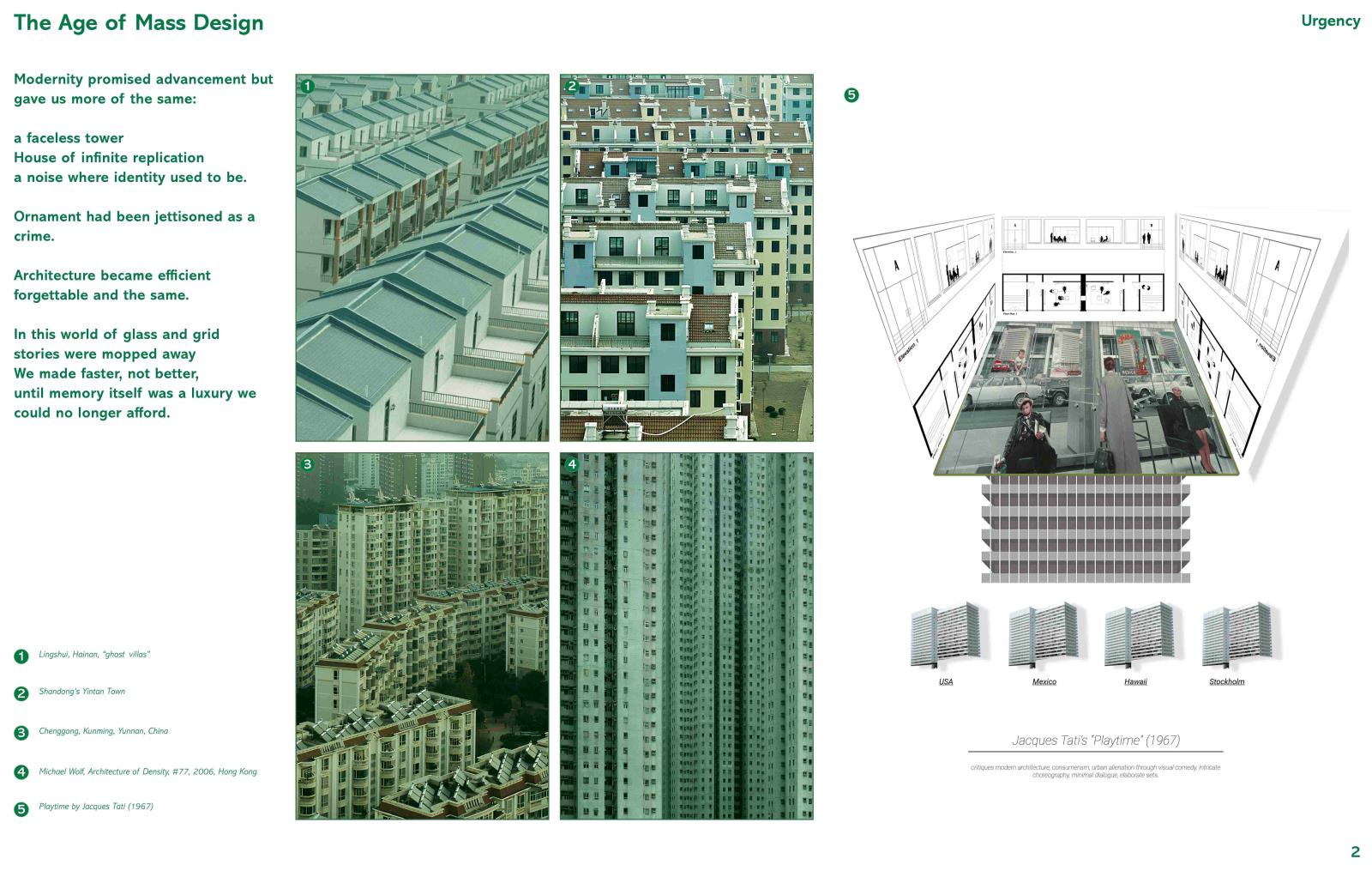 In rapidly redeveloping cities like those in China, where architecture risks uniformity, this work proposes ornament as a means of local continuity, not nostalgia. The architect becomes a curator of memory, utilizing machines to extend, rather than erase, history through new technologies and craftsmanship.