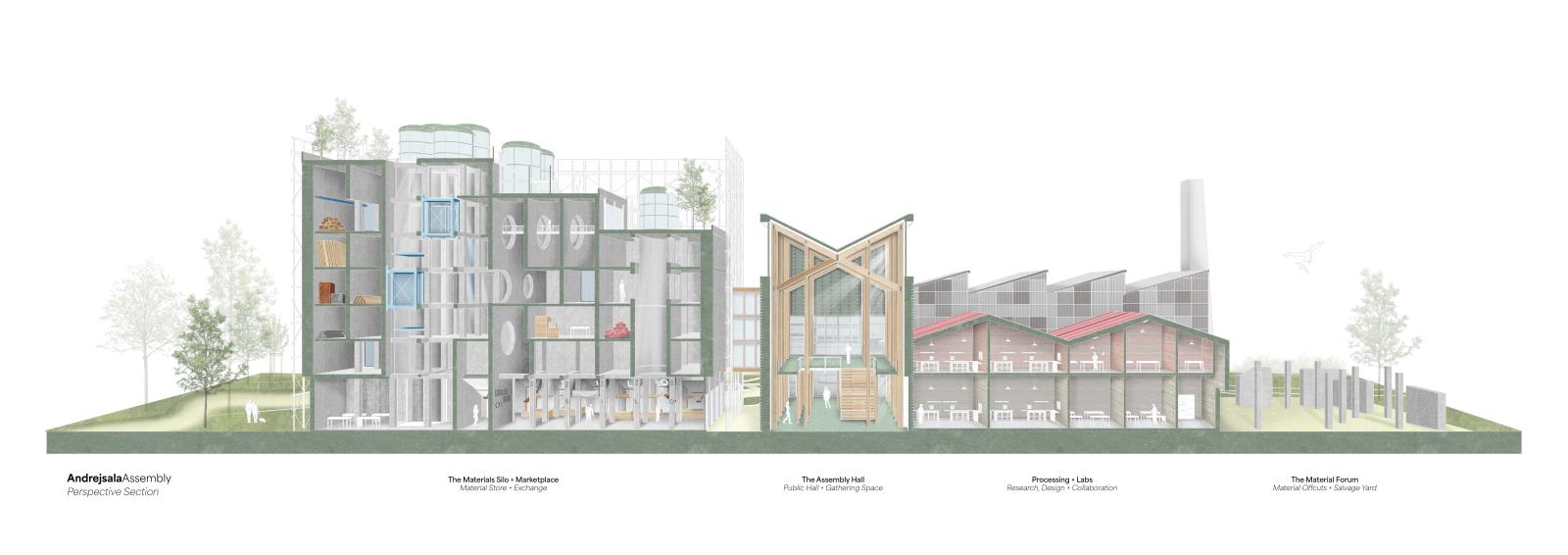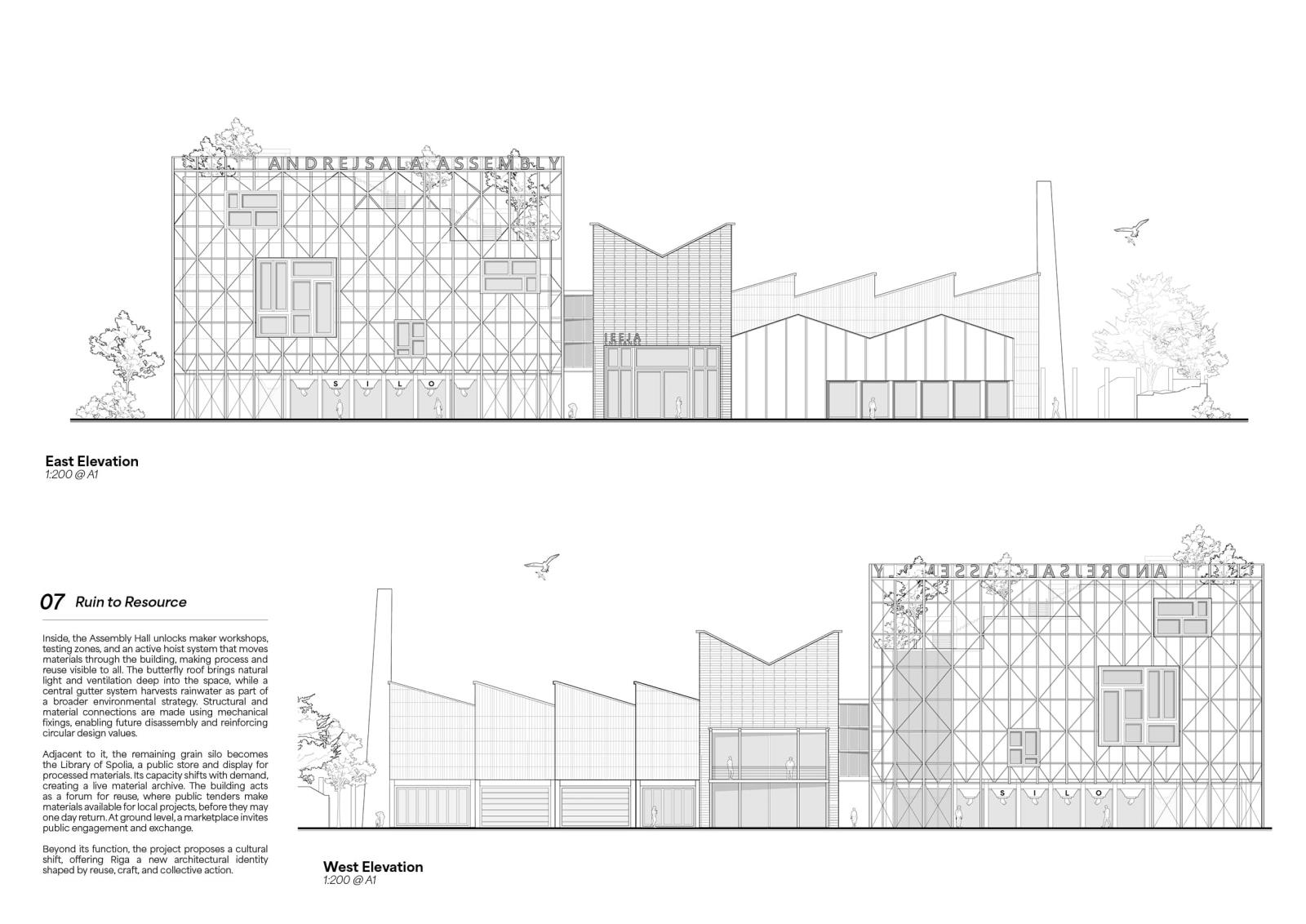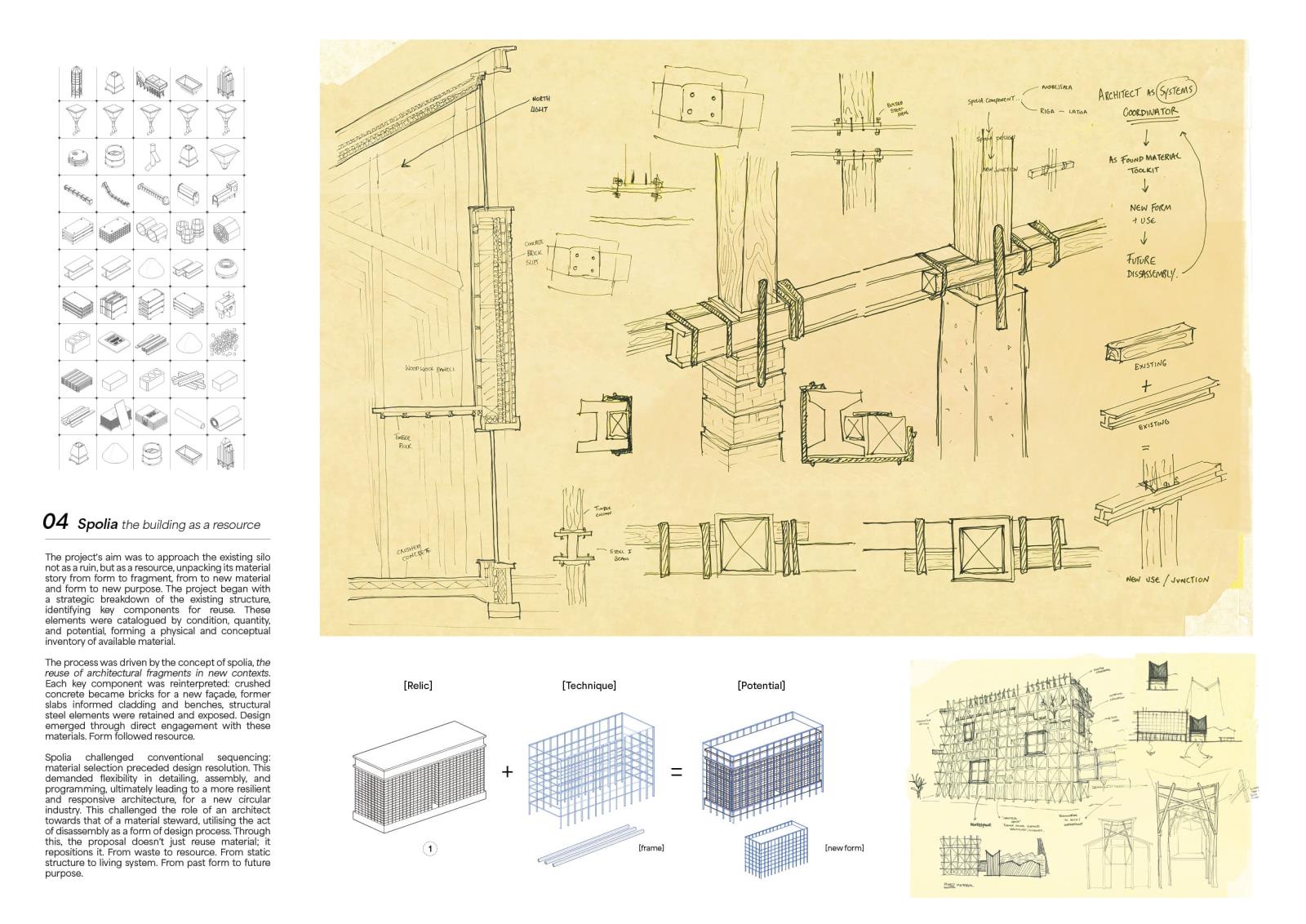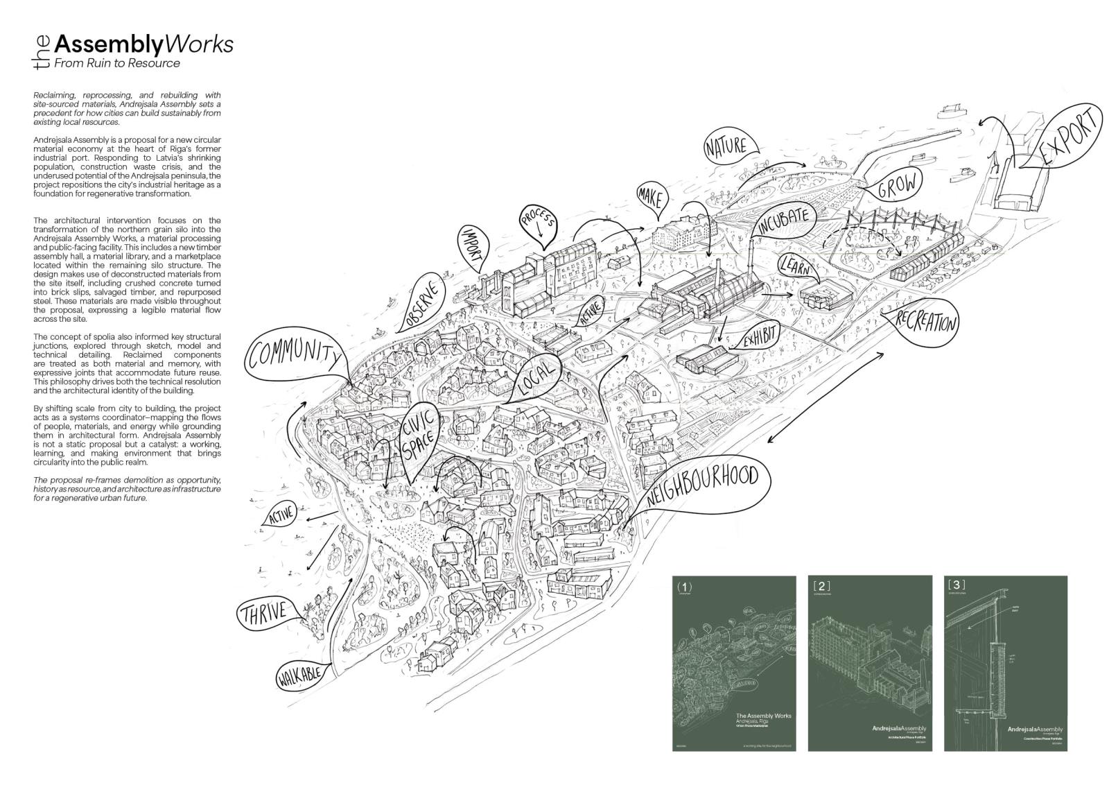 The Assembly Works Part 2 Project 2025 Joseph Nicholson Loughborough University | UK Andrejsala Assembly is a proposal for a new circular industry at the heart of Riga’s former industrial port. Rooted in the concept of spolia, the reuse of architectural fragments in new forms, the project transforms a disused grain silo into a centre for material processing, research, and public engagement. Adjacent to the new timber-framed Assembly Hall, the remaining silo becomes the Library of Spolia: a material archive, marketplace, and catalyst for circular construction in Latvia.The project repositions waste as resource, and ruin as opportunity. It establishes a phased model for regenerative development, beginning with on-site material salvage and growing into a public infrastructure that supports local building projects, skills exchange, and low-carbon construction.Crucially, the project challenges the role of the architect, not as a specifier of new materials, but as a designer working with what is available. It proposes a future in which architecture responds to material realities, not idealised conditions; where form emerges from inventory, not abstraction. Andrejsala Assembly enables this shift, providing the space, systems, and civic framework for a new architectural culture, one that builds from the existing, for the future. From ruin to resource. Tutor(s) Francis Breheny