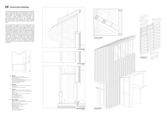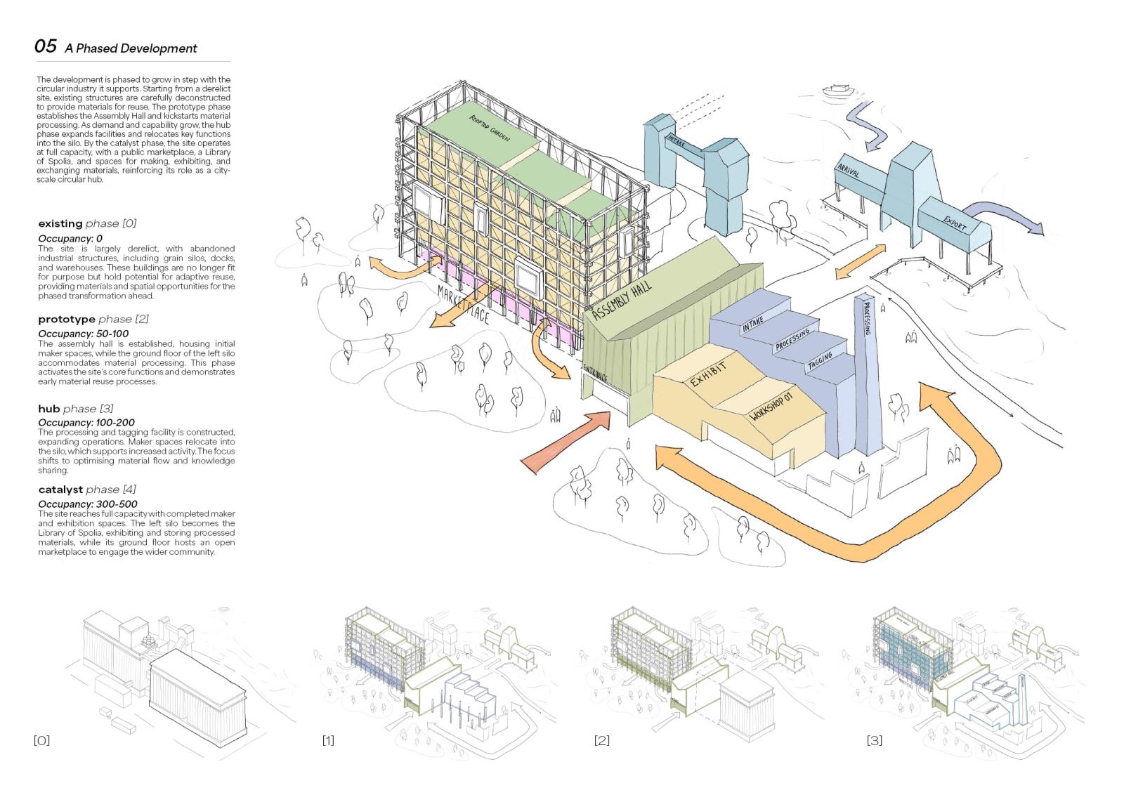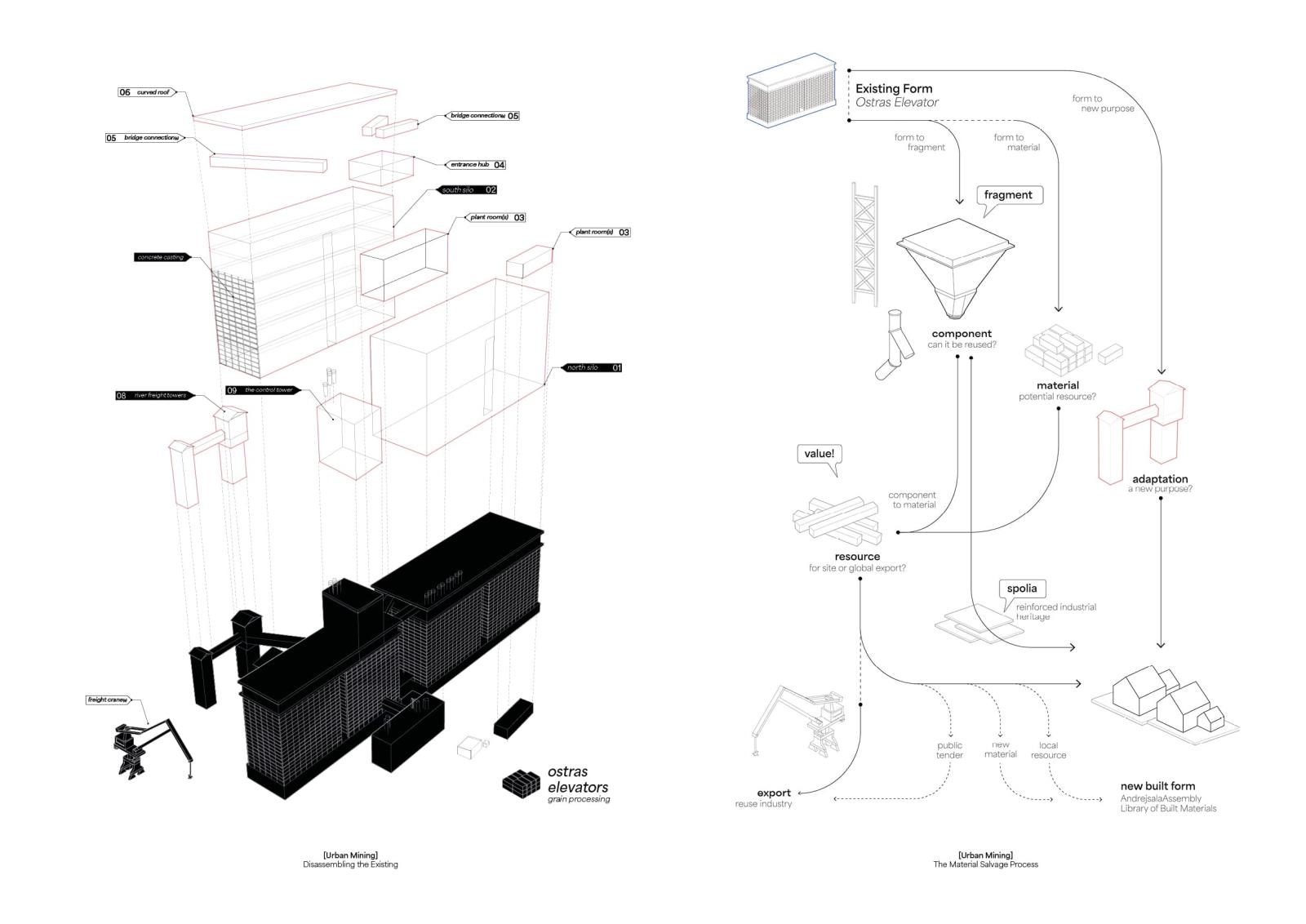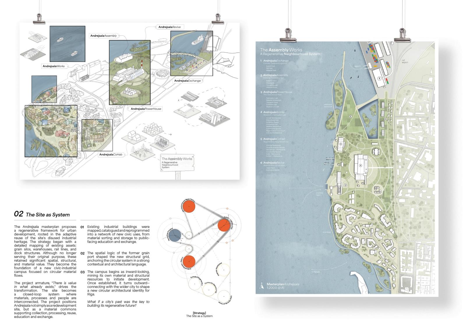 The Assembly Works Part 2 Project 2025 Joseph Nicholson Loughborough University | UK Andrejsala Assembly is a proposal for a new circular industry at the heart of Riga’s former industrial port. Rooted in the concept of spolia, the reuse of architectural fragments in new forms, the project transforms a disused grain silo into a centre for material processing, research, and public engagement. Adjacent to the new timber-framed Assembly Hall, the remaining silo becomes the Library of Spolia: a material archive, marketplace, and catalyst for circular construction in Latvia.The project repositions waste as resource, and ruin as opportunity. It establishes a phased model for regenerative development, beginning with on-site material salvage and growing into a public infrastructure that supports local building projects, skills exchange, and low-carbon construction.Crucially, the project challenges the role of the architect, not as a specifier of new materials, but as a designer working with what is available. It proposes a future in which architecture responds to material realities, not idealised conditions; where form emerges from inventory, not abstraction. Andrejsala Assembly enables this shift, providing the space, systems, and civic framework for a new architectural culture, one that builds from the existing, for the future. From ruin to resource. Tutor(s) Francis Breheny