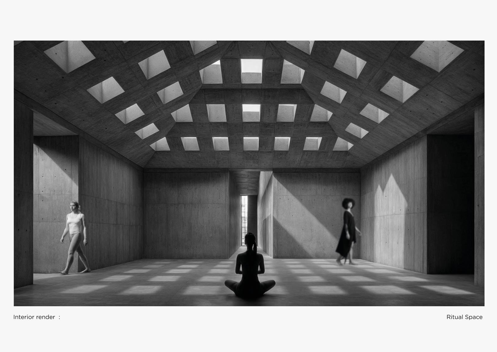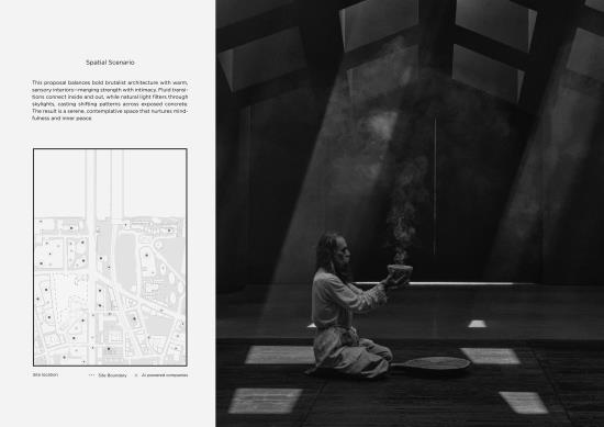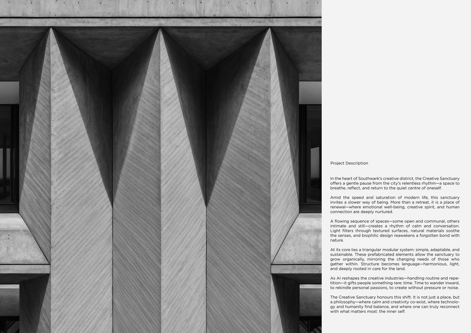 The Creative Sanctuary Part 2 Project 2025 Baran Cicek London South Bank University | UK In the heart of Southwark’s creative district, the Creative Sanctuary offers a calm alternative to the city's relentless pace, a space to breathe, reflect, and reconnect with the inner self.This project explores how architecture can support emotional well-being, creativity, and community in an age shaped by rapid change and automation. As AI frees us from routine, it opens space for deeper human experience. The sanctuary responds with a sequence of flowing spaces, communal and intimate, that invite stillness, connection, and renewal.Guided by biophilic principles, the design uses natural materials, soft light, and textured surfaces to soothe the senses and reawaken our bond with nature. At its core is a modular triangular system: prefabricated, adaptable, and sustainable. This structural language allows the sanctuary to evolve organically over time, mirroring the shifting needs of its users.More than a retreat, the Creative Sanctuary is a philosophy. It proposes a future where architecture fosters balance between technology and humanity, supporting not just what we do, but who we are becoming. Tutor(s) Federico Rossi Marco Vanucci
