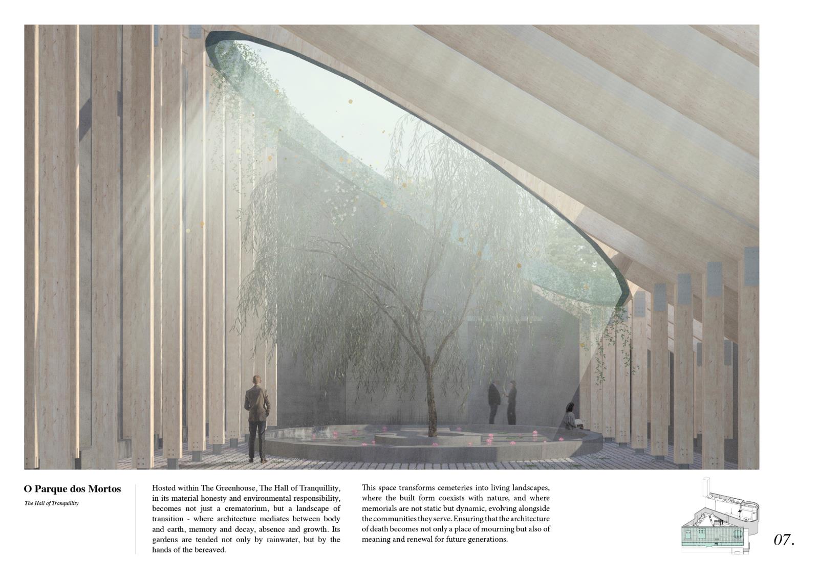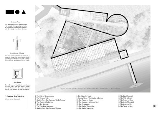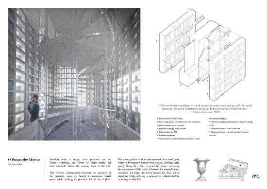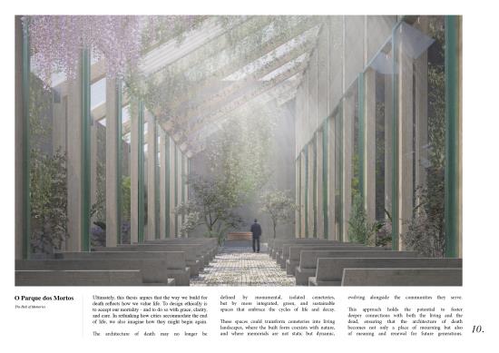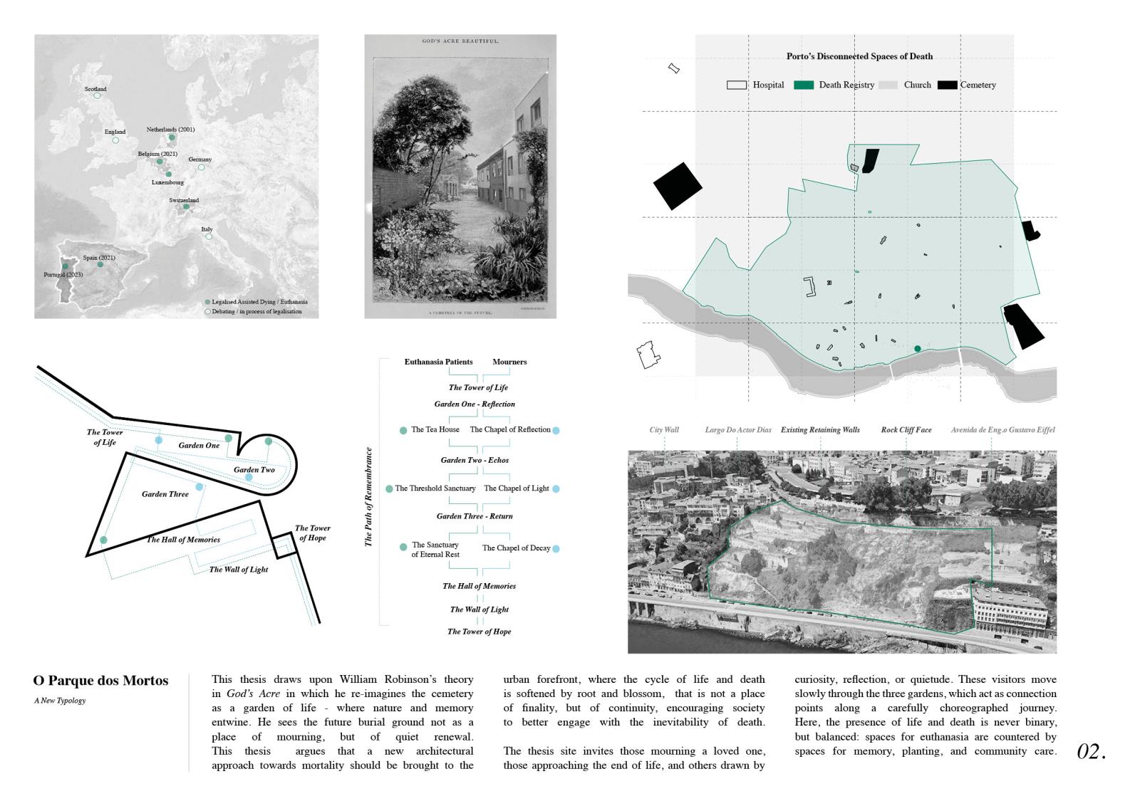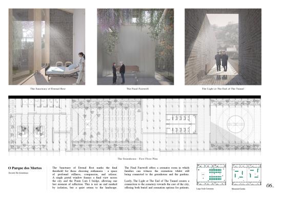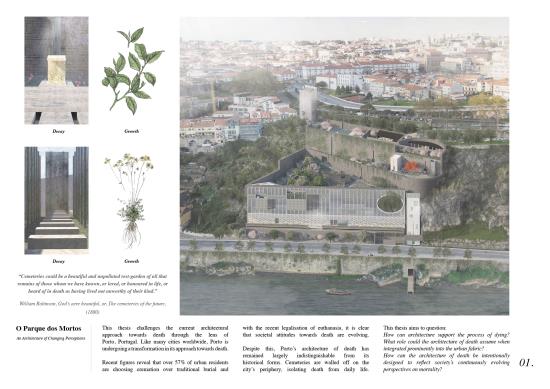 This thesis challenges conventional architectural responses to death through the lens of Porto, Portugal. Recent figures reveal that over 57% of urban residents are choosing cremation over traditional burial and with the recent legalisation of euthanasia, it is clear that societal attitudes towards death are evolving. Despite this, Porto’s cemeteries remain walled off on the city’s periphery, isolating death from daily life.