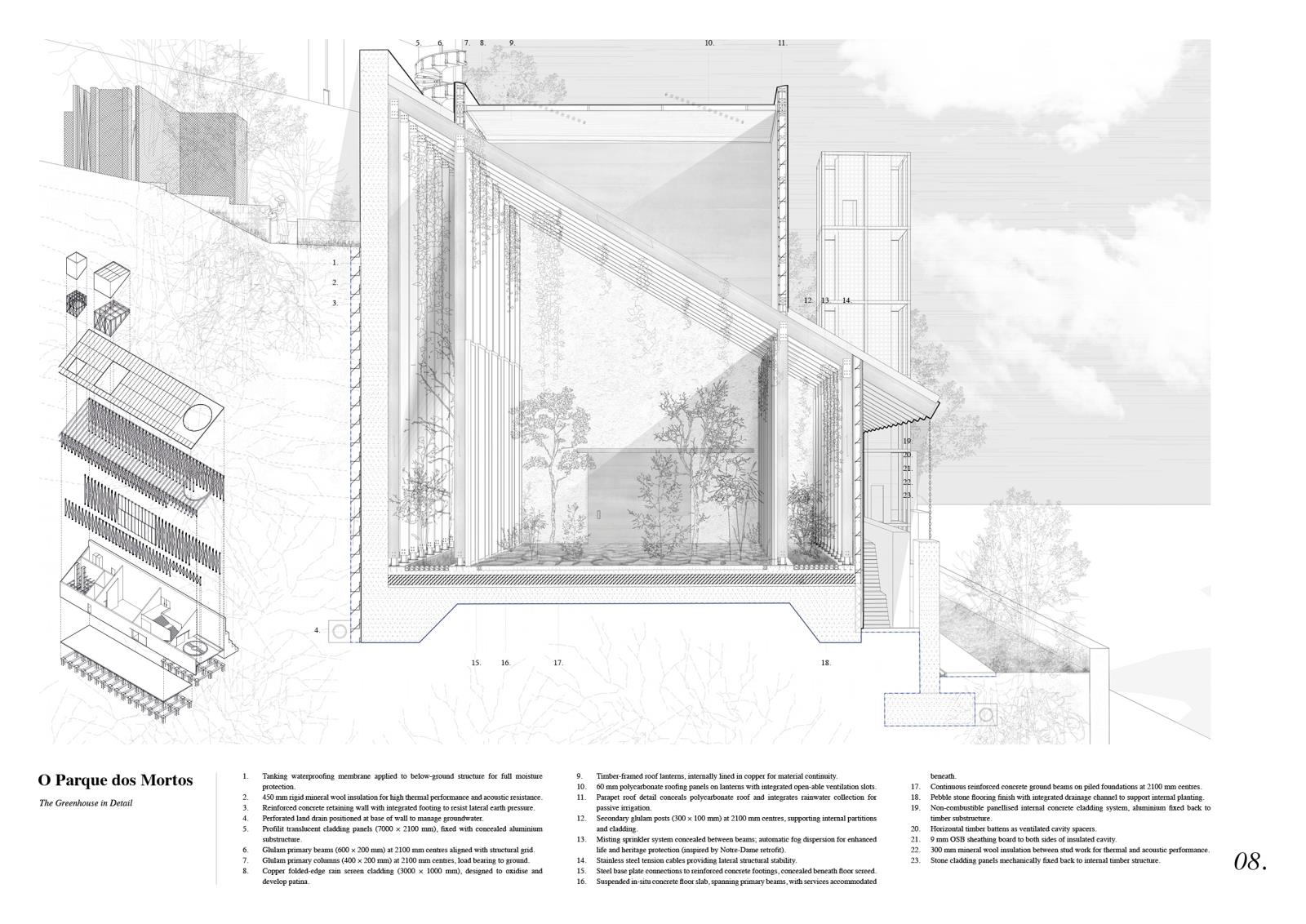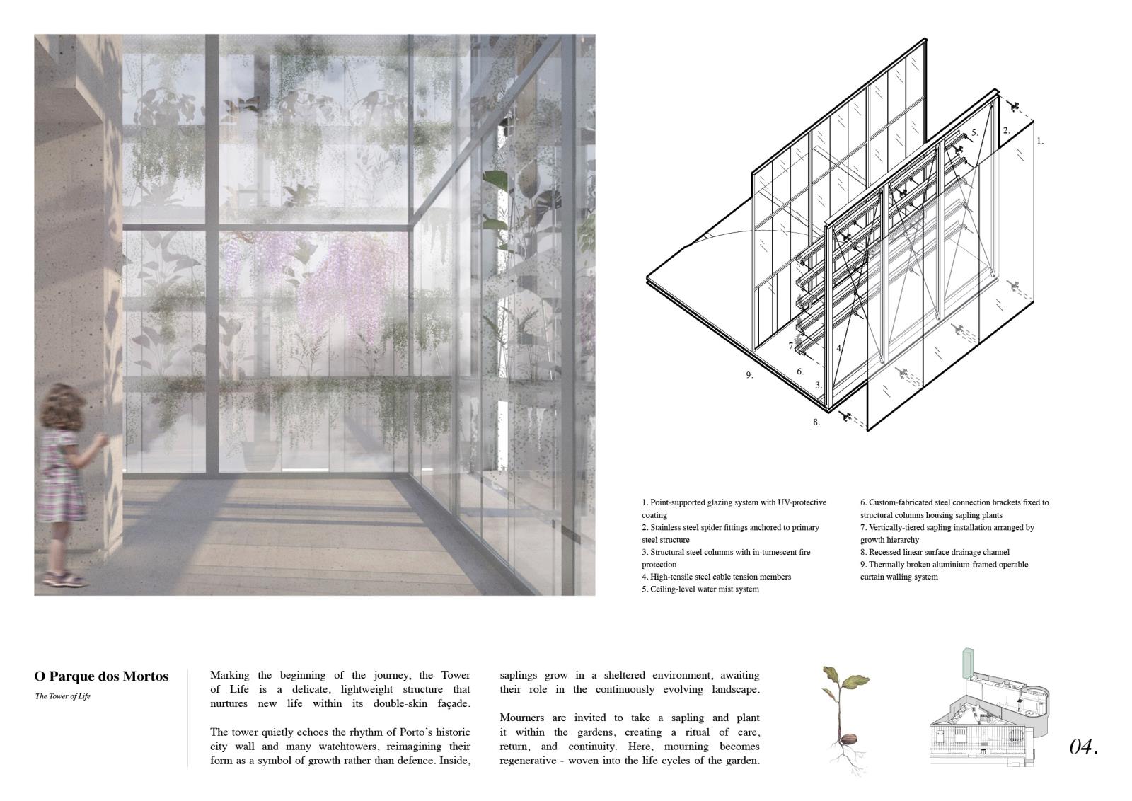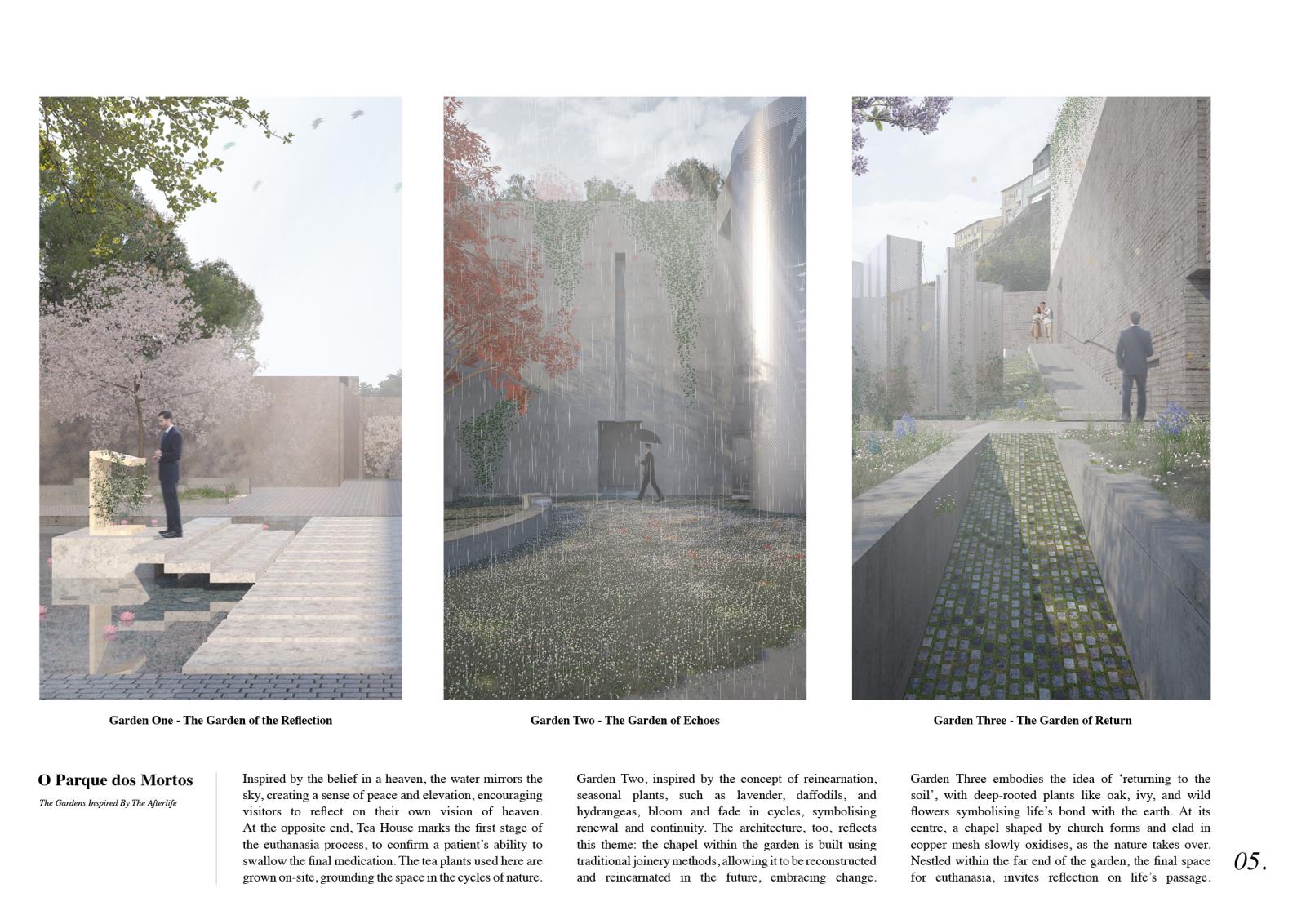 The design introduces a spine wall which frames a series of gardens where memory, care, and community coexist with spaces for euthanasia. Architecture is conceived as a living entity capable of evolving with shifting cultural attitudes towards death shaped by time, growth, and decay.