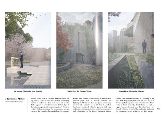 Each garden presents two architectural counterpoints with spaces for both life and death: a decaying conceptual chapel for mourning and contemplation, while on the opposite side, patients are guided through the stages towards euthanasia. This thesis argues that a new architectural approach towards mortality should be brought to the urban forefront to encourage society to better engage with the inevitability of death.