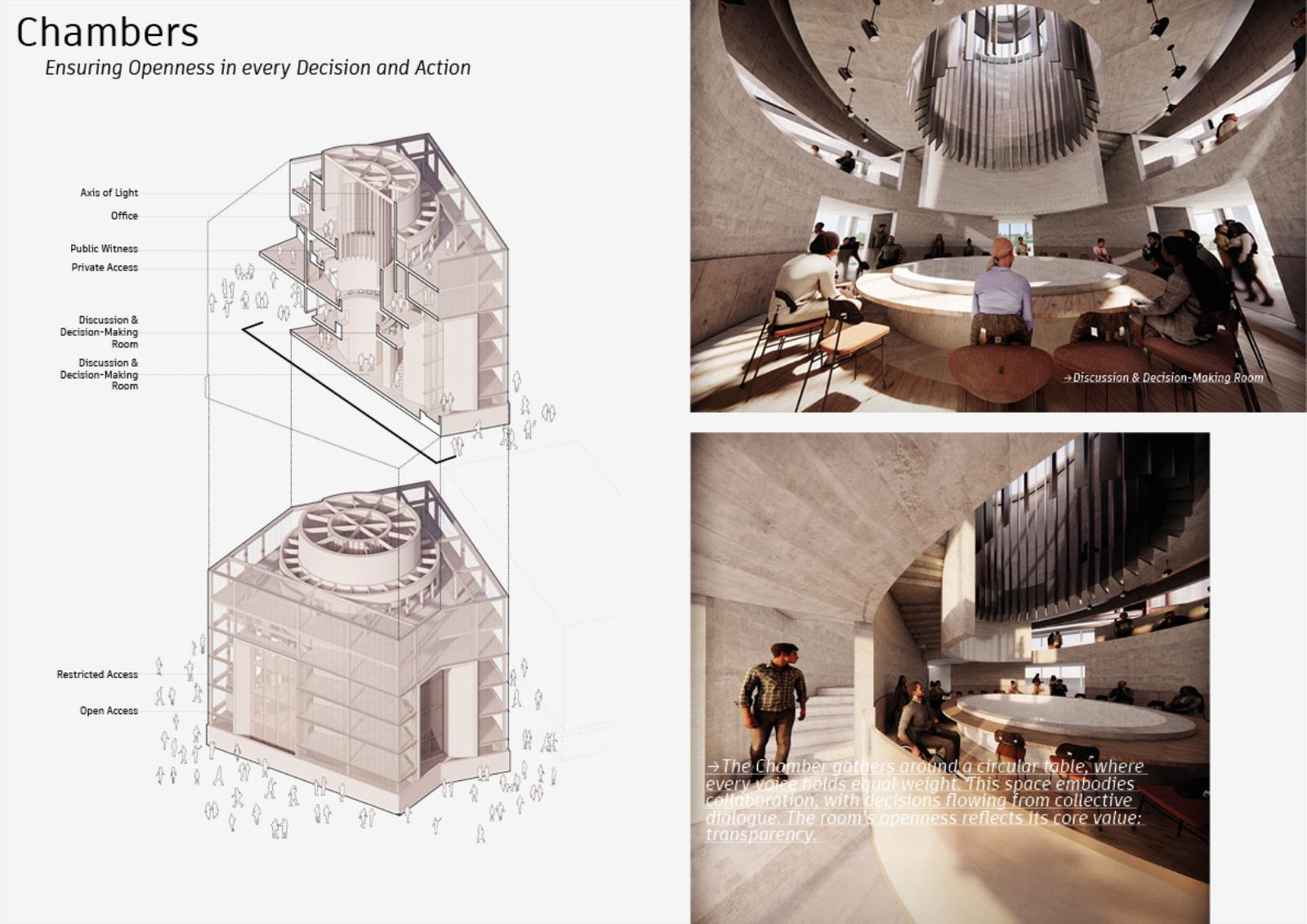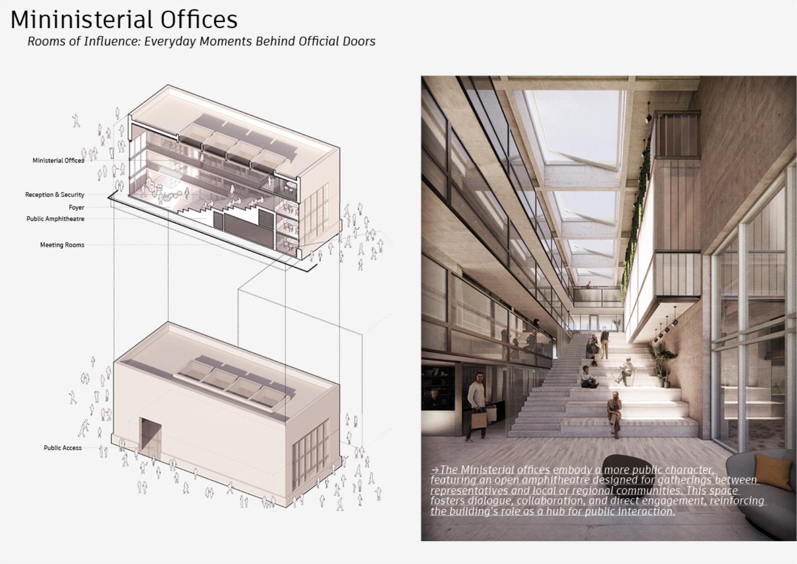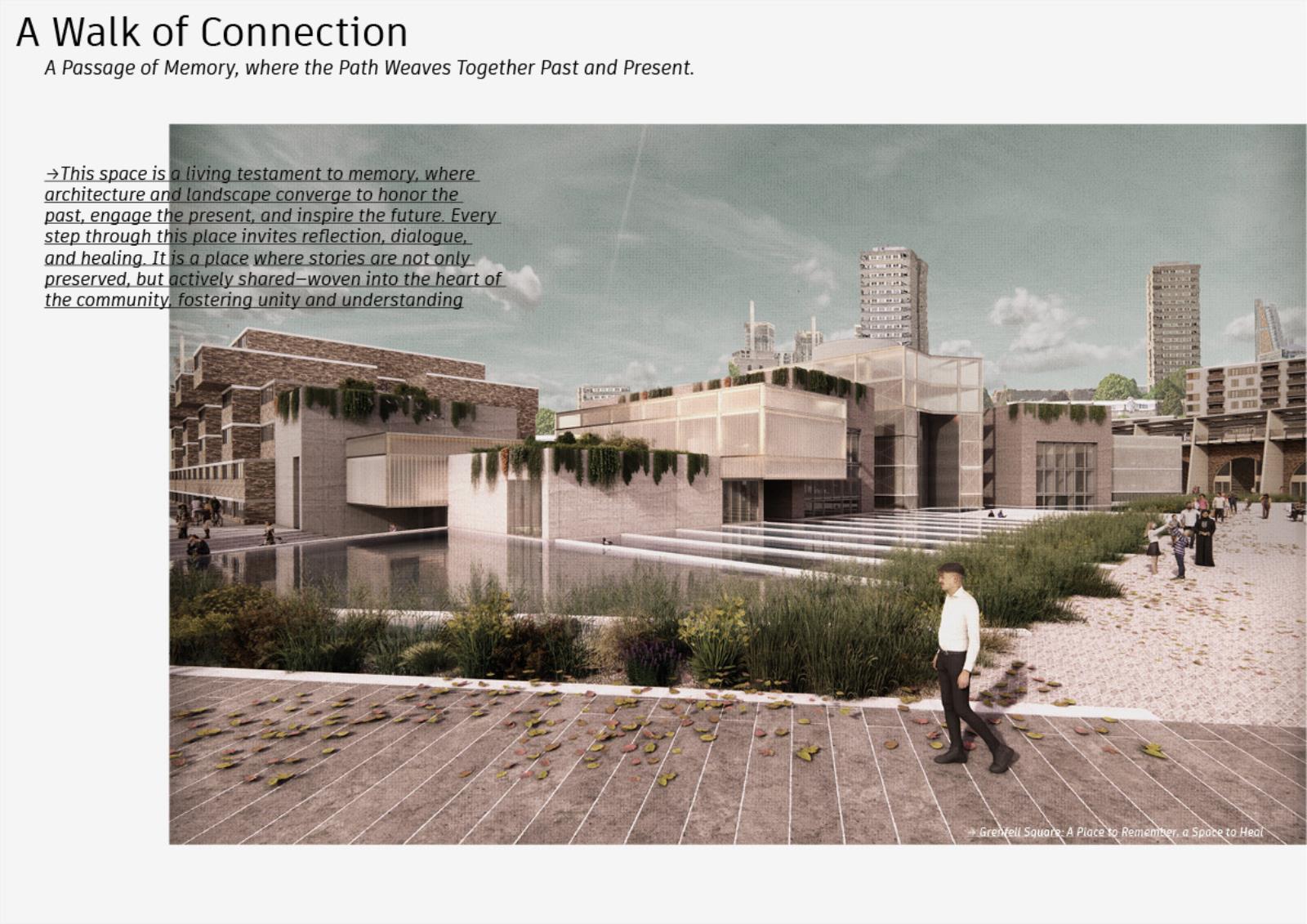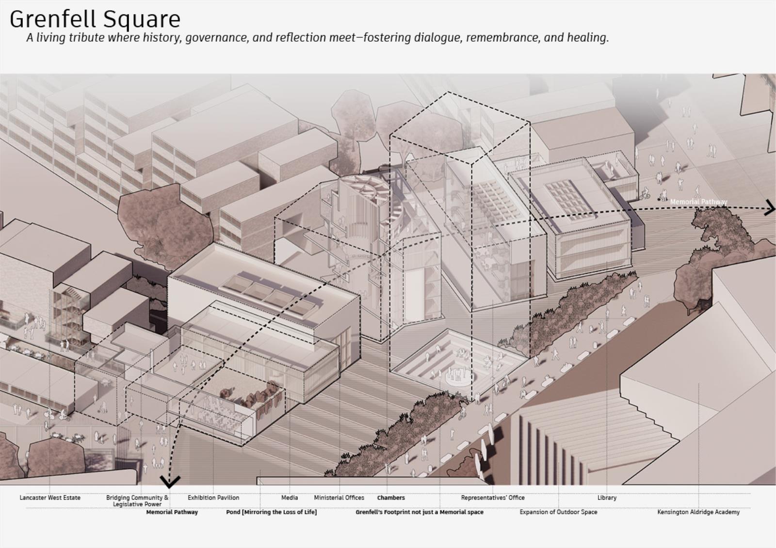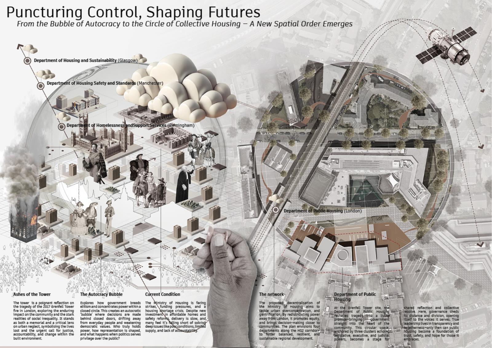 This proposal reimagines Grenfell Tower as the heart of living civic infrastructure. At its core, a decentralised Department of Public Housing redistributes along the HS2 corridor, rebalancing regional growth and embedding governance in local communities. Instead of a static monument, the masterplan forms a fractured circular landscape of floating fragments mirrored in water, symbolising injustice and collective healing. A continuous pathway connects public hubs, offices, and decision-making chambers, reinforcing transparency and inviting citizens into democracy.