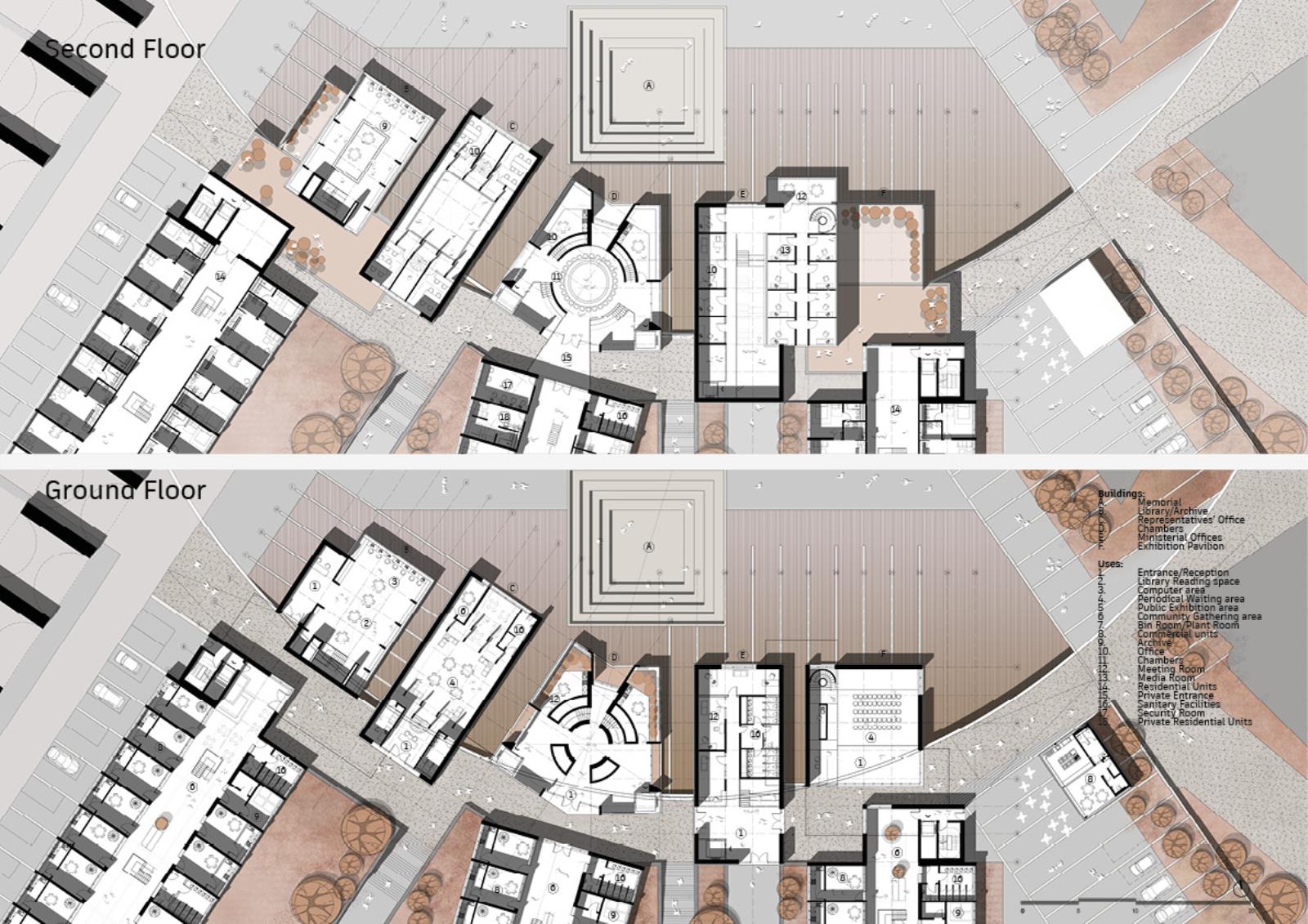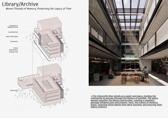 At the eastern edge, an Exhibition Pavilion links the site to local schools and leisure facilities, while a western library