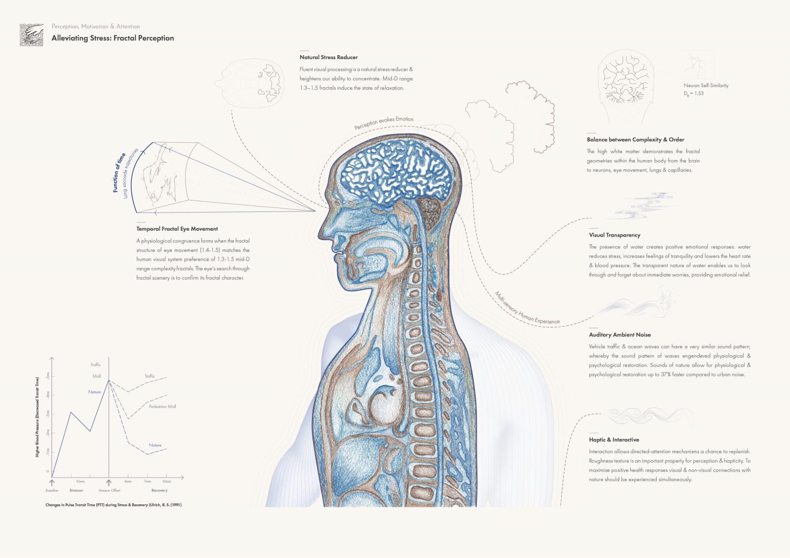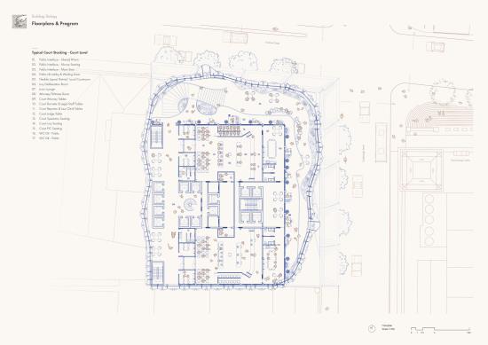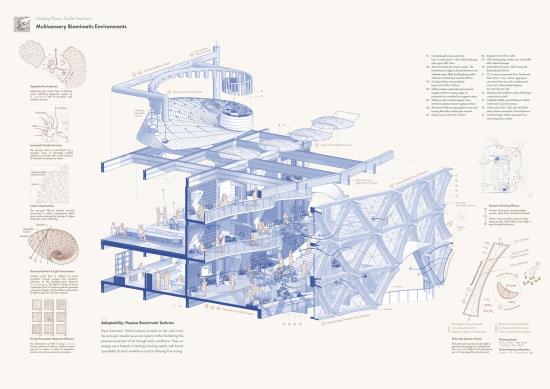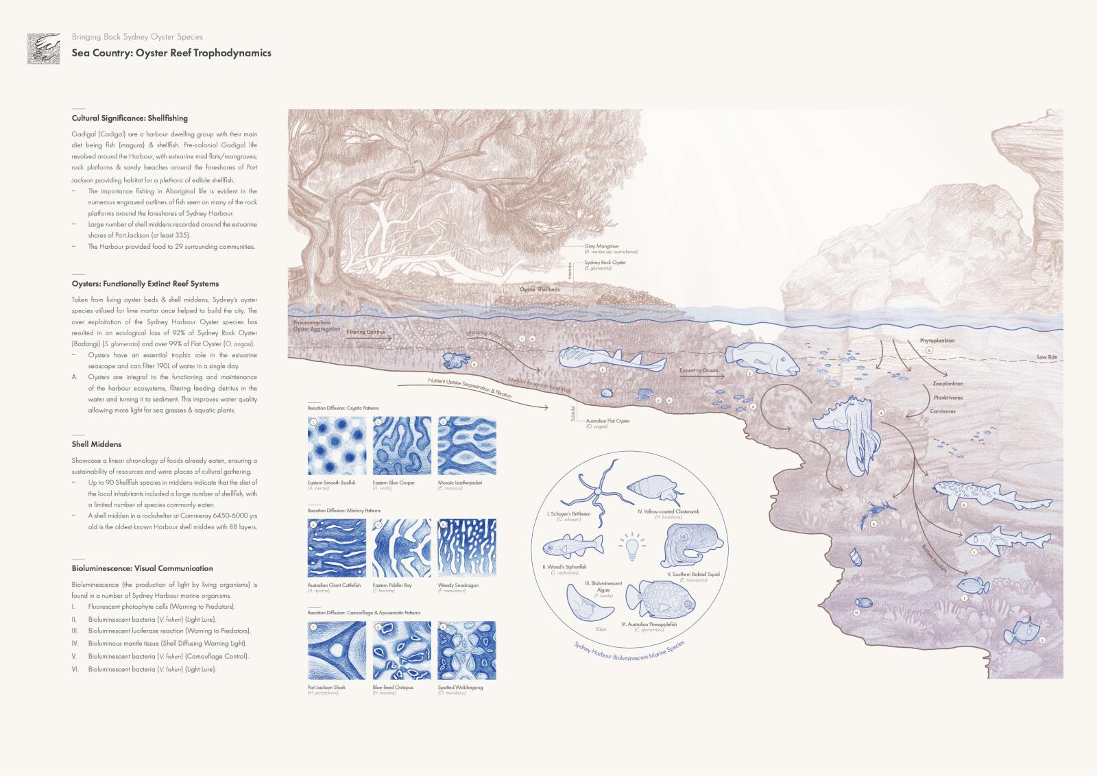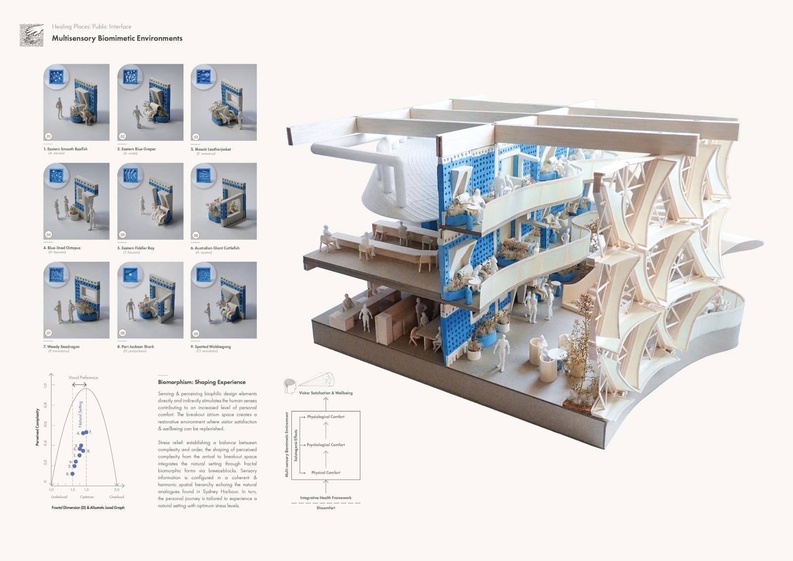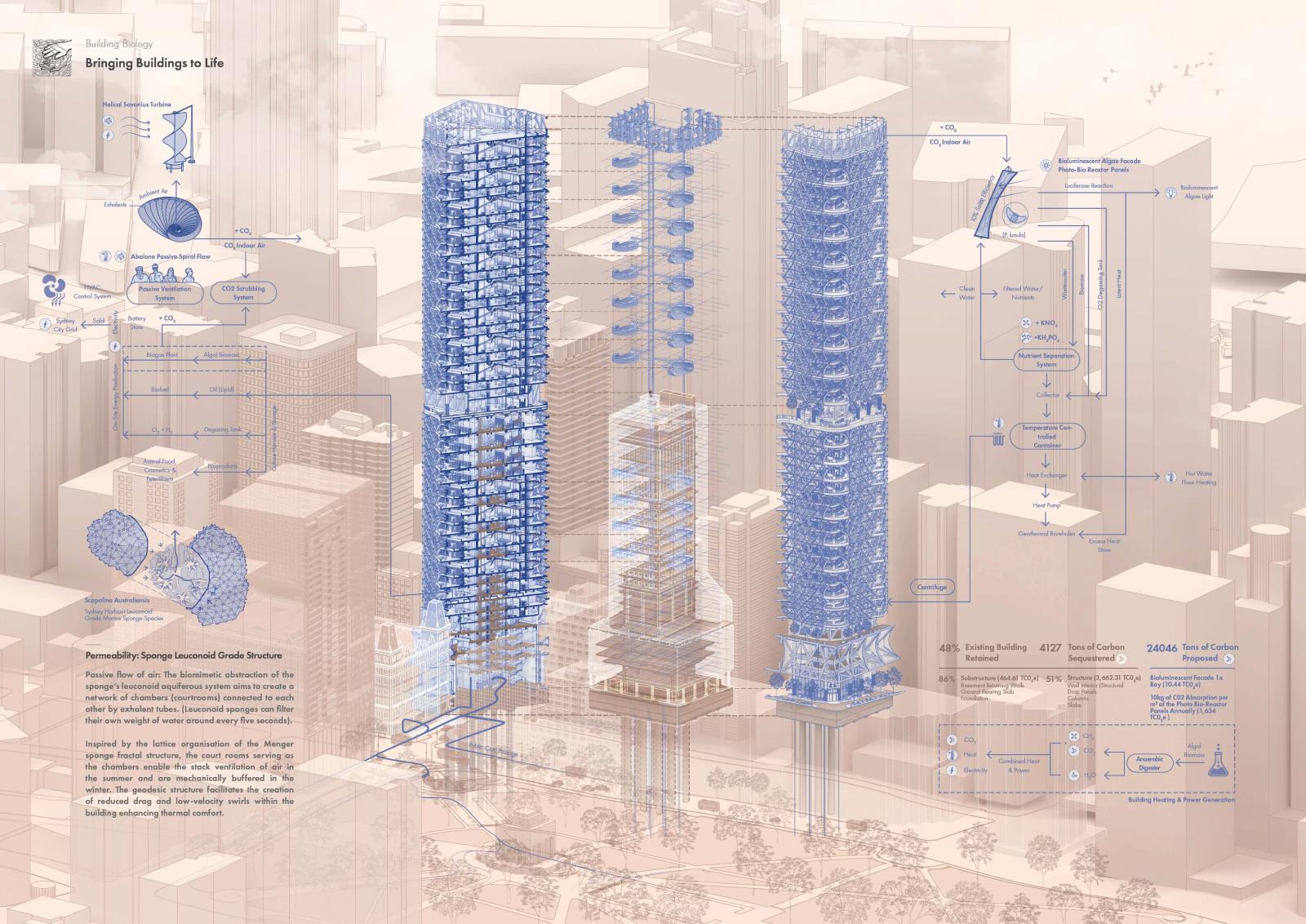 Fractal patterns reflecting of Sydney Harbour’s oyster reefs create a restorative public interface that alleviates stress and enhances well-being. Inspired by the lattice of Scopalina Australiensis, passive biomimetic systems are integrated throughout—courtrooms are connected via a sponge-like aquiferous network, while ventilation mimics the spiral flow of the Reddish-rayed Abalone. Bioluminescent Pyrocystis Lunula is embedded within photobioreactor façade panels, enabling dynamic shading and bio-energy generation.