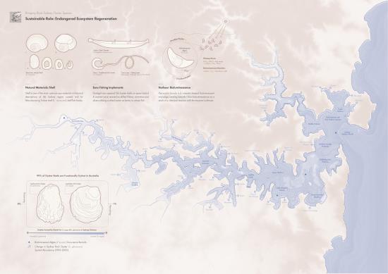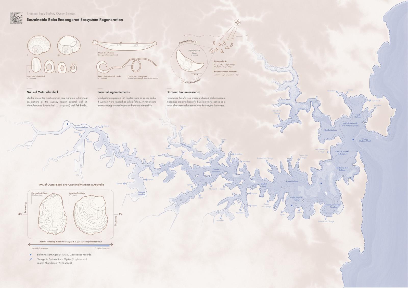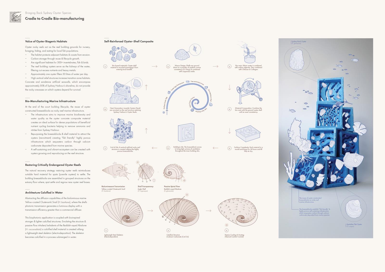 At the building’s end-of-life, oyster-constructed breezeblocks become marine infrastructure to restore biodiversity and hydrology. Emphasising its value and sustainability, oyster biogenic habitats are both indigenous dietary staples and were once utilised to build Sydney’s civic institutions.