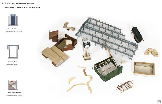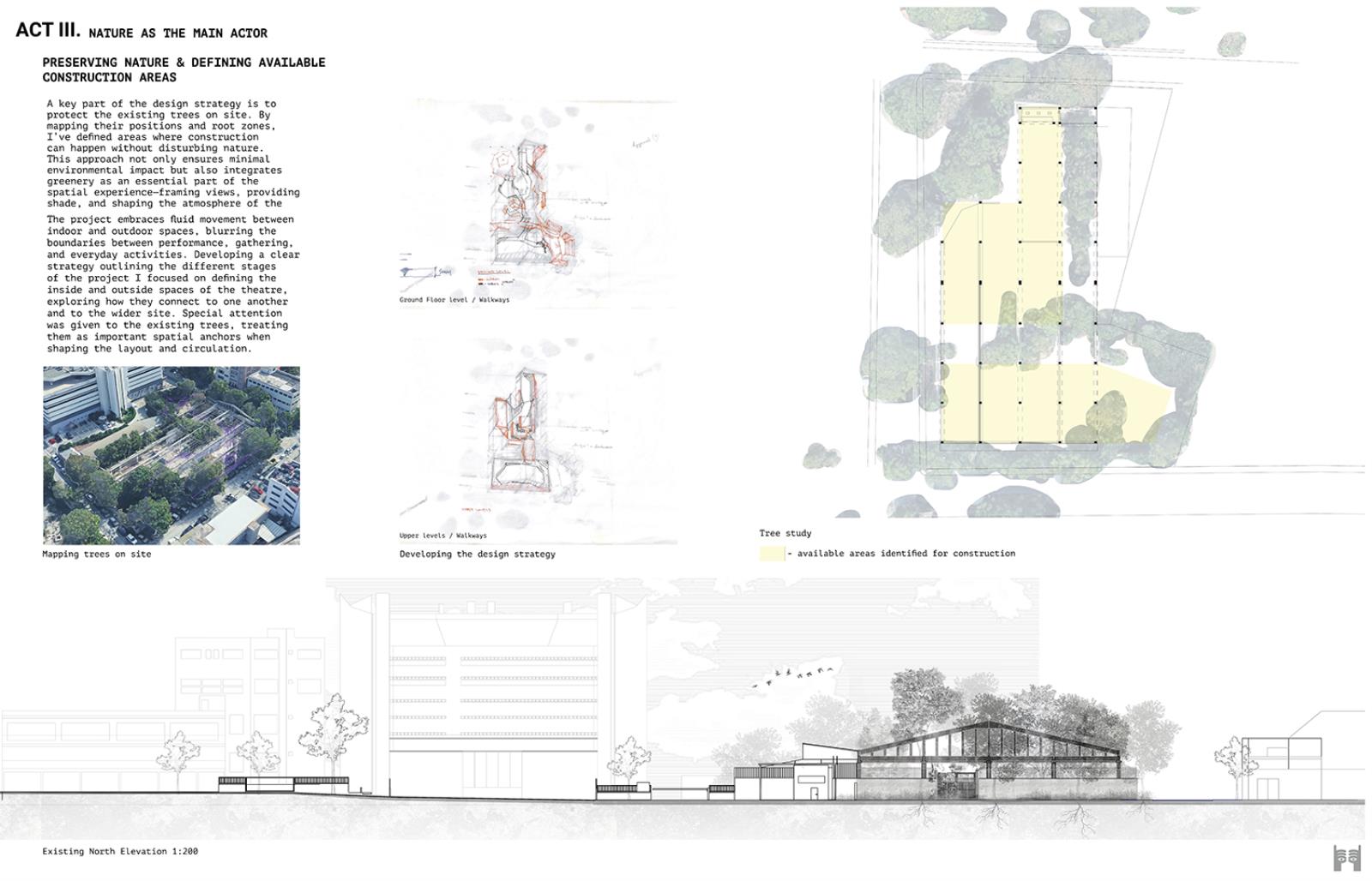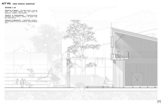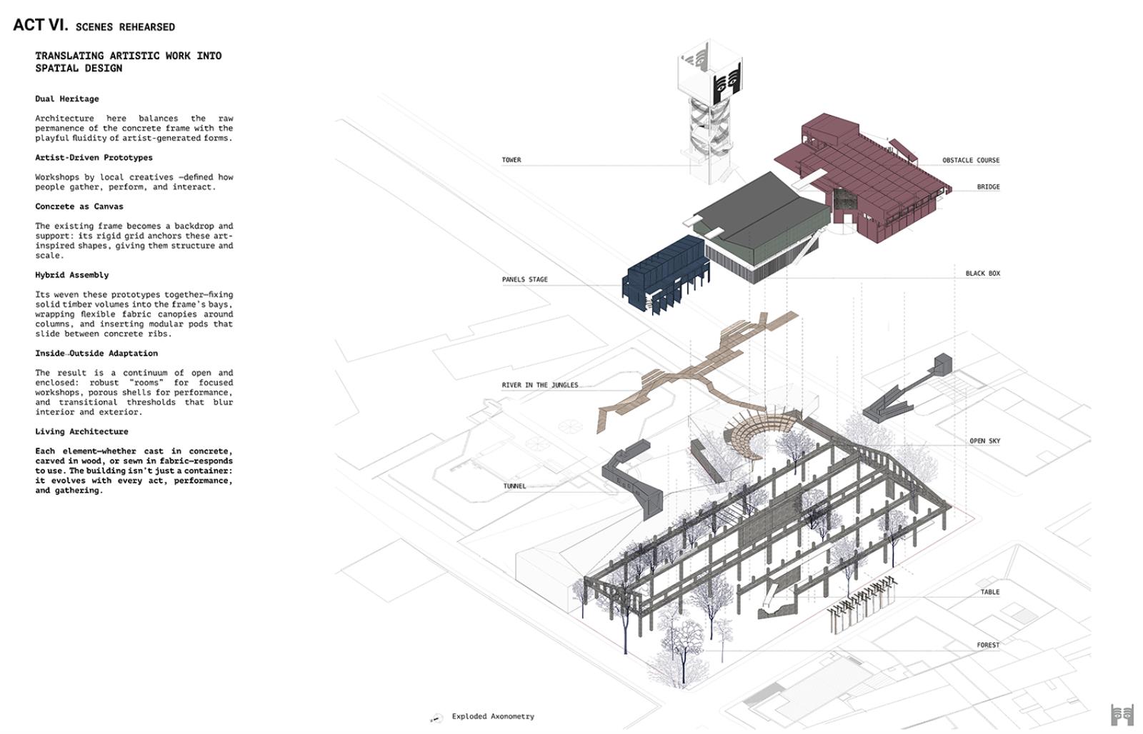 Using reclaimed materials and preserving the site’s existing trees, the design responds to its environment and community. Spaces emerge as prototypes shaped by local narratives: a tunnel, a forest, a table, a stage. The existing concrete frame is treated as a partner - framing rather than dictating new interventions.