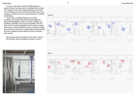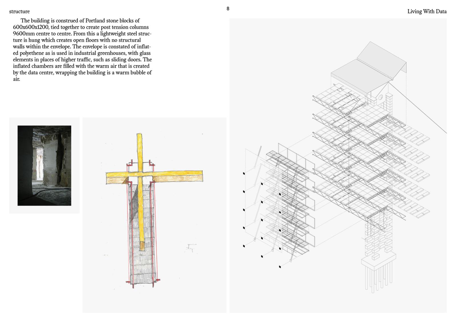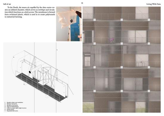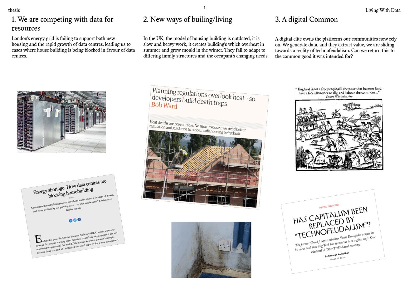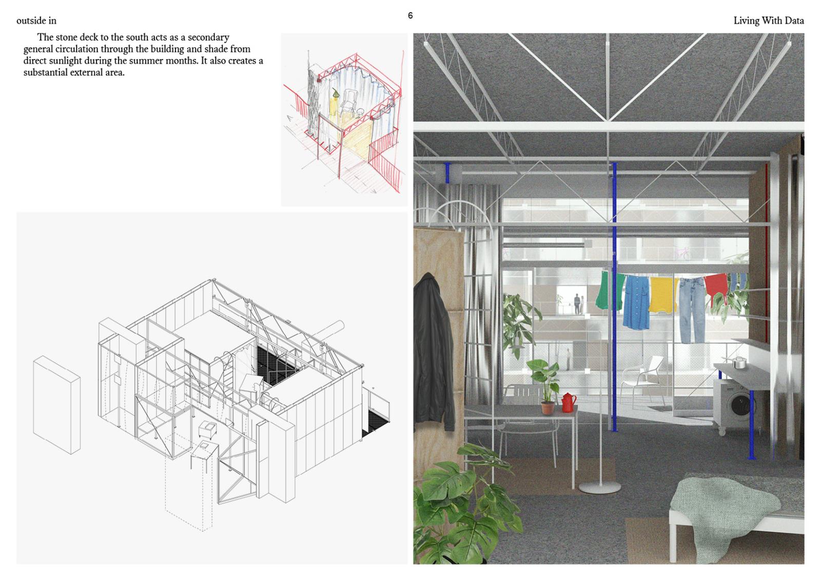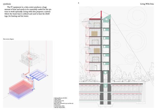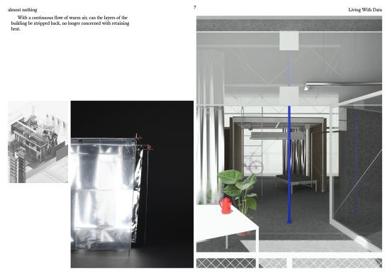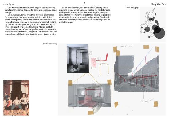 Living with Data Part 2 Project 2025 Lloyd Wyn Jackson Kingston University Kingston | UK We are competing with data for resources. In London, the energy grid is increasingly unable to support both new housing and the rapid growth of data centres, leading us to cases where house building is being blocked in favour of data centres. As data centres become an ever-greater part of our built environment, can we reframe them, not as an inevitable spectre encroaching on our cities, but as a civic asset?Set in Camden, Living with Data proposes a new model for housing, one that integrates domestic life with digital infrastructure by using the waste heat from data centres to heat homes. It offers a response to the housing crisis while rethinking how we live alongside the systems that power our digital lives. The project proposes a data centre which is publicly owned, forming part of a new digital commons that serves the communities it sits within. Living with Data reclaims both the physical space of the city and its digital space- in one breath. Tutor(s) Nicholas Lobo Brennan Astrid Smitham