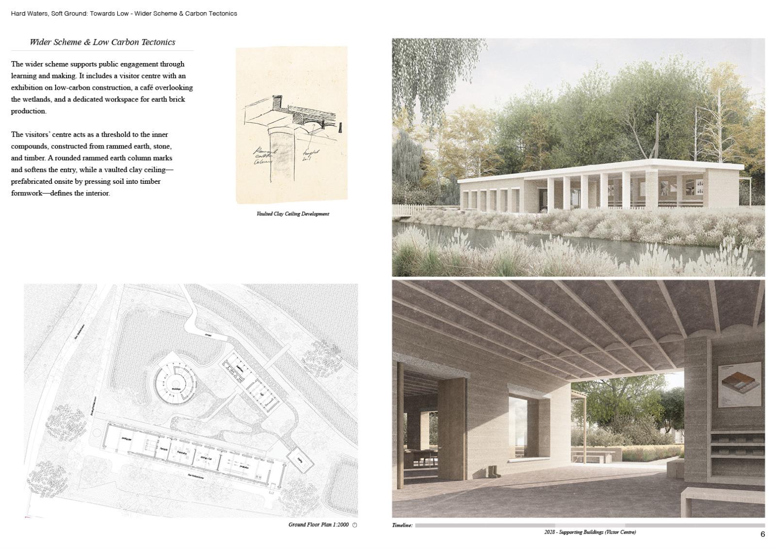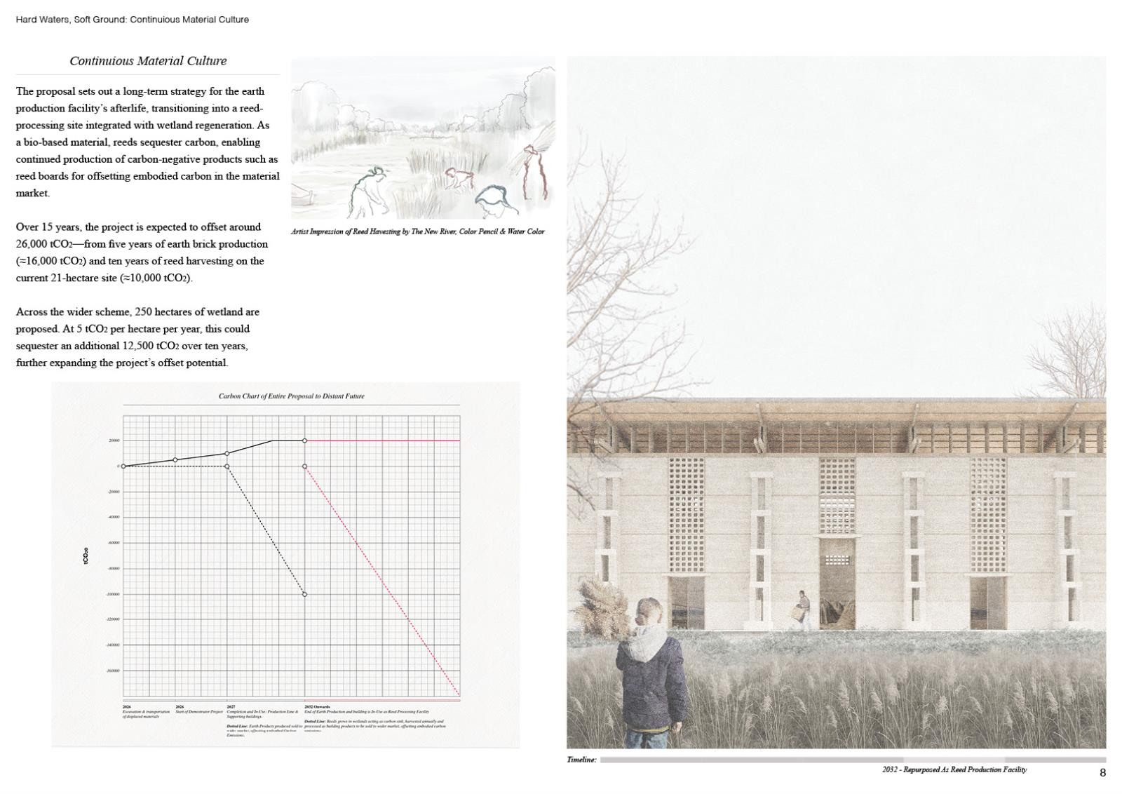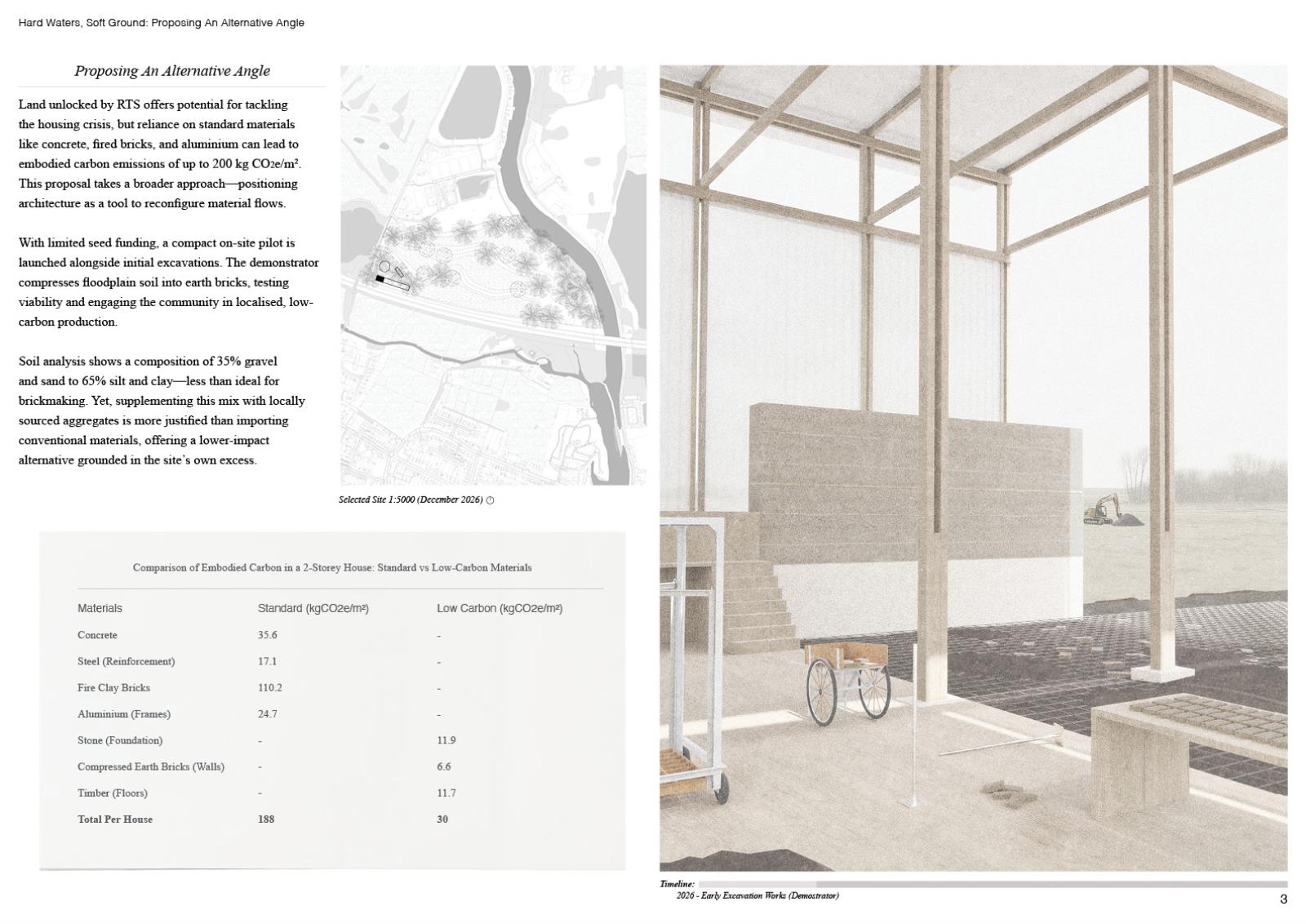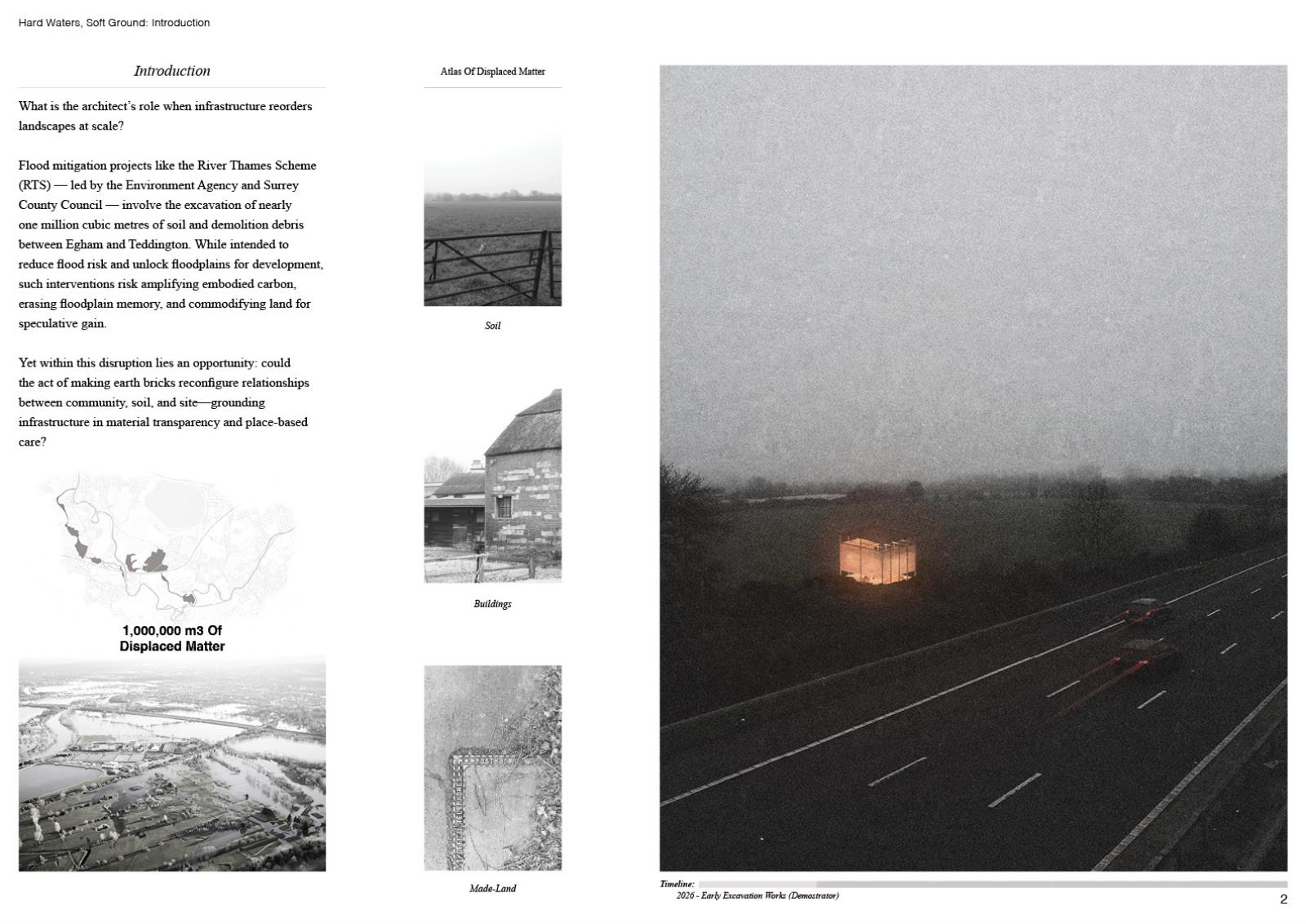 Hard Waters, Soft Ground Part 2 Project 2025 Jordon Lim Royal College of Art | UK Hard Waters, Soft Ground responds to the environmental and cultural challenges posed by large-scale flood infrastructure, using the River Thames Scheme as its context. As nearly one million cubic metres of soil are excavated between Egham and Teddington, this project reimagines the spoil not as waste, but as a resource for low-carbon construction. A temporary demonstrator facility is proposed within the new flood relief channel— processing excavated earth and demolition waste into compressed earth bricks and rammed earth walls.The aim is twofold: to reduce embodied carbon through circular material flows, and to engage local stakeholders in a hands-on process of making. The facility functions as both a testing ground for earth construction and a space for community learning—linking people to place through material practice.Over time, the site evolves into a reed- processing centre, aligning with planned wetland regeneration. Reeds, as carbon- sequestering bioproducts, offer ongoing environmental and economic value. Rather than erase the memory of the floodplain, the project honours it—tracing a cycle of excavation, production, and ecological renewal.Through this work, the architect’s role expands: from architects to steward, organiser, and collaborator—foregrounding low-carbon methods, cultural continuity, and shared responsibility in shaping future landscapes. Tutor(s) Amin Taha