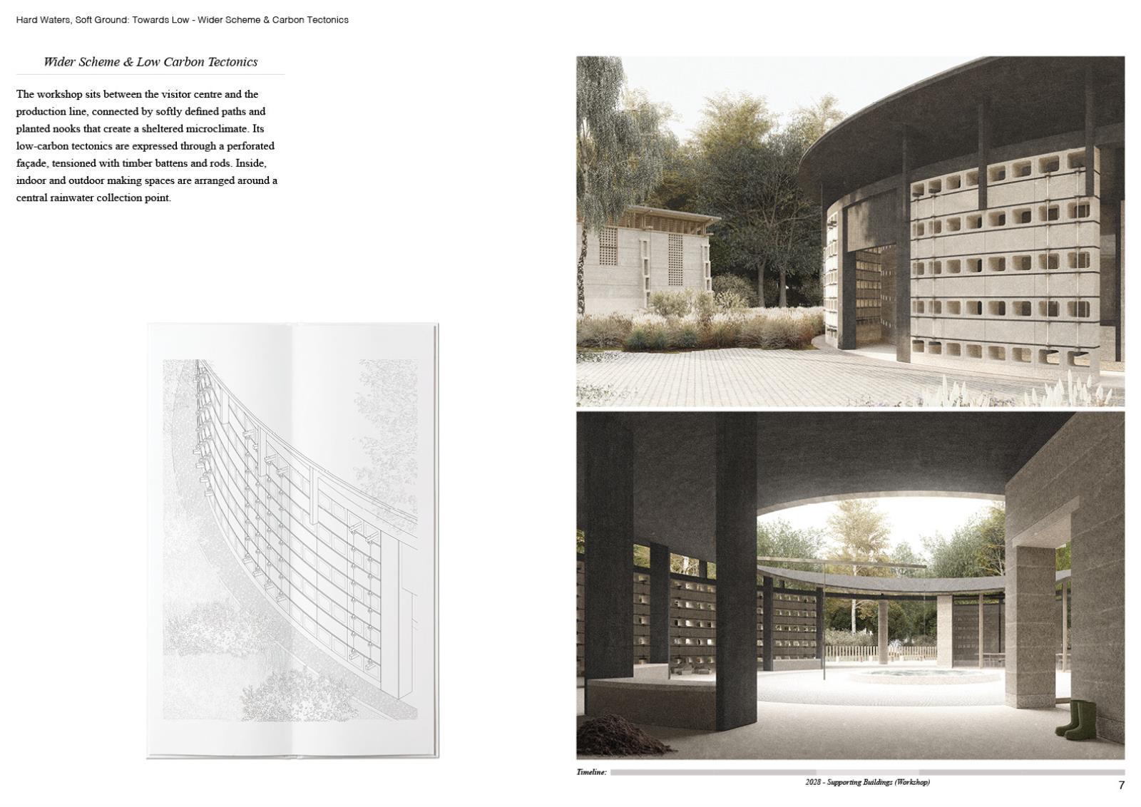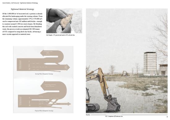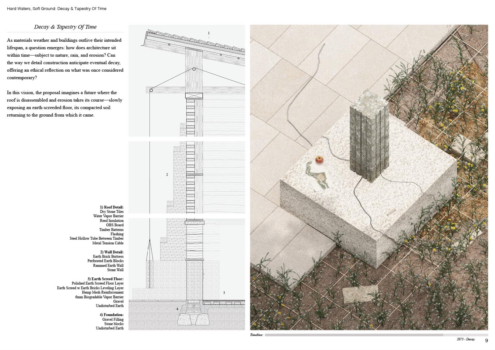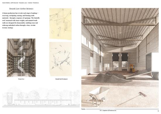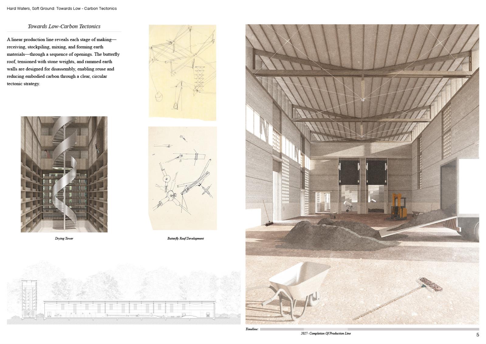 Hard Waters, Soft Ground Part 2 Project 2025 Jordon Lim Royal College of Art | UK Hard Waters, Soft Ground responds to the environmental and cultural challenges posed by large-scale flood infrastructure, using the River Thames Scheme as its context. As nearly one million cubic metres of soil are excavated between Egham and Teddington, this project reimagines the spoil not as waste, but as a resource for low-carbon construction. A temporary demonstrator facility is proposed within the new flood relief channel— processing excavated earth and demolition waste into compressed earth bricks and rammed earth walls.The aim is twofold: to reduce embodied carbon through circular material flows, and to engage local stakeholders in a hands-on process of making. The facility functions as both a testing ground for earth construction and a space for community learning—linking people to place through material practice.Over time, the site evolves into a reed- processing centre, aligning with planned wetland regeneration. Reeds, as carbon- sequestering bioproducts, offer ongoing environmental and economic value. Rather than erase the memory of the floodplain, the project honours it—tracing a cycle of excavation, production, and ecological renewal.Through this work, the architect’s role expands: from architects to steward, organiser, and collaborator—foregrounding low-carbon methods, cultural continuity, and shared responsibility in shaping future landscapes. Tutor(s) Amin Taha