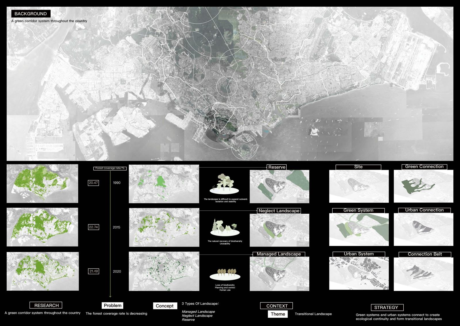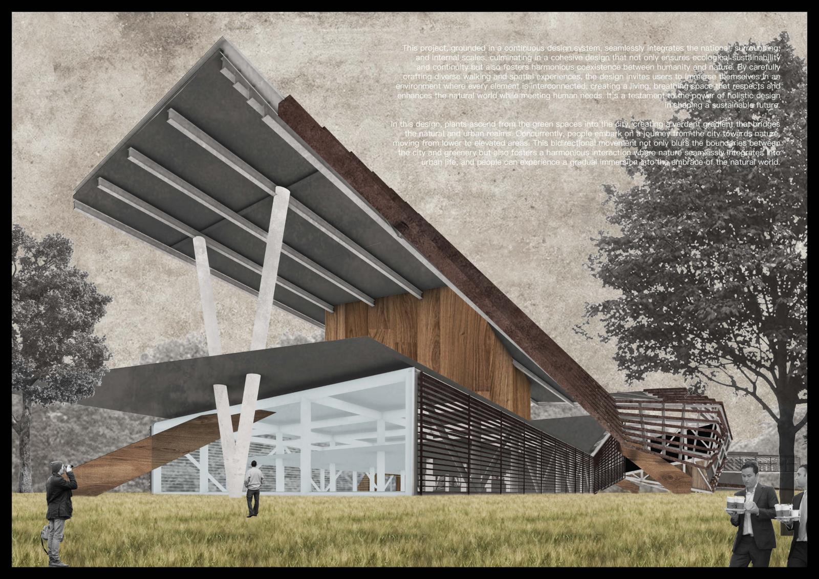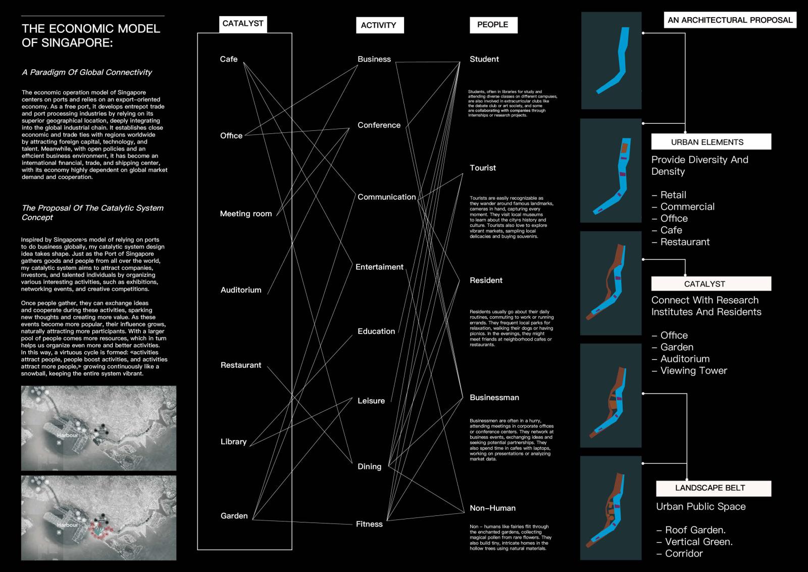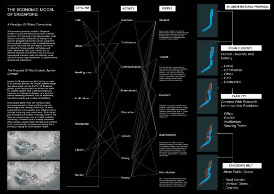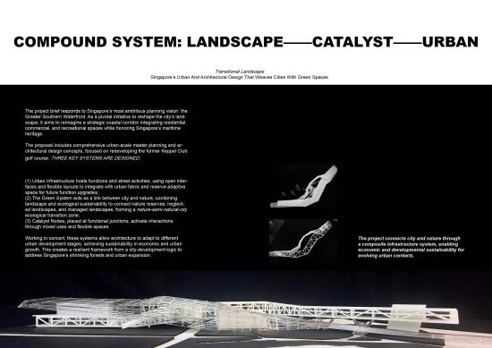 Compound System: Landscape — Catalyst — Urban Part 2 Project 2025 Huajin Wang Xi'an Jiaotong-Liverpool University | China The project brief responds to Singapore’s most ambitious planning vision: the Greater Southern Waterfront. As a pivotal initiative to reshape the city’s landscape, it aims to reimagine a strategic coastal corridor integrating residential, commercial, and recreational spaces while honoring Singapore’s maritime heritage.The proposal includes comprehensive urban-scale master planning and architectural design concepts, focused on redeveloping the former Keppel Club golf course. The project connects city and nature through a composite infrastructure system, enabling economic and developmental sustainability for evolving urban contexts. Three key systems are designed: 1) Urban infrastructure hosts functions and street activities, using open interfaces and flexible layouts to integrate with urban fabric and reserve adaptive space for future function upgrades; 2) The green system acts as a link between city and nature, combining landscape and ecological sustainability to connect nature reserves, neglected landscapes, and managed landscapes, forming a “nature-semi-natural-city” ecological transition zone;3) Catalyst nodes, placed at functional junctions, activate interactions through mixed uses and flexible spaces. Working in concert, these systems allow architecture to adapt to different urban development stages, achieving sustainability in economic and urban growth. This creates a resilient framework from a city-development logic to address Singapore’s shrinking forests and urban expansion. Tutor(s) Mia Tedjosaputro
