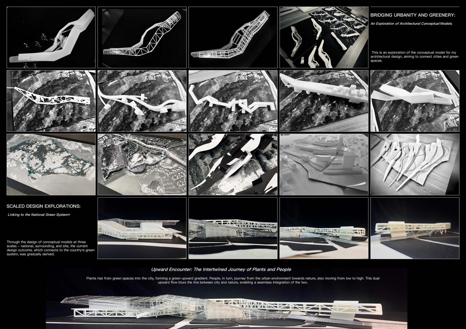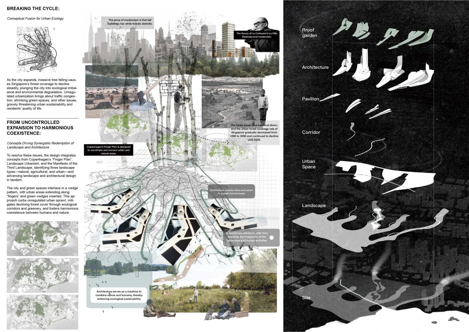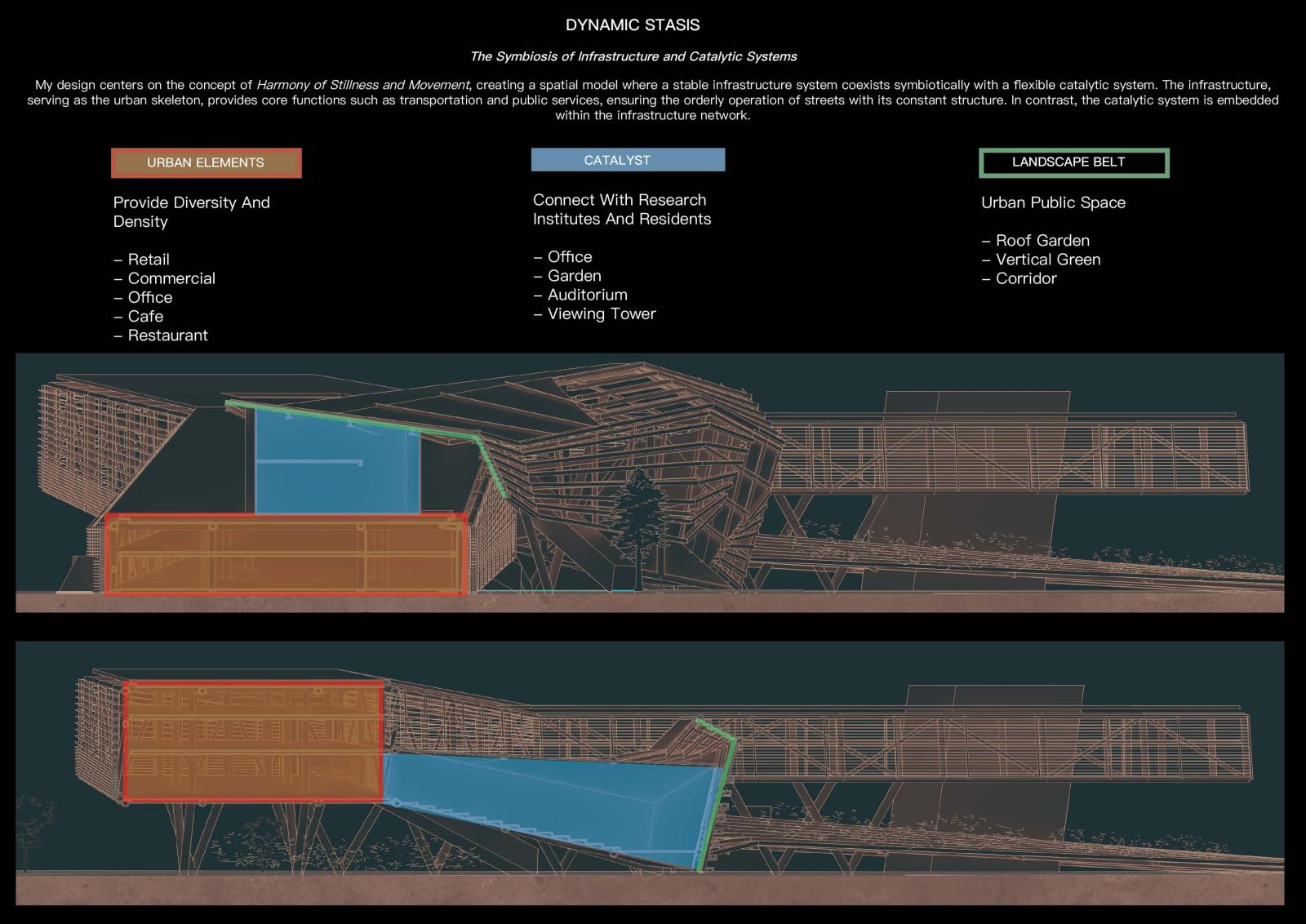 Compound System: Landscape — Catalyst — Urban Part 2 Project 2025 Huajin Wang Xi'an Jiaotong-Liverpool University | China The project brief responds to Singapore’s most ambitious planning vision: the Greater Southern Waterfront. As a pivotal initiative to reshape the city’s landscape, it aims to reimagine a strategic coastal corridor integrating residential, commercial, and recreational spaces while honoring Singapore’s maritime heritage.The proposal includes comprehensive urban-scale master planning and architectural design concepts, focused on redeveloping the former Keppel Club golf course. The project connects city and nature through a composite infrastructure system, enabling economic and developmental sustainability for evolving urban contexts. Three key systems are designed: 1) Urban infrastructure hosts functions and street activities, using open interfaces and flexible layouts to integrate with urban fabric and reserve adaptive space for future function upgrades; 2) The green system acts as a link between city and nature, combining landscape and ecological sustainability to connect nature reserves, neglected landscapes, and managed landscapes, forming a “nature-semi-natural-city” ecological transition zone;3) Catalyst nodes, placed at functional junctions, activate interactions through mixed uses and flexible spaces. Working in concert, these systems allow architecture to adapt to different urban development stages, achieving sustainability in economic and urban growth. This creates a resilient framework from a city-development logic to address Singapore’s shrinking forests and urban expansion. Tutor(s) Mia Tedjosaputro