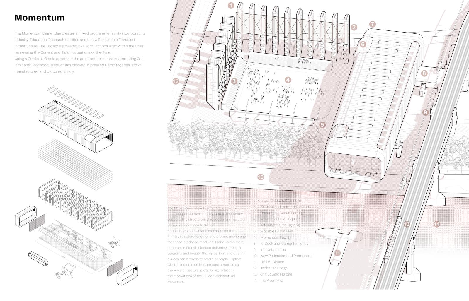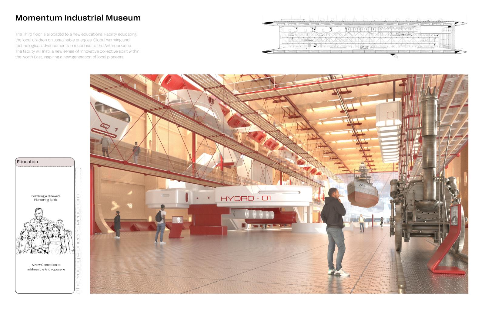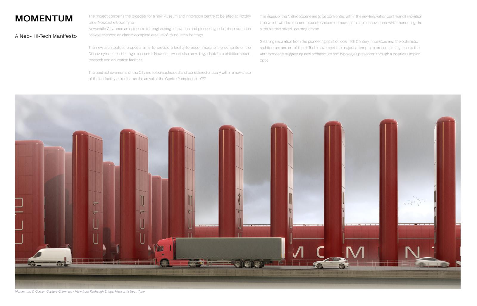 Momentum – A Neo-Hi-Tech Manifesto Part 2 Project 2025 Lee Thackray Northumbria University Newcastle | UK The project concerns the proposal for a new Museum and Innovation centre to be sited at Pottery Lane, Newcastle Upon Tyne. Newcastle City, once an epicentre for engineering, innovation and pioneering Industrial production has experienced an almost complete erasure of its industrial heritage. The new architectural proposal aims to provide a facility to accommodate the contents of the Discovery Industrial Heritage museum in Newcastle whilst also providing adaptable exhibition space, research and education facilities. The past achievements of the City are to be applauded and considered critically within a new state of the art facility, as radical as the arrival of the Centre Pompidou in 1977. The issues of the Anthropocene are to be confronted within the new Innovation centre and Innovation labs which will develop and educate visitors on new sustainable innovations, whilst honouring the site’s historic mixed-use programme.Gleaning inspiration from the pioneering spirit of local 19th Century Innovators and the optimistic architecture and art of the Hi-Tech movement the project attempts to present a mitigation to the Anthropocene, suggesting new architecture and typologies presented through a positive, Utopian optic. Tutor(s) Paul Jones