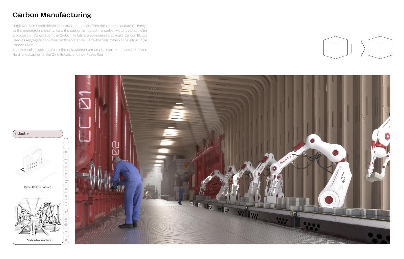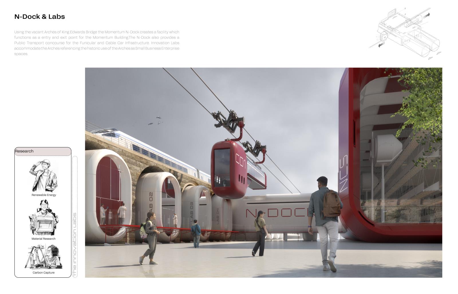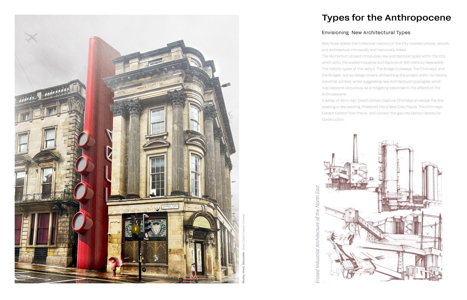 Momentum – A Neo-Hi-Tech Manifesto Part 2 Project 2025 Lee Thackray Northumbria University Newcastle | UK The project concerns the proposal for a new Museum and Innovation centre to be sited at Pottery Lane, Newcastle Upon Tyne. Newcastle City, once an epicentre for engineering, innovation and pioneering Industrial production has experienced an almost complete erasure of its industrial heritage. The new architectural proposal aims to provide a facility to accommodate the contents of the Discovery Industrial Heritage museum in Newcastle whilst also providing adaptable exhibition space, research and education facilities. The past achievements of the City are to be applauded and considered critically within a new state of the art facility, as radical as the arrival of the Centre Pompidou in 1977. The issues of the Anthropocene are to be confronted within the new Innovation centre and Innovation labs which will develop and educate visitors on new sustainable innovations, whilst honouring the site’s historic mixed-use programme.Gleaning inspiration from the pioneering spirit of local 19th Century Innovators and the optimistic architecture and art of the Hi-Tech movement the project attempts to present a mitigation to the Anthropocene, suggesting new architecture and typologies presented through a positive, Utopian optic. Tutor(s) Paul Jones