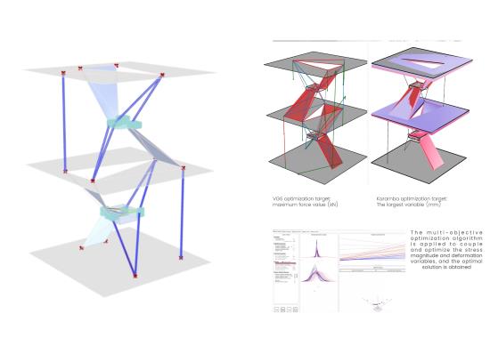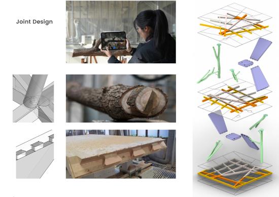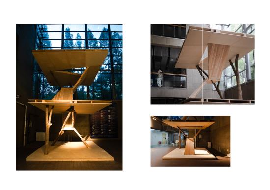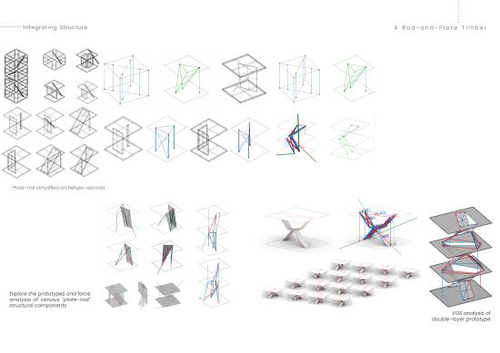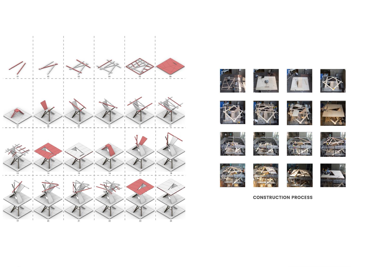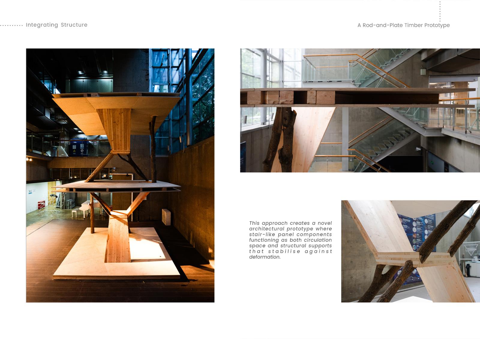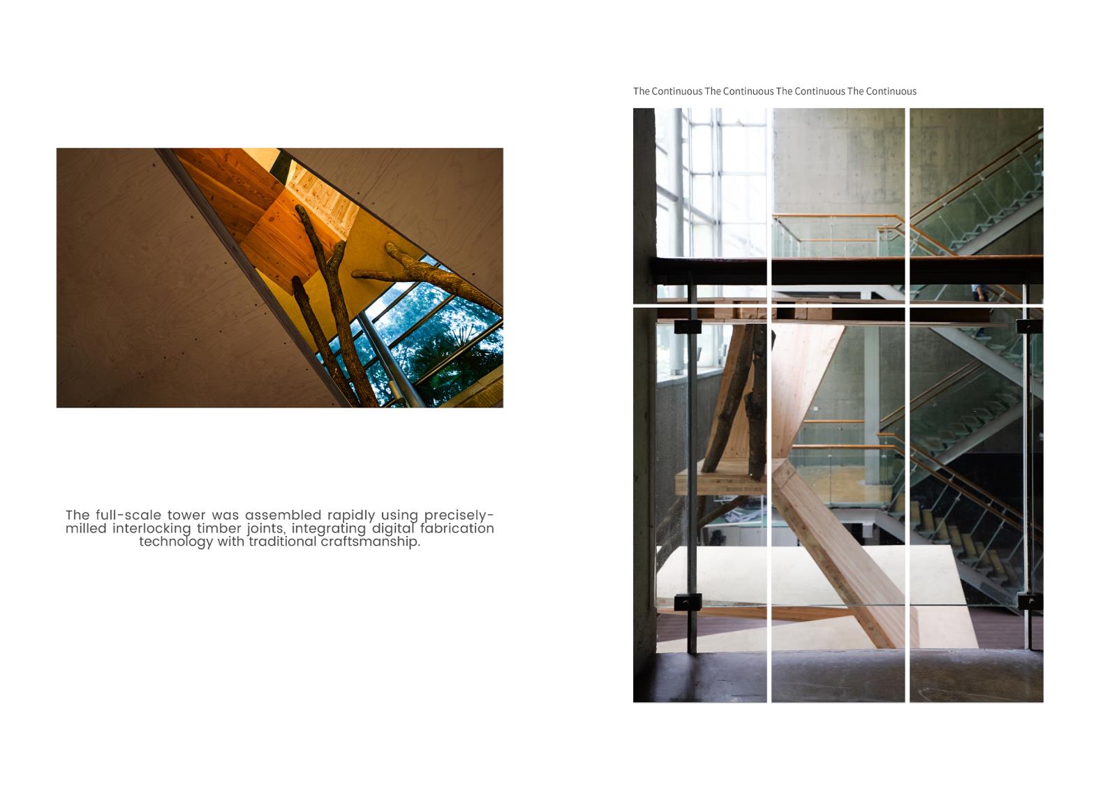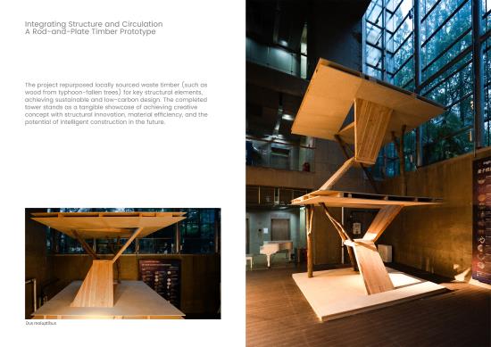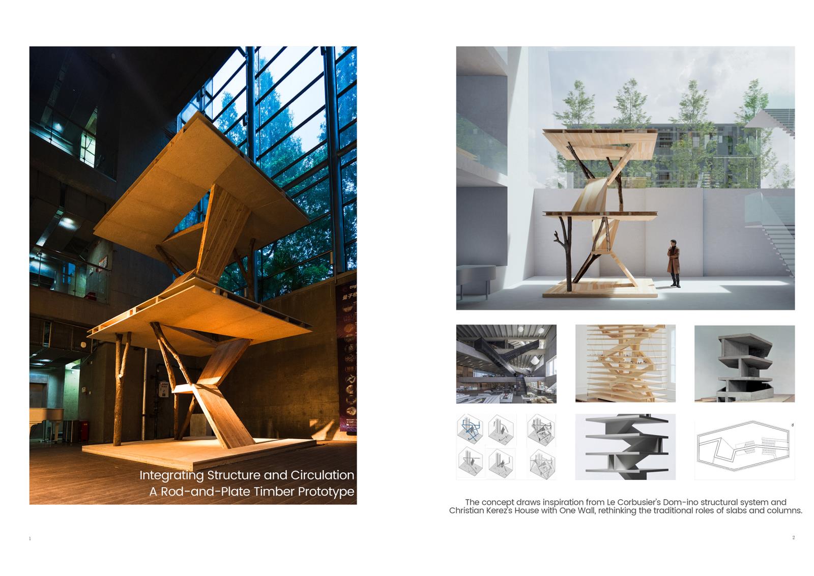 China Belgium (Walloon) Government to Government Science and Technology Part 2 Project 2025 Dajun YuanChenghao WuCexin DingZhirui FanYiting SunYalei Zhu Tongji University | China Our project is a two-storey, 5.6m-tall experimental timber pavilion that explores an innovative structural system. The concept draws inspiration from Le Corbusier’s Dom-ino structural system and Christian Kerez’s House with One Wall, rethinking the traditional roles of slabs and columns. The design aims to use the staircase itself as a primary structural support, thereby minimizing the need for vertical columns. This approach creates a novel architectural prototype where stair-like panel components functioning as both circulation space and structural supports that stabilise against deformation. With the utilisation of advanced structural simulation and robotic fabrication, we realized a statically determinate structure with minimal elements. The full-scale tower was assembled rapidly using precisely- milled interlocking timber joints, integrating digital fabrication technology with traditional craftsmanship. The project repurposed locally sourced waste timber (such as wood from typhoon-fallen trees) for key structural elements, achieving sustainable and low-carbon design.The completed tower stands as a tangible showcase of achieving creative concept with structural innovation, material efficiency, and the potential of intelligent construction in the future. Tutor(s) Hua Chai Sylvain Rasneur Philip F Yuan Denis Zastavni