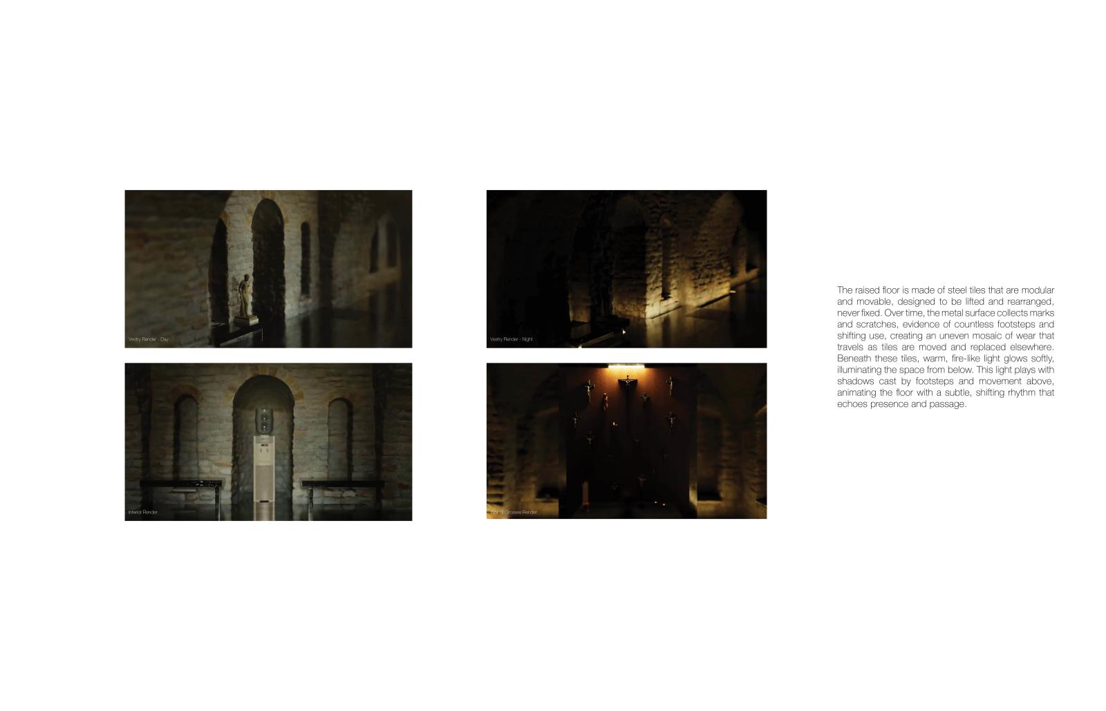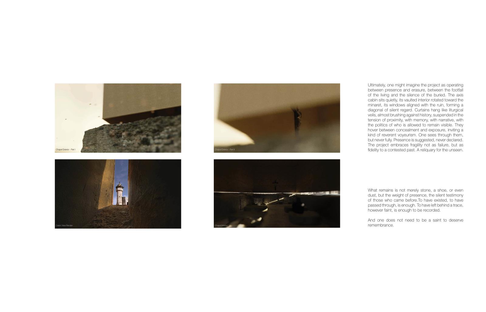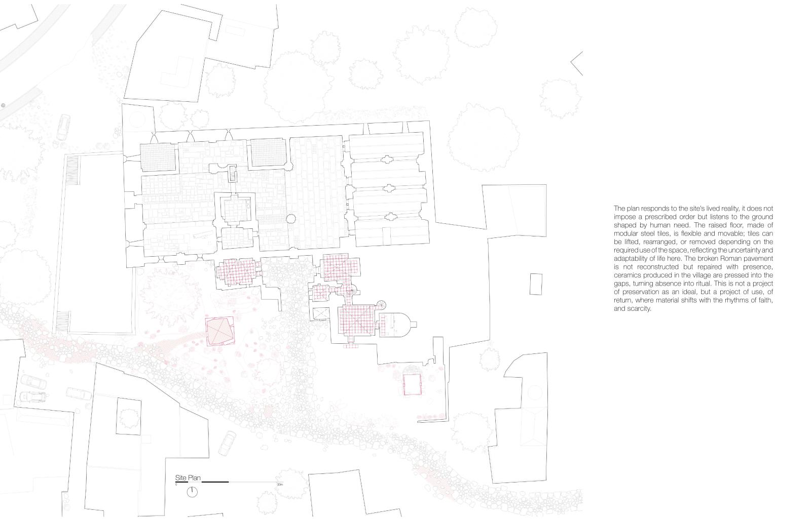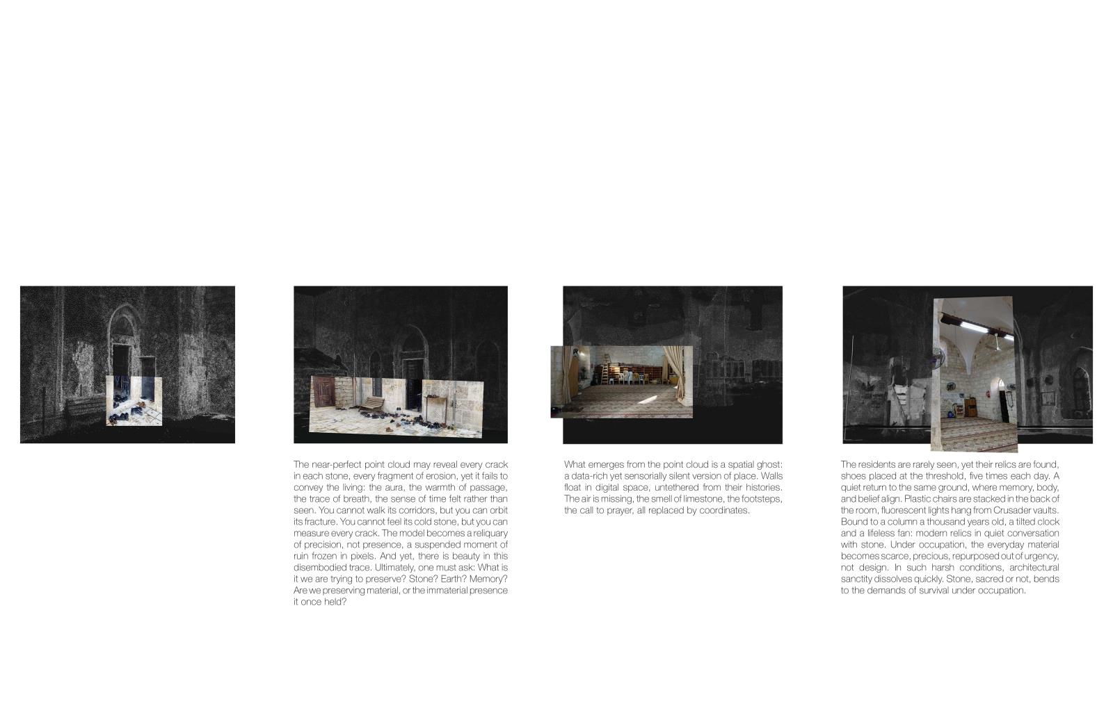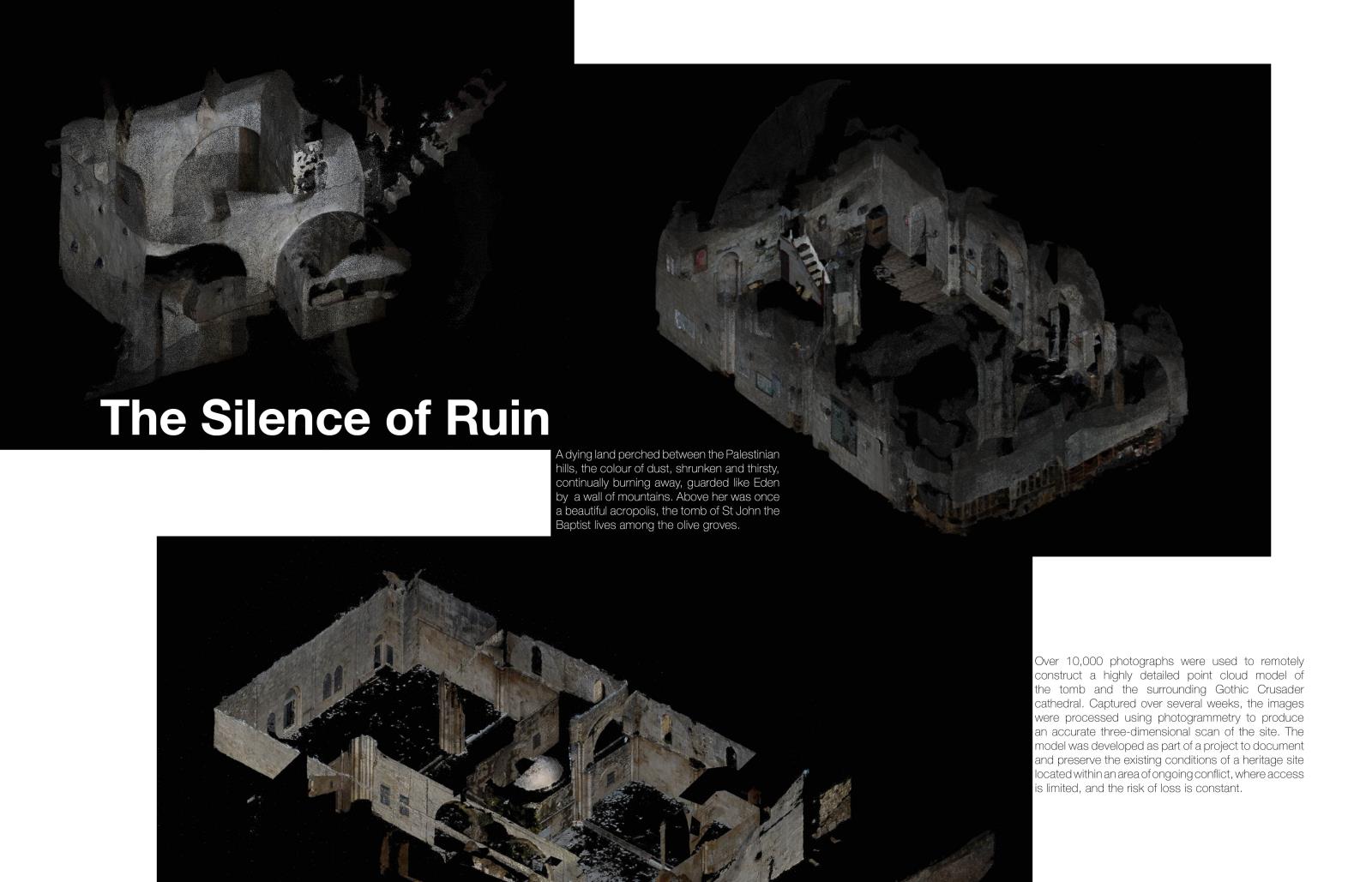 Silence of Ruin Part 2 Project 2025 Zaid Jabiri University of Cambridge | UK The tomb of St. John in Sebastia, Palestine, sits in a landscape full of history but still fragile. Once the biblical capital of Samaria, Sebastia was home to kings, saints, and empires. Now, only traces remain, fallen columns, stacked chapels, and ruins that have been buried, reused, or left to decay over time. Unable to access the site in person, the project relied on improvised methods. Over 10,000 manually adjusted photographs were used to reconstruct the site through light and angle. From this dataset, point cloud models were generated, creating a digital image of space, a cm accurate tool of precision.At the heart of the intervention is a suspended steel floor that records the footsteps of visitors, preserving not architecture, but traces of use and life. A curtain-draped chapel hovers gently over stone ruins, like a liturgical veil. Nearby, a quiet guest cabin sits within a garden, awaiting visitors. Together, these gestures propose a form of preservation that embraces fragility, ambiguity, and care.This is not a reconstruction of the past, but an architecture of remembrance, one that makes space for absence as much as presence. In a place shaped by erasure and resilience, to have left a trace is enough. Tutor(s) Julia Cabanas Zhuozhang Li