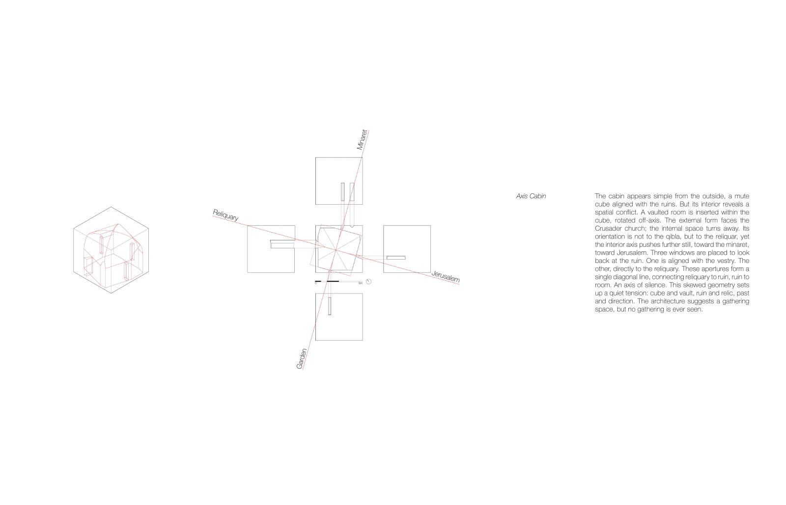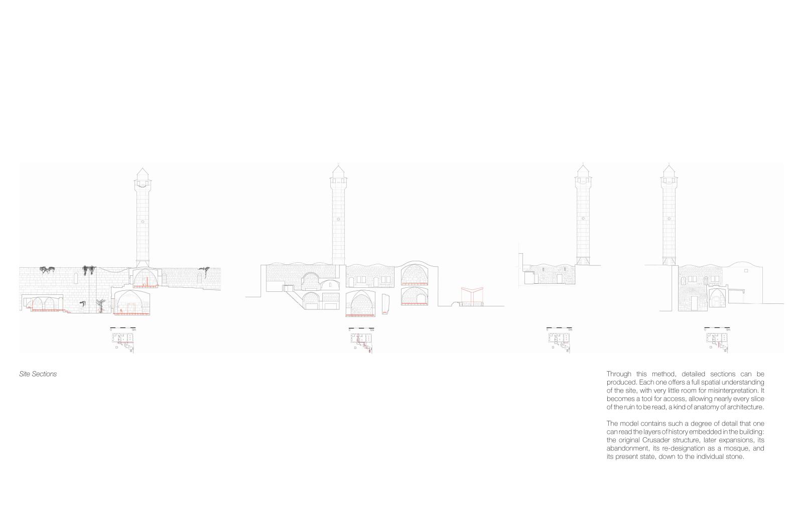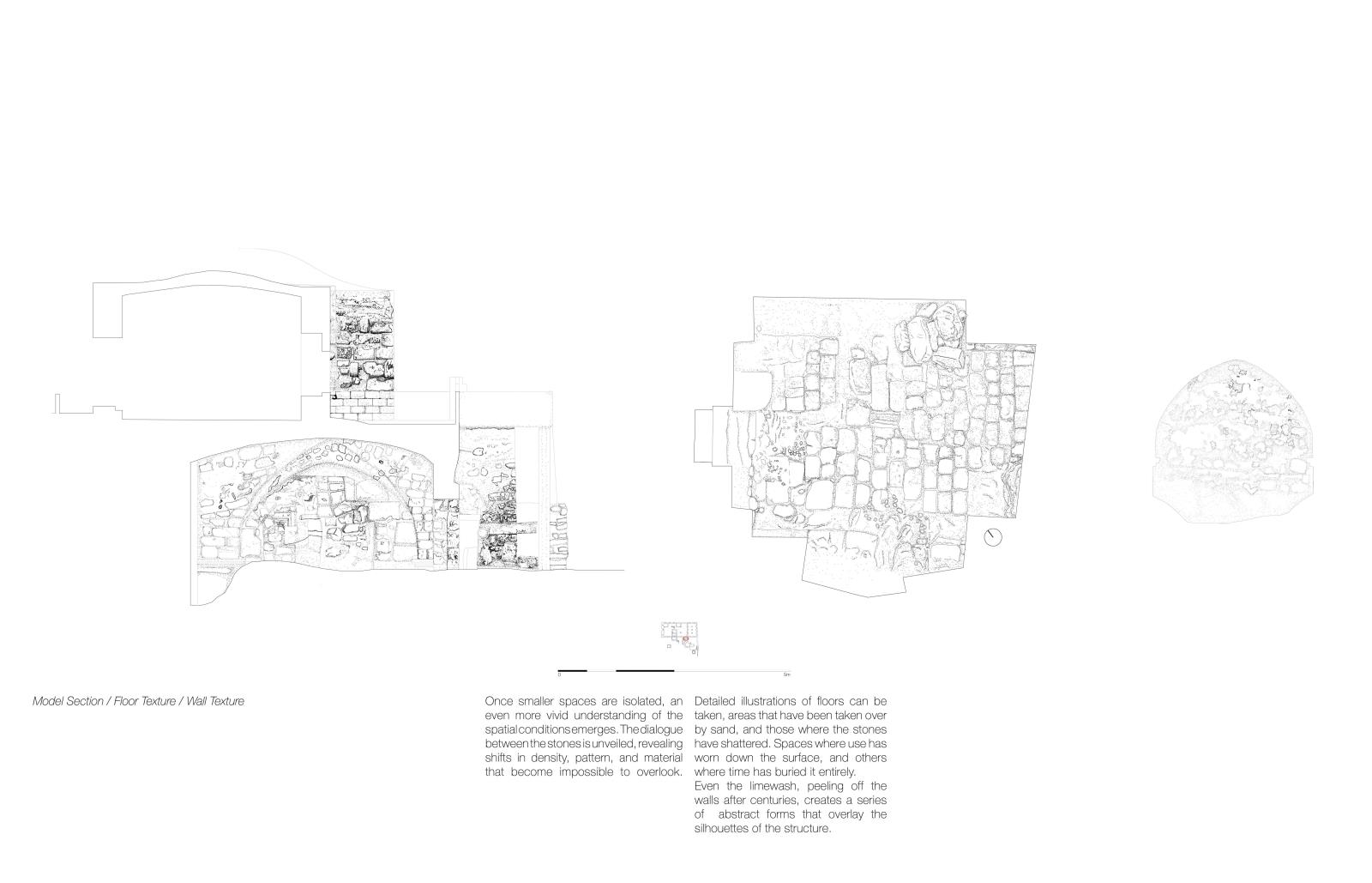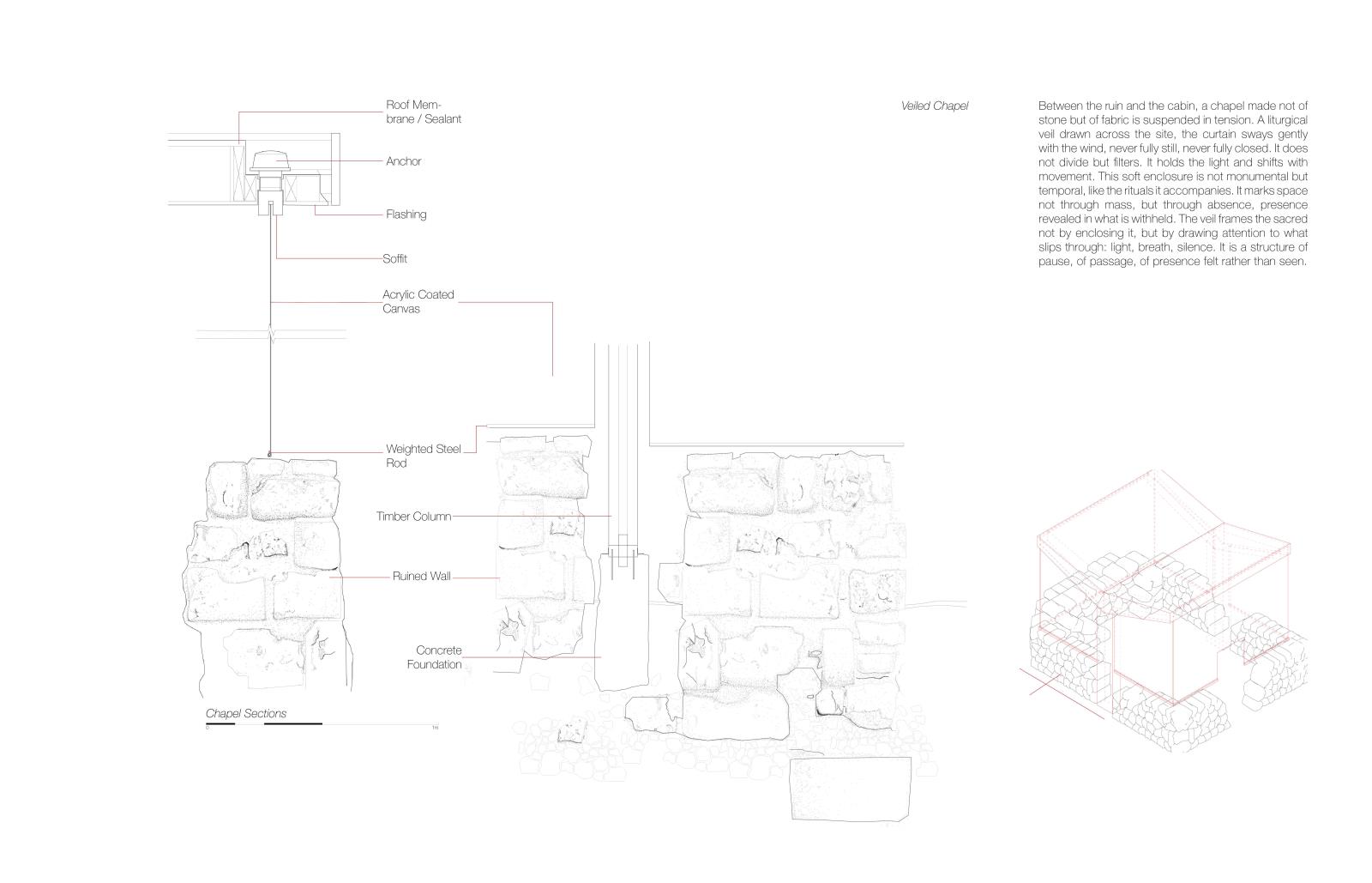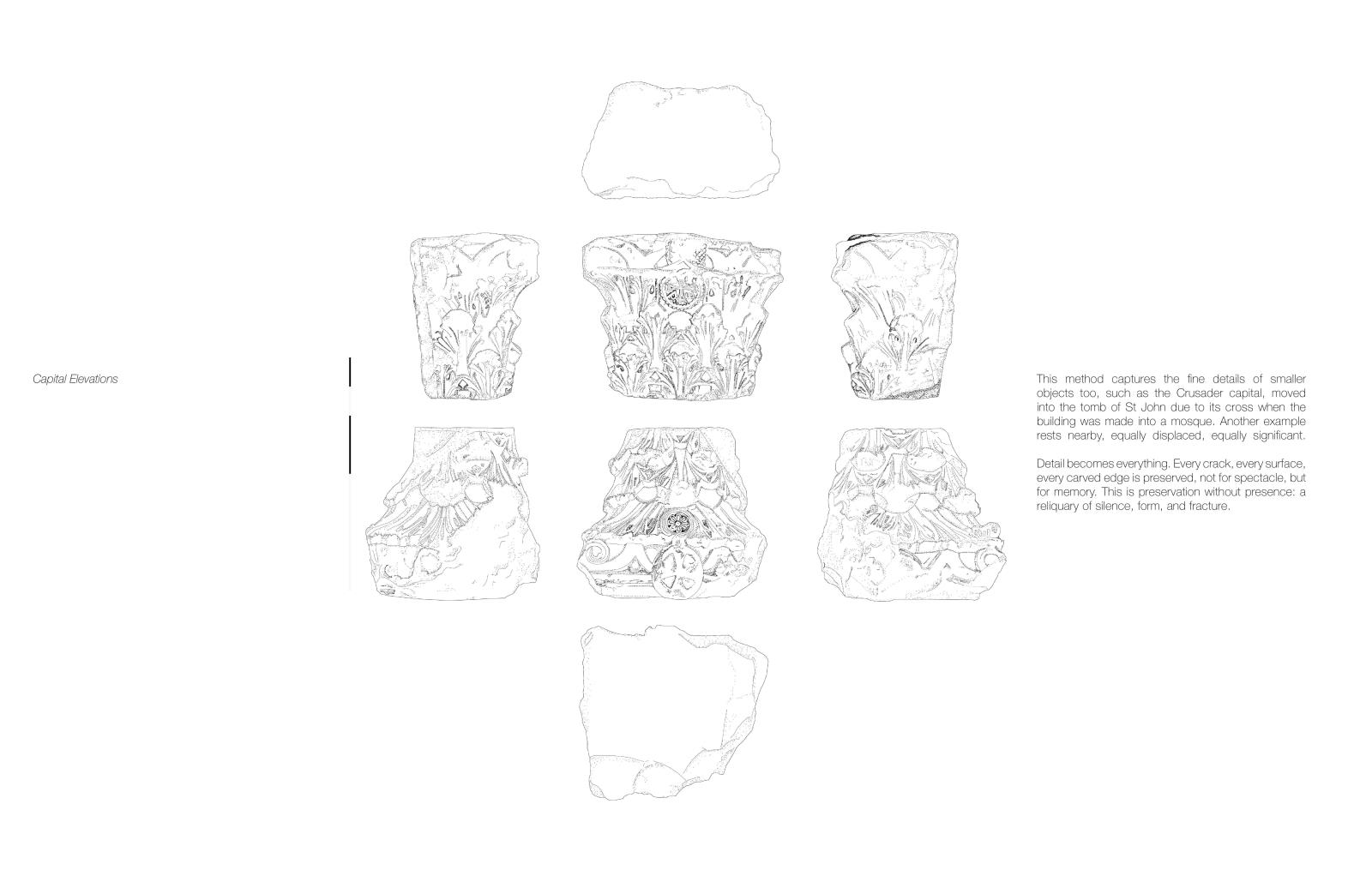 Silence of Ruin Part 2 Project 2025 Zaid Jabiri University of Cambridge | UK The tomb of St. John in Sebastia, Palestine, sits in a landscape full of history but still fragile. Once the biblical capital of Samaria, Sebastia was home to kings, saints, and empires. Now, only traces remain, fallen columns, stacked chapels, and ruins that have been buried, reused, or left to decay over time. Unable to access the site in person, the project relied on improvised methods. Over 10,000 manually adjusted photographs were used to reconstruct the site through light and angle. From this dataset, point cloud models were generated, creating a digital image of space, a cm accurate tool of precision.At the heart of the intervention is a suspended steel floor that records the footsteps of visitors, preserving not architecture, but traces of use and life. A curtain-draped chapel hovers gently over stone ruins, like a liturgical veil. Nearby, a quiet guest cabin sits within a garden, awaiting visitors. Together, these gestures propose a form of preservation that embraces fragility, ambiguity, and care.This is not a reconstruction of the past, but an architecture of remembrance, one that makes space for absence as much as presence. In a place shaped by erasure and resilience, to have left a trace is enough. Tutor(s) Julia Cabanas Zhuozhang Li