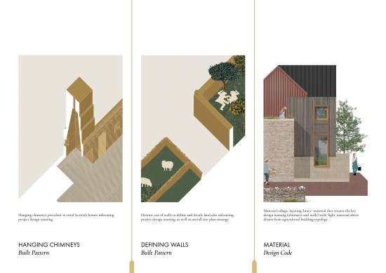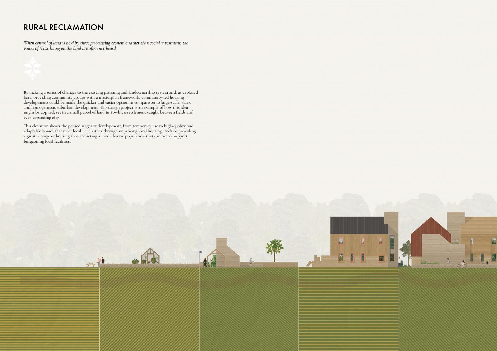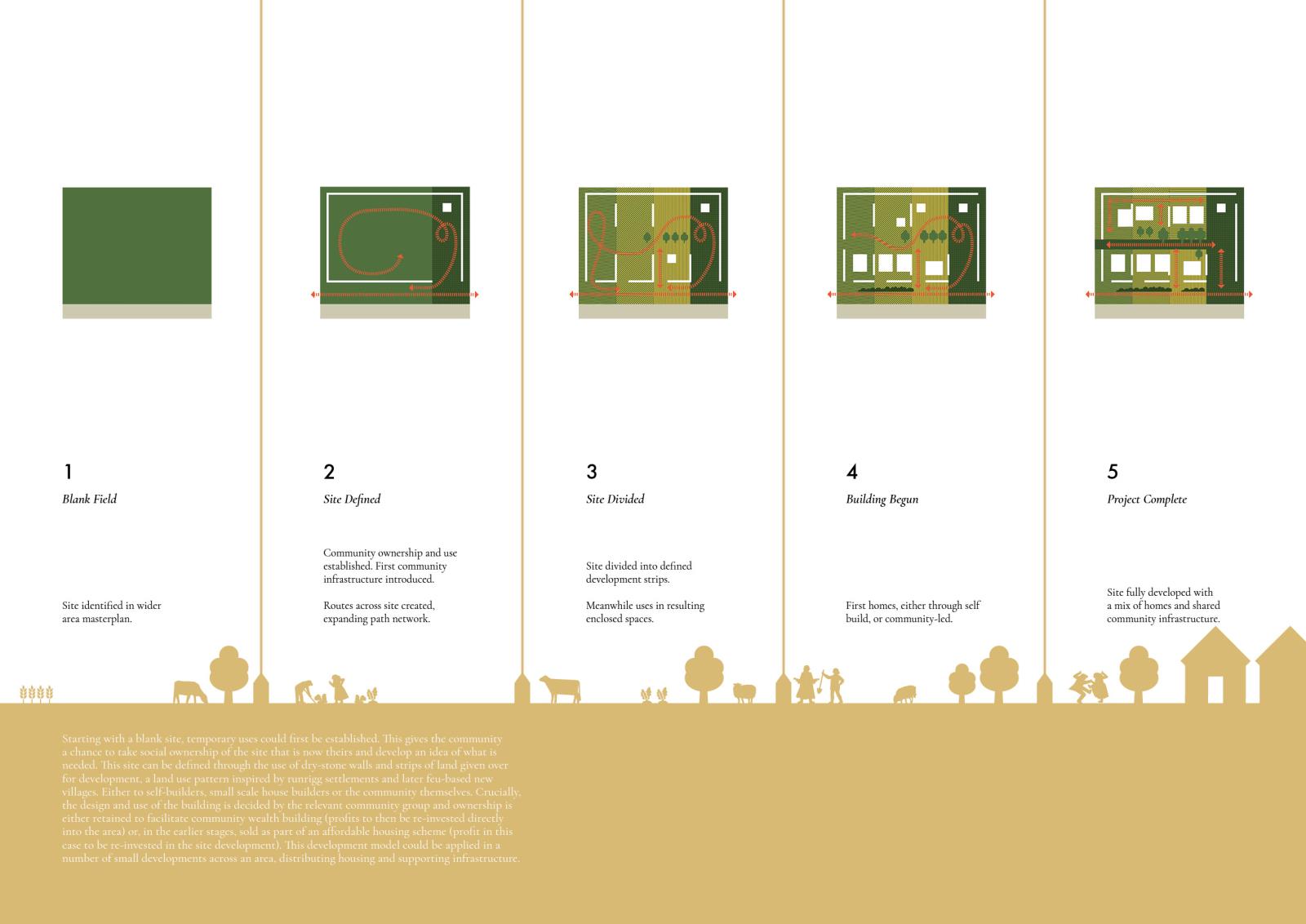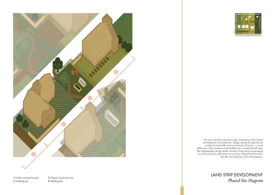 Rural Reclamation Part 2 Project 2025 Jennifer Mitchell University of Dundee | UK When control of land is held by those prioritising economic rather than social investment, the voices of those living on the land are often not heard. Considering the concentrated nature of landownership in Scotland, it is inevitable that most recent development does not understand nor meet local need. This project looks to an alternative design and delivery method of providing housing in the accessible rural area, the fastest growing area in Scotland.Understanding is drawn from historic and immediately contemporary sources, combining land-use and ownership patterns lost to the agricultural revolution with present-day community led housing projects.The goal is to suggest a development framework, supported by changes to our current outdated planning and landownership systems, that places control of development in the hands of people who live there, which would lead to a more diverse and sustainable development when compared to the present spread of homogenous suburbs. The latter responding neither to the physical, social or economic landscape yet are prevalent due to systems or landownership and planning that favour those with power, as they have done since first formation. Tutor(s) Carol Robertson