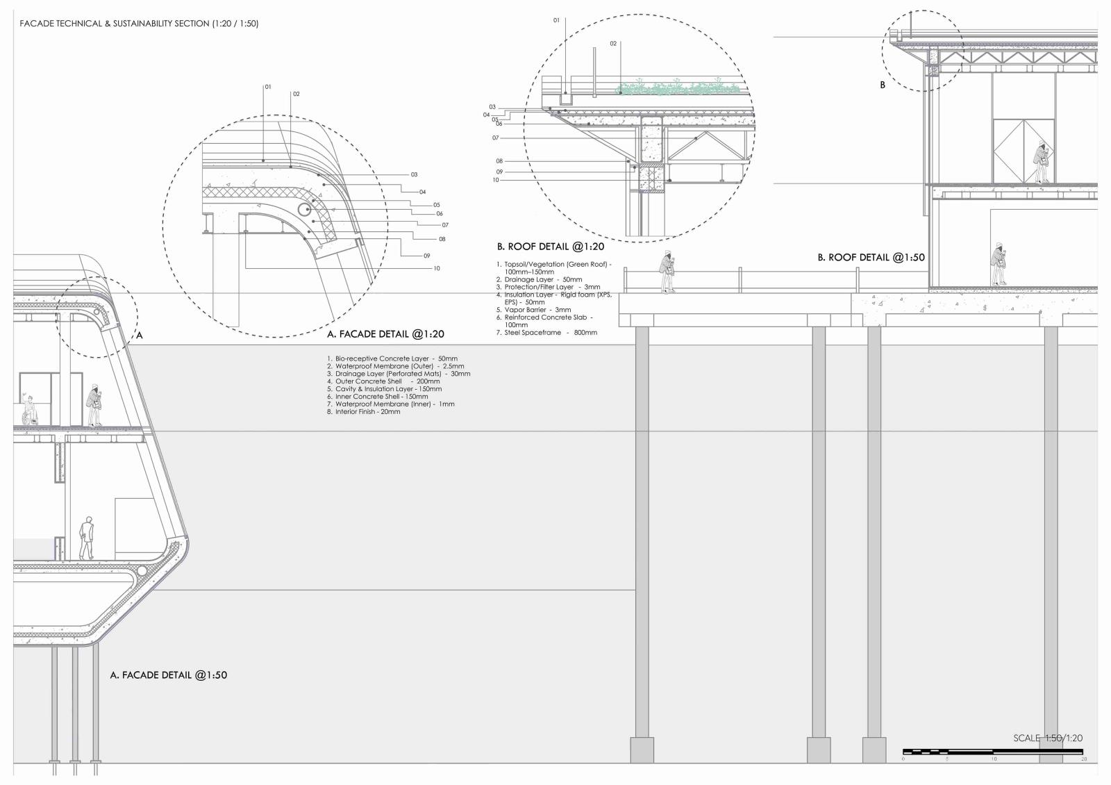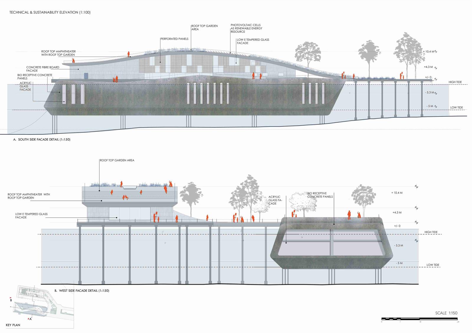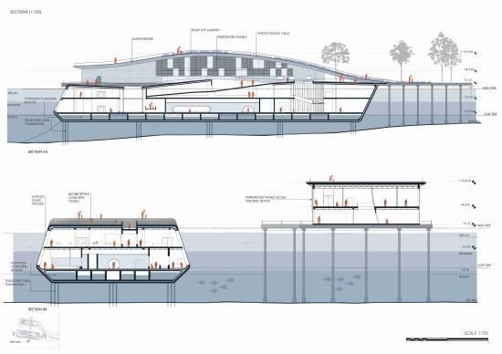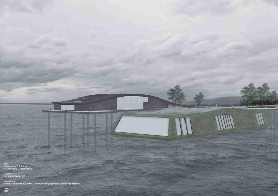 The proposal's focal point is a Marine Conservation Centre, a hybrid structure that adapts to the region's harsh tides by floating and submerging. Repurposed elements from the Tata Steel site were employed in its design, which incorporates educational facilities, public engagement areas, and marine rehabilitation labs. Technical issues like water filtration systems, buoyant construction, and passive design appropriate for its changing environment are also addressed in the building.